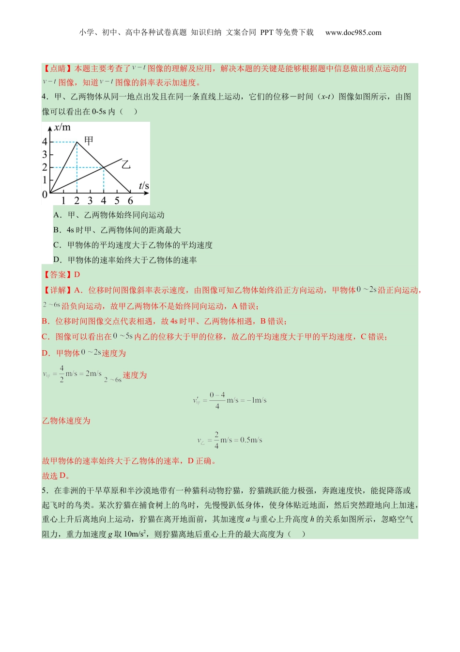 小学、初中、高中各种试卷真题知识归纳文案合同PPT等免费下载www.doc985.com第一章运动的描述匀变速直线运动的研究质量监测试卷本卷分第试Ι卷()和第Ⅱ(非)部分。分:选择题选择题两满100分;考:试时间75分钟注意事项:1.答题前,考生先将自己的姓名.班级.座号.准考证号填写在答题卡上。2.答选择题时,必须使用2B铅笔填涂;答非选择题时,必须使用0.5毫米的黑色签字笔书写;必须在题号对应的答题区域内作答,超出答题区域书写无效;保持答卷清洁.完整。3.考试结束后,将答题卡交回(试题卷自己保存,以备评讲)。第I卷(选择题,共43分)一、单项选择题:(本题共7小题,每小题4分,共28分.在每小题给出的四个选项中,只有一项是符合题目要求)1.骑行是当代年轻人喜欢的一种户外运动,某同学用手机软件记录了某次户外骑行的情况,如图所示,由图可知()A.该同学此次户外骑行的位移是51.01公里B.图中“03:29:38”指的是时刻C.图中的“平均速度”指的是骑行路程与所用时间之比D.该同学此次户外骑行的最快速度为29.88m/s【答案】C【详解】A.该同学此次户外骑行的路程是51.01公里,故A错误;B.图中“03:29:38”指的是时间间隔,故B错误;C.图中的“平均速度”指的物理学中的平均速率,是骑行路程与所用时间之比,故C正确;D.该同学此次户外骑行的最快速度为29.88km/h,故D错误。故选C。2.为满足旅客乘坐高铁出行的不同需要,城际高铁开通了“一站直达”列车和“站站停”列车两种班次。假设两城高铁站之间均匀分布了4个车站,若列车在进站和出站过程中做匀变速直线运动,加速度大小均小学、初中、高中各种试卷真题知识归纳文案合同PPT等免费下载www.doc985.com为2m/s2,其余行驶时间内保持最高时速288km/h匀速运动,“站站停”列车在每个车站停车时间均为t0=2min,则一站直达列车比“站站停”列车节省的时间为()A.10min40sB.11min20sC.13min20sD.14min40s【答案】A【详解】由题可知,列车加速到速度最大所用的时间为列车进站加速与出站减速时的加速度相等,故设一站直达列车匀速行驶用时为t,“站站停”列车匀速行驶用时t′,根据题意可知一站直达列车比“站站停”列车节省的时间为联立解得故选A。3.一质点由静止开始做加速度为的匀加速直线运动,经时间t后加速度变为,又经过时间t后加速度再次变为,再经时间t后回到出发点,、的之比为()A.B.C.D.【答案】B【详解】其运动过程的图像如图所示由于图像的斜率表示物体加速度,图像的面积表示物体的位移,则加速度大小分别为,整理有故选B。小学、初中、高中各种试卷真题知识归纳文案合同PPT等免费下载www.doc985.com【点睛】本题主要考查了图像的理解及应用,解决本题的关键是能够根据题中信息做出质点运动的图像,知道图像的斜率表示加速度。4.甲、乙两物体从同一地点出发且在同一条直线上运动,它们的位移-时间(x-t)图像如图所示,由图像可以看出在0-5s内()A.甲、乙两物体始终同向运动B.4s时甲、乙两物体间的距离最大C.甲物体的平均速度大于乙物体的平均速度D.甲物体的速率始终大于乙物体的速率【答案】D【详解】A.位移时间图像斜率表示速度,由图像可知乙物体始终沿正方向运动,甲物体沿正向运动,沿负向运动,故甲乙两物体不是始终同向运动,A错误;B.位移时间图像交点代表相遇,故4s时甲、乙两物体相遇,B错误;C.图像可以看出在内乙的位移大于甲的位移,故乙的平均速度大于甲的平均速度,C错误;D.甲物体速度为速度为乙物体速度为故甲物体的速率始终大于乙物体的速率,D正确。故选D。5.在非洲的干旱草原和半沙漠地带有一种猫科动物狞猫,狞猫跳跃能力极强,奔跑速度快,能捉降落或起飞时的鸟类。某次狞猫在捕食树上的鸟时,先慢慢趴低身体,使身体贴近地面,然后突然蹬地向上加速,重心上升后离地向上运动,狞猫在离开地面前,其加速度a与重心上升高度h的关系如图所示,忽略空气阻力,重力加速度g取10m/s2,则狞猫离地后重心上升的最大高度为()小学、初中、高中各种试卷真题知识归纳文案合同PPT等免费下载www.doc985.comA.1.5mB.3mC.4.5mD.6m【答案】B【详解】根据题...
