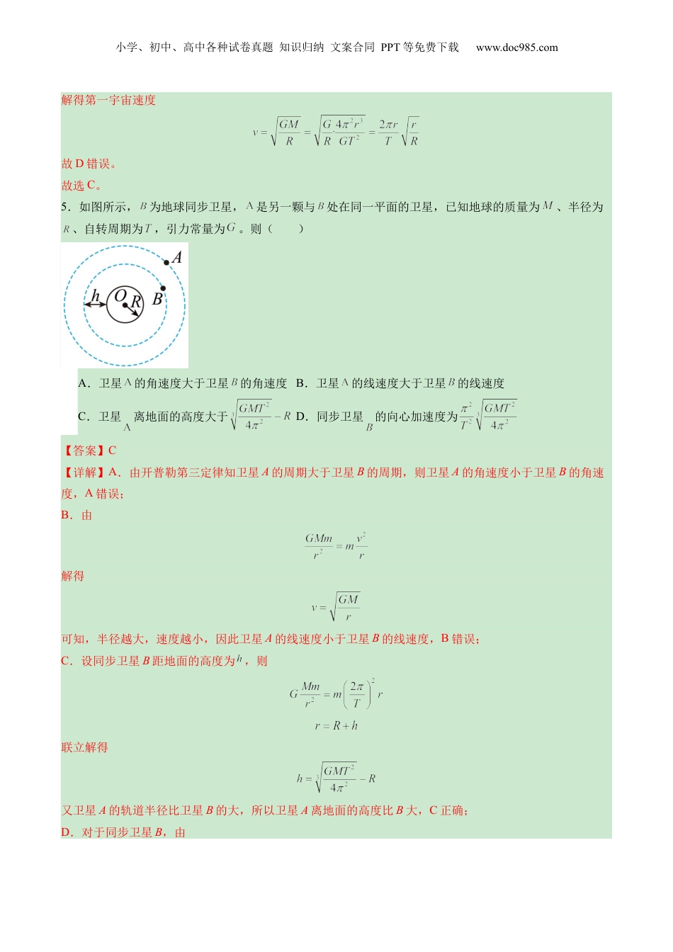 小学、初中、高中各种试卷真题知识归纳文案合同PPT等免费下载www.doc985.com第五章万有引力与航天质量监测试卷本卷分第试Ι卷()和第Ⅱ(非)部分。分:选择题选择题两满100分;考:试时间75分钟注意事项:1.答题前,考生先将自己的姓名.班级.座号.准考证号填写在答题卡上。2.答选择题时,必须使用2B铅笔填涂;答非选择题时,必须使用0.5毫米的黑色签字笔书写;必须在题号对应的答题区域内作答,超出答题区域书写无效;保持答卷清洁.完整。3.考试结束后,将答题卡交回(试题卷自己保存,以备评讲)。第I卷(选择题,共43分)一、单项选择题:(本题共7小题,每小题4分,共28分.在每小题给出的四个选项中,只有一项是符合题目要求)1.木星有4颗卫星是伽利略发现的,称为伽利略卫星,其中两颗卫星绕木星做圆周运动的周期之比为1:4,则这两颗卫星的轨道半径之比为()A.B.C.D.【答案】D【详解】卫星绕木星做圆周运动,根据开普勒第三定律有解得故选D。2.通过思想实验与数学推导,证明月球受到的引力与地面上的重力是同一性质的力的科学家是()A.哥白尼B.第谷C.牛顿D.开普勒【答案】C【详解】通过思想实验与数学推导,证明月球受到的引力与地面上的重力是同一性质的力的科学家是牛顿。故选C。3.“神舟十一号”飞船于2016年10月17日发射,对接“天宫二号”。若飞船质量为m,距地面高度为h,地球质量为M,半径为R,引力常量为G,则飞船所在处的重力加速度大小为()A.0B.C.D.【答案】B【详解】飞船质量为m,在距地面高度为h的地方,由地球的引力等于重力可得小学、初中、高中各种试卷真题知识归纳文案合同PPT等免费下载www.doc985.com解得飞船所在处的重力加速度大小为ACD错误,B正确。故选B。4.2020年11月24日我国发射的“嫦娥五号”卫星进入环月轨道,若卫星绕月做匀速圆周运动的轨道半径为r,周期为T。已知月球的半径为R,引力常量为G,则()A.月球的质量为B.月球的平均密度为C.月球表面的重力加速度为D.月球的第一宇宙速度为【答案】C【详解】A.根据万有引力提供向心力,则有解得故A错误;B.根据解得故B错误;C.在月球表面,有解得故C正确;D.根据公式小学、初中、高中各种试卷真题知识归纳文案合同PPT等免费下载www.doc985.com解得第一宇宙速度故D错误。故选C。5.如图所示,为地球同步卫星,是另一颗与处在同一平面的卫星,已知地球的质量为、半径为、自转周期为,引力常量为。则()A.卫星的角速度大于卫星的角速度B.卫星的线速度大于卫星的线速度C.卫星离地面的高度大于D.同步卫星的向心加速度为【答案】C【详解】A.由开普勒第三定律知卫星A的周期大于卫星B的周期,则卫星A的角速度小于卫星B的角速度,A错误;B.由解得可知,半径越大,速度越小,因此卫星A的线速度小于卫星B的线速度,B错误;C.设同步卫星B距地面的高度为,则联立解得又卫星A的轨道半径比卫星B的大,所以卫星A离地面的高度比B大,C正确;D.对于同步卫星B,由小学、初中、高中各种试卷真题知识归纳文案合同PPT等免费下载www.doc985.com联立解得D错误。故选C。6.中国新闻网宣布:在摩洛哥坠落的陨石被证实来自火星。某同学想根据平时收集的部分火星资料(如图所示)计算出火星的密度,再与这颗陨石的密度进行比较。下列计算火星密度的公式错误的是(引力常量G已知,忽略火星自转的影响)()火星-Mars火星的小档案直径d=6779km质量M=6.4171×1023kg表面的重力加速度g0=3.7m/s2近地卫星的周期T=3.4hA.B.C.D.【答案】B【详解】设近地卫星的质量为,火星的质量为,对近地卫星,火星的万有引力提供其做匀速圆周运动的向心力,则有可得可得火星的密度为将代入上式可得小学、初中、高中各种试卷真题知识归纳文案合同PPT等免费下载www.doc985.com又火星对近地卫星的万有引力近似等于近地卫星的重力,则有解得因此火星的密度为故ACD正确,B错误。此题选择错误选项,故选B。7.洛希极限是指在双星系统中,两个天体之间的最近距离。如果两个天体之间的距离小于洛希极限,则质量较小的天体就会在质量较大的天体引力下被撕碎。洛希极限的计算公式为:,其中,r为洛希极限,M...