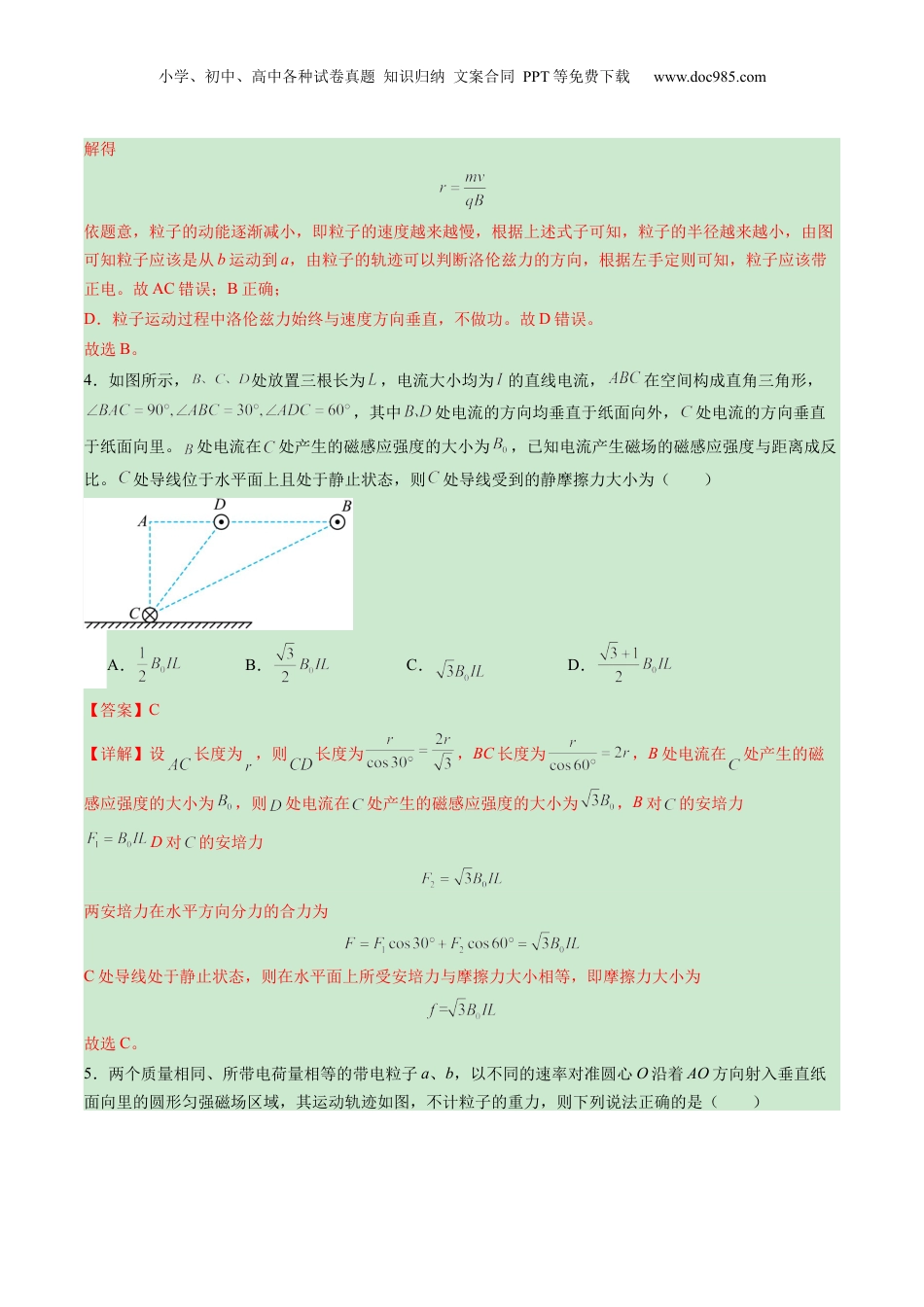 小学、初中、高中各种试卷真题知识归纳文案合同PPT等免费下载www.doc985.com第十一章磁场质量监测试卷本卷分第试Ι卷()和第Ⅱ(非)部分。分:选择题选择题两满100分;考:试时间75分钟注意事项:1.答题前,考生先将自己的姓名.班级.座号.准考证号填写在答题卡上。2.答选择题时,必须使用2B铅笔填涂;答非选择题时,必须使用0.5毫米的黑色签字笔书写;必须在题号对应的答题区域内作答,超出答题区域书写无效;保持答卷清洁.完整。3.考试结束后,将答题卡交回(试题卷自己保存,以备评讲)。第I卷(选择题,共43分)一、单项选择题:(本题共7小题,每小题4分,共28分.在每小题给出的四个选项中,只有一项是符合题目要求)1.安培对物质具有磁性的解释可以用如图所示的情景来表示,那么()A.甲图代表了被磁化的铁棒的内部情况B.乙图代表了被磁化的铁棒的内部情况C.磁体在常温环境与高温环境下磁性强弱相同D.磁体在高温环境下磁性会加强【答案】B【详解】A.根据“分子电流”的假说,未被磁化的物体,分子电流的方向非常紊乱,对外不显磁性,故A错误;B.根据“分子电流”的假说,被磁化的物体,分子电流的方向大致相同,于是对外界显示出磁性,故B正确;CD.根据磁化与退磁的特性可知,磁体在高温环境下磁性会减弱,故CD错误。故选B。2.如图所示,两根长直导线a、b垂直放置,彼此绝缘,分别通有大小相同电流。固定的刚性正方形线圈MNPQ通有电流I,MN到a的距离与MQ到b的距离相等,线圈与导线位于同一平面内。已知通电长直导线在其周围某点所产生的磁感应强度大小,与该点到长直导线的距离成反比;线圈所受安培力的大小为F。若移走导线a,则此时线圈所受的安培力大小为()小学、初中、高中各种试卷真题知识归纳文案合同PPT等免费下载www.doc985.comA.,方向向左B.,方向向右C.,方向向左D.,方向向右【答案】A【详解】根据左手定则和右手螺旋定则,结合磁感应强度的叠加可得,线圈左右两侧受到的安培力合力方向水平向左,上下受到的安培力合力方向竖直向上,大小都为,合力大小为故撤去导线a,则此时线圈所受的安培力为水平向左,大小为故选A。3.为研究一些微观带电粒子的成分,通常先利用加速电场将带电粒子加速,然后使带电粒子进入位于匀强磁场中的云室内。若某带电粒子的运动方向与磁场方向垂直,其运动轨迹如图所示,已知此带电粒子在运动过程中质量和电荷量保持不变,但动能逐渐减少,不计重力,下列说法中正确的是()A.粒子从a到b,带正电B.粒子从b到a,带正电C.粒子从b到a,带负电D.粒子运动过程中洛伦兹力对它做负功【答案】B【详解】ABC.带电粒子在电场中做圆周运动,有小学、初中、高中各种试卷真题知识归纳文案合同PPT等免费下载www.doc985.com解得依题意,粒子的动能逐渐减小,即粒子的速度越来越慢,根据上述式子可知,粒子的半径越来越小,由图可知粒子应该是从b运动到a,由粒子的轨迹可以判断洛伦兹力的方向,根据左手定则可知,粒子应该带正电。故AC错误;B正确;D.粒子运动过程中洛伦兹力始终与速度方向垂直,不做功。故D错误。故选B。4.如图所示,处放置三根长为,电流大小均为的直线电流,在空间构成直角三角形,,其中处电流的方向均垂直于纸面向外,处电流的方向垂直于纸面向里。处电流在处产生的磁感应强度的大小为,已知电流产生磁场的磁感应强度与距离成反比。处导线位于水平面上且处于静止状态,则处导线受到的静摩擦力大小为()A.B.C.D.【答案】C【详解】设长度为,则长度为,BC长度为,B处电流在处产生的磁感应强度的大小为,则处电流在处产生的磁感应强度的大小为,B对的安培力D对的安培力两安培力在水平方向分力的合力为C处导线处于静止状态,则在水平面上所受安培力与摩擦力大小相等,即摩擦力大小为故选C。5.两个质量相同、所带电荷量相等的带电粒子a、b,以不同的速率对准圆心O沿着AO方向射入垂直纸面向里的圆形匀强磁场区域,其运动轨迹如图,不计粒子的重力,则下列说法正确的是()小学、初中、高中各种试卷真题知识归纳文案合同PPT等免费下载www.doc985.comA.a粒子带正电,b粒子带负电B.b粒子动能较大C....