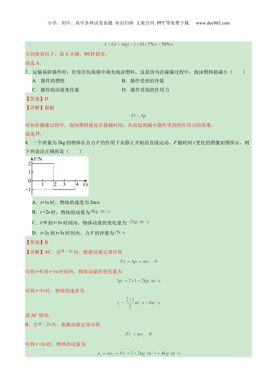 小学、初中、高中各种试卷真题知识归纳文案合同PPT等免费下载www.doc985.com第七章动量守恒定律质量监测试卷本卷分第试Ι卷()和第Ⅱ(非)部分。分:选择题选择题两满100分;考:试时间75分钟注意事项:1.答题前,考生先将自己的姓名.班级.座号.准考证号填写在答题卡上。2.答选择题时,必须使用2B铅笔填涂;答非选择题时,必须使用0.5毫米的黑色签字笔书写;必须在题号对应的答题区域内作答,超出答题区域书写无效;保持答卷清洁.完整。3.考试结束后,将答题卡交回(试题卷自己保存,以备评讲)。第I卷(选择题,共43分)一、单项选择题:(本题共7小题,每小题4分,共28分.在每小题给出的四个选项中,只有一项是符合题目要求)1.甲、乙两人静止在光滑的冰面上,甲推乙后,两人向相反方向滑去。若甲的质量大于乙的质量,则()A.甲推乙的过程中,甲对乙的作用力大于乙对甲的作用力B.甲推乙的过程中,甲对乙的冲量小于乙对甲的冲量C.分开后,甲的动量大于乙的动量D.分开后,甲的动能小于乙的动能【答案】D【详解】A.根据牛顿第三定律可知,甲推乙的过程中,甲对乙的作用力等于乙对甲的作用力,故A错误;BC.甲推乙的过程中,甲乙二人组成的系统在二者相互作用过程中不受外力,满足系统动量守恒条件,故甲对乙的冲量与乙对甲的冲量等大反向,故分开后,甲的动量等于乙的动量,故BC错误;D.根据可知动量大小相等,而甲的质量大于乙的质量,故甲的动能小于乙的动能,故D正确。故选D。2.西安古城墙上有一块砖的质量,取重力加速度大小,则经时间,重力对该砖的冲量()A.大小为B.方向垂直向下C.方向竖直向上D.大小为【答案】A【详解】重力对对该砖的冲量小学、初中、高中各种试卷真题知识归纳文案合同PPT等免费下载www.doc985.com方向竖直向下。故A正确,BCD错误。故选A。3.运输易碎器件时,经常在包装箱中填充泡沫塑料,这是因为在碰撞过程中,泡沫塑料能减小()A.器件的惯性B.器件受到的冲量C.器件的动量变化量D.器件受到的作用力【答案】D【详解】根据可知在碰撞过程中,泡沫塑料能延长接触时间,从而起到减小器件受到的作用力的效果。故选D。4.一个质量为2kg的物体在合力F的作用下从静止开始沿直线运动,F随时间t变化的图像如图所示。则下列说法正确的是()A.t=1s时,物体的速度为2m/sB.t=2s时,物体的动量为C.t=0到t=1s时间内,物体动量的变化量为D.t=2s到t=3s时间内,力F的冲量为【答案】B【详解】AC.在内,根据动量定理可得可得t=0到t=1s时间内,物体动量的变化量为可得t=1s时,物体的速度为故AC错误;B.在内,根据动量定理可得可得t=2s时,物体的动量为小学、初中、高中各种试卷真题知识归纳文案合同PPT等免费下载www.doc985.com故B正确;D.t=2s到t=3s时间内,力F的冲量为故D错误。故选B。5.如图所示,斜面体放在光滑水平地面上,其光滑斜面上有一物体由静止开始沿斜面下滑。在物体下滑过程中,物体和斜面体组成的系统()A.机械能守恒,动量不守恒B.机械能与动量均不守恒C.机械能与动量均守恒D.机械能不守恒,动量守恒【答案】A【详解】在物体下滑过程中,只有重力做功,物体和斜面体组成的系统机械能守恒,物体和斜面体组成的系统所受合外力不为零,动量不守恒。故选A。6.甲、乙两滑块的质量分别为2m和m,它们以相同的速率v在光滑水平面上相向运动并发生碰撞。若碰撞后两滑块黏合在一起,则碰撞过程中系统损失的机械能为()A.B.C.D.【答案】A【详解】碰撞前后动量守恒,则解得碰撞过程中系统损失的机械能为故选A。7.皮划艇射击是一种比赛运动,比赛时,运动员站在静止的皮划艇上,持枪向岸上的枪靶水平射击。已知运动员(包括除子弹外的装备)及皮划艇的总质量为M,子弹的质量为m,假设子弹射击过程中火药释放的总能量为E,且全部转化为动能,在陆地射击和在皮划艇上射击时子弹出射速度会有少许差异。陆地射击时子弹的射出速度为v1,子弹动能为;在皮划艇上射击时子弹的出射速度为v2,动能为,运动员及皮划艇的速度为v3,射击过程中可认为子弹、运动员及皮划艇组成的系统在水平方向动量守恒。下列小学、初中、高中各种试卷...