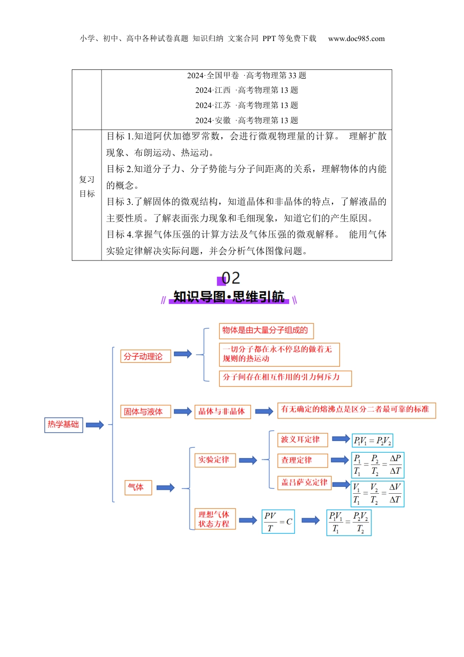 小学、初中、高中各种试卷真题知识归纳文案合同PPT等免费下载www.doc985.com第63讲热学基础目录01、考情透视,目标导航02、知识导图,思维引航.............................................................................................203、考点突破,考法探究.............................................................................................3考点一.分子动理论..................................................................................................3知识点一、分子动理论的内容.........................................................................3知识点二、温度与物体的内能.........................................................................4考向1.微观量的估算.........................................................................................4考向2.布朗运动与分子热运动.........................................................................6考向3.分子力、分子势能与物体的内能.........................................................7考点二.固体、液体和气体的性质..........................................................................9知识点一、固体和液体.....................................................................................9知识点二、气体...............................................................................................10考向1.固体、液体性质的理解.......................................................................11考向2气体压强的计算及微观解释............................................................12考向3气体分子的运动特点........................................................................14考点三.气体实验定律和理想气体状态方程........................................................15知识点1.气体实验定律................................................................................15知识点2.理想气体状态方程与气体实验定律的关系...................................15考向1等容变化与等温变化........................................................................15考向2等压变化与等容变化........................................................................16考点四.气体状态变化的图像问题........................................................................17考向1气体的p-V图像................................................................................17考向2气体的V-T图像................................................................................18考向3气体的p-T图像................................................................................18考法4气体的p-图像....................................................................................19考向5气体状态变化图像的转换................................................................1904、真题练习,命题洞见...........................................................................................20考情分析2024·海南·高考物理第5题2024·浙江·高考物理第9题小学、初中、高中各种试卷真题知识归纳文案合同PPT等免费下载www.doc985.com2024·全国甲卷·高考物理第33题2024·江西·高考物理第13题2024·江苏·高考物理第13题2024·安徽·高考物理第13题复习目标目标1.知道阿伏加德罗常数,会进行微观物理量的计算。理解扩散现象、布朗运动、热运动。目标2.知道分子力、分子势能与分子间距离的关系,理解物体的内能的概念。目标3.了解固体的微观结构,知道晶体和非晶体的特点,了解液晶的主要性质。了解表面张力现象和毛细现象,知道它们的产生原因。目标4.掌握气体压强的计算方法及气体压强的微观解释。能用气体实验...
