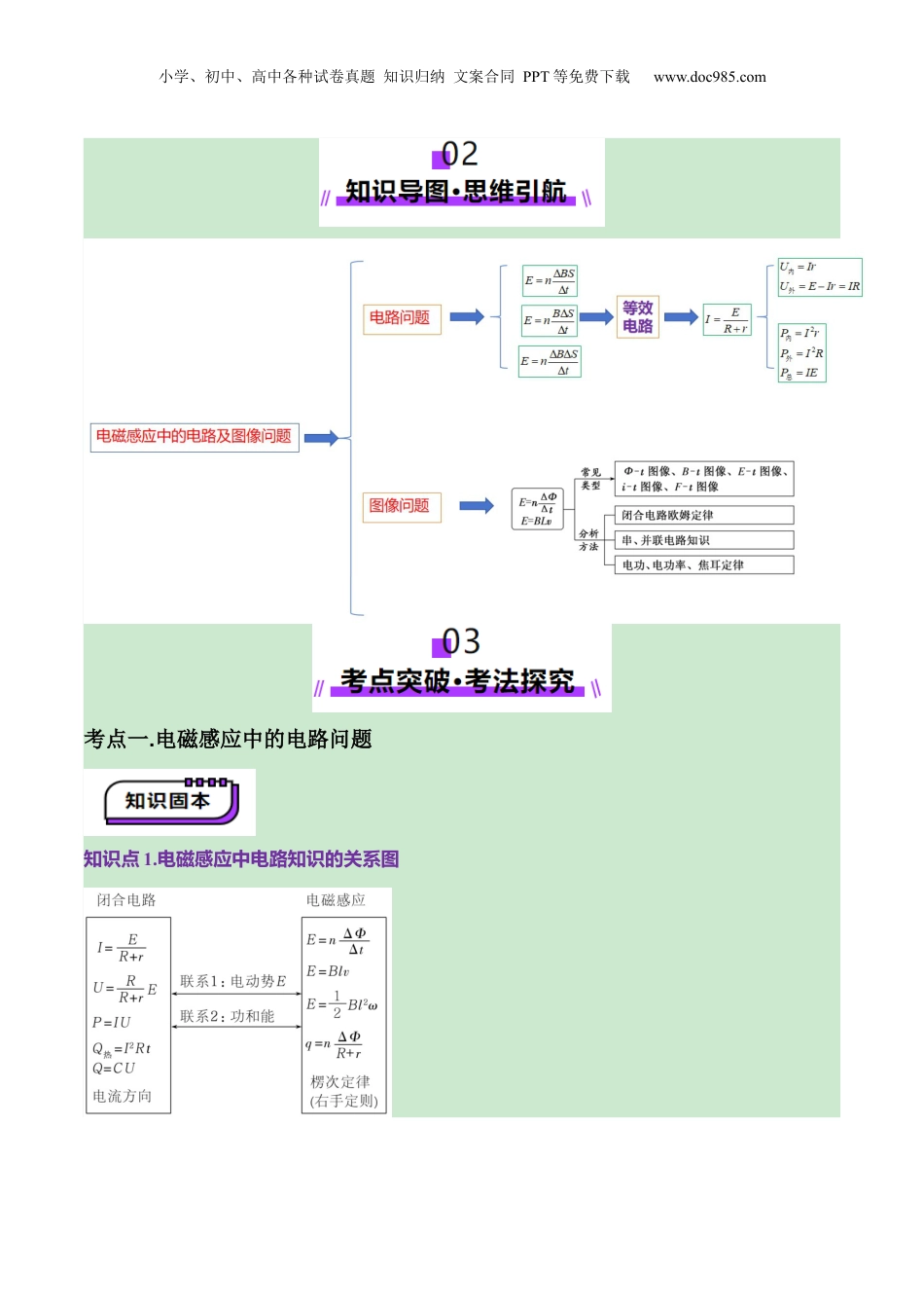 小学、初中、高中各种试卷真题知识归纳文案合同PPT等免费下载www.doc985.com第54讲电磁感应中的电路及图像问题目录01、考情透视,目标导航02、知识导图,思维引航.............................................................................................203、考点突破,考法探究.............................................................................................2考点一.电磁感应中的电路问题..............................................................................2知识点1.电磁感应中电路知识的关系图.........................................................3知识点2.分析电磁感应电路问题的基本思路.................................................3知识点3.电磁感应中电路问题的基本规律.....................................................3考向1导体棒平动切割的电路问题..............................................................3考向2导体棒转动切割的电路问题..............................................................4考向3磁场变化引起的电路问题..................................................................5考点二.电磁感应中电荷量的计算..........................................................................5考点三.电磁感应中的图像问题..............................................................................7知识点1.感生类图像问题.................................................................................7知识点2.动生类图像问题.................................................................................7知识点3.解答图像选择问题的常用方法.........................................................8知识点4.图像分析问题的“四明确·一理解”................................................8考向1.图像选择问题.........................................................................................8考向2.图像分析问题.........................................................................................9考向3.图像转化问题.......................................................................................1004、真题练习,命题洞见...........................................................................................11考情分析2024·浙江6月·高考物理第5题2024·浙江6月·高考物理第18题2024·浙江1月·高考物理第15题2024·湖南·高考物理第4题复习目标目标1.掌握电磁感应电路问题的分析方法。目标2.掌握感应电流、电荷量、路端电压、电功率的计算方法。目标3.会分析电磁感应的图像问题。小学、初中、高中各种试卷真题知识归纳文案合同PPT等免费下载www.doc985.com考点一.电磁感应中的电路问题知识点1.电磁感应中电路知识的关系图小学、初中、高中各种试卷真题知识归纳文案合同PPT等免费下载www.doc985.com知识点2.分析电磁感应电路问题的基本思路知识点3.电磁感应中电路问题的基本规律(1)对电源的理解:在电磁感应现象中,产生感应电动势的那部分导体相当于电源,如切割磁感线的导体棒、有磁通量变化的线圈等。(2)对电路的理解:内电路是切割磁感线的导体棒或磁通量发生变化的线圈;除电源外其余部分是外电路。在外电路中,电流从高电势处流向低电势处,在内电路中,电流则从低电势处流向高电势处。(3)对路端电压的理解:“电源”两端的电压为路端电压,不是电源的感应电动势。考向1导体棒平动切割的电路问题1.(多选)如图所示,分布于全空间的匀强磁场垂直于纸面向里,其磁感应强度大小为B=2T。宽度为L=0.8m的两导轨间接一阻值为R=0.2Ω的电阻,电阻为2R的金属棒AC长为2L并垂直于导轨(导轨电阻不计)放置,A端刚好位于导轨,中点D与另一导轨接触。当金属棒以速度v=0.5m/s向左匀速运动时,下列说法正确的是()A.流过电阻R的电流为2AB.A、D两点的电势差为UAD=0.4VC.A、C两点的电势差为...