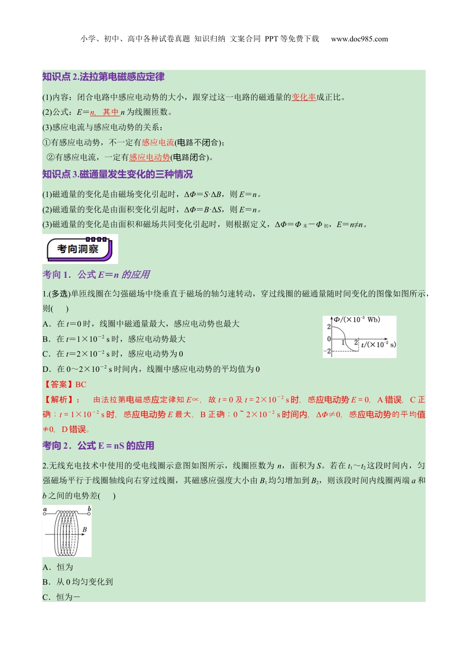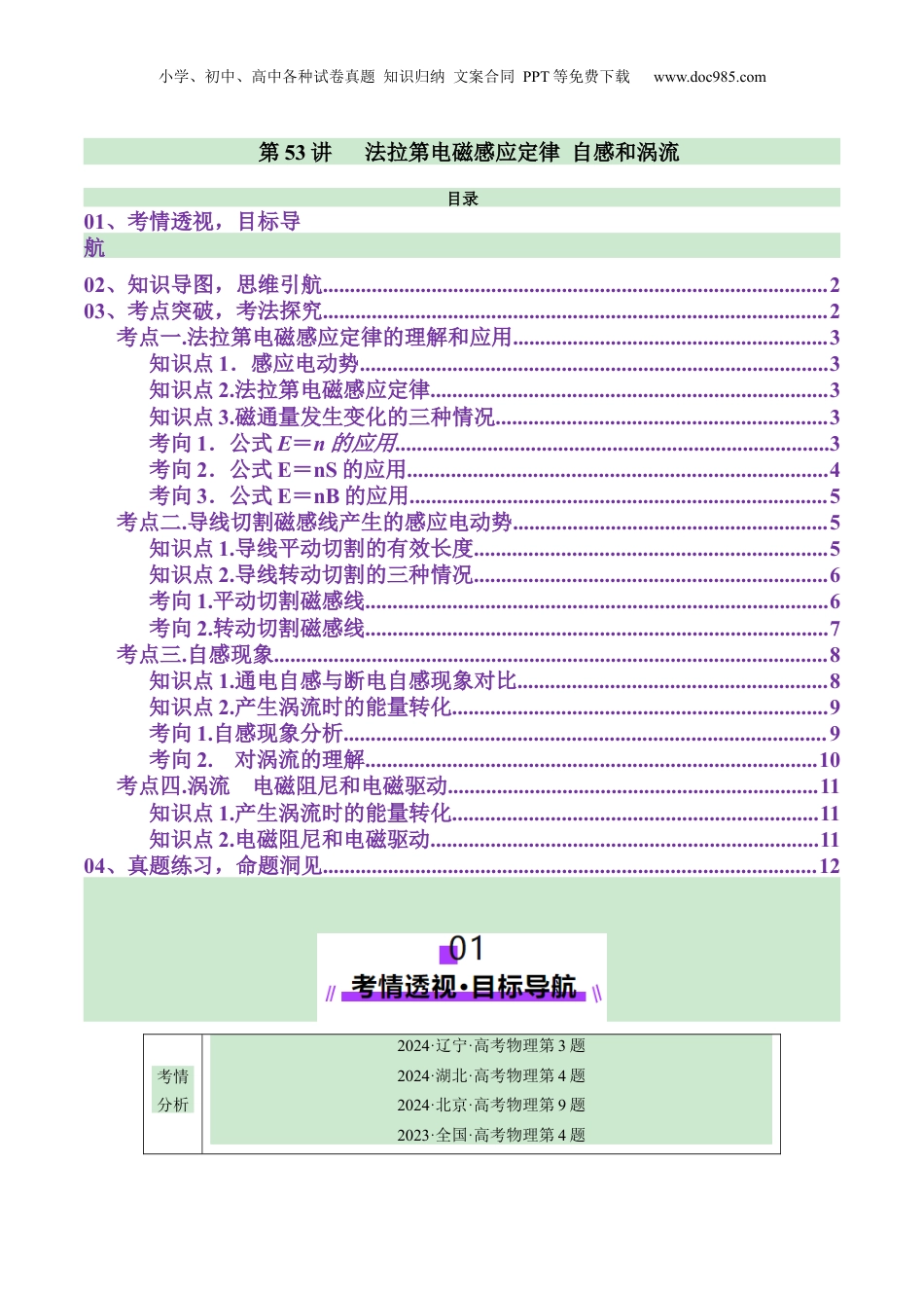 小学、初中、高中各种试卷真题知识归纳文案合同PPT等免费下载www.doc985.com第53讲法拉第电磁感应定律自感和涡流目录01、考情透视,目标导航02、知识导图,思维引航.............................................................................................203、考点突破,考法探究.............................................................................................2考点一.法拉第电磁感应定律的理解和应用..........................................................3知识点1.感应电动势......................................................................................3知识点2.法拉第电磁感应定律.........................................................................3知识点3.磁通量发生变化的三种情况.............................................................3考向1.公式E=n的应用................................................................................3考向2.公式E=nS的应用.............................................................................4考向3.公式E=nB的应用.............................................................................5考点二.导线切割磁感线产生的感应电动势..........................................................5知识点1.导线平动切割的有效长度.................................................................5知识点2.导线转动切割的三种情况.................................................................6考向1.平动切割磁感线.....................................................................................6考向2.转动切割磁感线.....................................................................................7考点三.自感现象......................................................................................................8知识点1.通电自感与断电自感现象对比.........................................................8知识点2.产生涡流时的能量转化.....................................................................9考向1.自感现象分析.........................................................................................9考向2.对涡流的理解...................................................................................10考点四.涡流电磁阻尼和电磁驱动....................................................................11知识点1.产生涡流时的能量转化...................................................................11知识点2.电磁阻尼和电磁驱动.......................................................................1104、真题练习,命题洞见...........................................................................................12考情分析2024·辽宁·高考物理第3题2024·湖北·高考物理第4题2024·北京·高考物理第9题2023·全国·高考物理第4题小学、初中、高中各种试卷真题知识归纳文案合同PPT等免费下载www.doc985.com复习目标目标1.理解法拉第电磁感应定律,会应用E=n进行有关计算。目标2.会计算导体切割磁感线产生的感应电动势。目标3.了解自感现象、涡流、电磁驱动和电磁阻尼。考点一.法拉第电磁感应定律的理解和应用知识点1.感应电动势定义在电磁感应现象中产生的电动势产生穿过回路的磁通量发生改变,与电路是否闭合无关方向感应电动势的方向判断可用:①楞次定律;②右手定则小学、初中、高中各种试卷真题知识归纳文案合同PPT等免费下载www.doc985.com知识点2.法拉第电磁感应定律(1)内容:闭合电路中感应电动势的大小,跟穿过这一电路的磁通量的变化率成正比。(2)公式:E=n,其中n为线圈匝数。(3)感应电流与感应电动势的关系:①有感应电动势,不一定有感应电流(路不合电闭);②有感应电流,一定有感应电动势(路合电闭)...