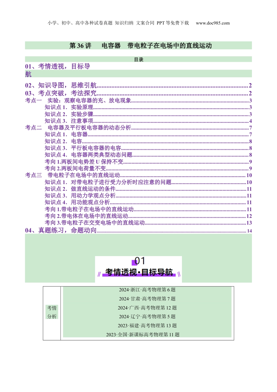小学、初中、高中各种试卷真题知识归纳文案合同PPT等免费下载www.doc985.com第36讲电容器带电粒子在电场中的直线运动目录01、考情透视,目标导航02、知识导图,思维引航.............................................................................................203、考点突破,考法探究.............................................................................................2考点一实验:观察电容器的充、放电现象....................................................................................3知识点1.实验原理...............................................................................................................3知识点2.实验步骤...............................................................................................................3知识点3.注意事项...............................................................................................................4考点二电容器及平行板电容器的动态分析....................................................................................7知识点1.电容器...................................................................................................................7知识点2.电容.......................................................................................................................8知识点3.平行板电容器的电容...........................................................................................8知识点4.电容器两类典型动态问题...................................................................................8考向1.两板间电势差U保持不变..........................................................................................9考向2.两板间电荷量不变......................................................................................................9考点三带电粒子在电场中的直线运动..........................................................................................10知识点1.对带电粒子进行受力分析时应注意的问题.....................................................10知识点2.做直线运动的条件.............................................................................................11知识点3.用动力学观点分析.............................................................................................11知识点4.用功能观点分析.................................................................................................11考向1.带电粒子在电场中的直线运动................................................................................11考向2.带电体在电场中的直线运动....................................................................................12考向3.带电粒子在交变电场中的直线运动........................................................................1304、真题练习,命题动向.........................................................................................................................14考情分析2024·浙江·高考物理第6题2024·甘肃·高考物理第7题2024·广西·高考物理第12题2024·辽宁·高考物理第5题2023·福建·高考物理第13题2023·全国·新课标高考物理第11题小学、初中、高中各种试卷真题知识归纳文案合同PPT等免费下载www.doc985.com复习目标目标1.知道电容器的基本构造,了解电容器的充电、放电过程。目标2.理解电容的定义及动态变化规律。目标3.掌握带电粒子在电场中做直线运动的规律。考点一实验:观察电容器的充、放电现象知识点1.实验原理(1)电容器的充电过程小学、初中、高中各种试卷真题知识归纳文案合同PPT等免费下载www.doc985....