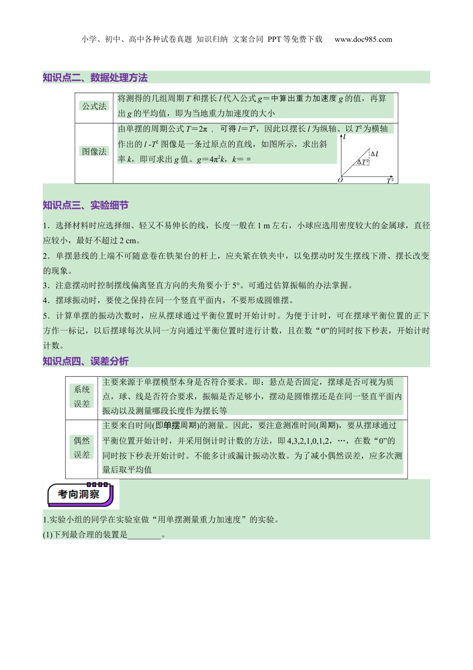 小学、初中、高中各种试卷真题知识归纳文案合同PPT等免费下载www.doc985.com第32讲实验:用单摆测量重力加速度目录01、考情透视,目标导航02、知识导图,思维引航.............................................................................................103、考点突破,考法探究.............................................................................................2考点一教材原型实验像....................................................................................................................2知识点一、原理与操作..........................................................................................................2知识点二、数据处理方法......................................................................................................3知识点三、实验细节..............................................................................................................3知识点四、误差分析..............................................................................................................3考点二探索创新实验........................................................................................................................804、真题练习,命题洞见.........................................................................................................................12考情分析2024·广西·高考物理试题2024·甘肃·高考物理试题2024·湖北·高考物理试题2024·辽宁·高考物理试题2024·河北·高考物理试题2024·重庆·高考物理试题复习目标目标1.知道利用单摆测量重力加速度的原理。目标2.掌握利用单摆测量重力加速度的方法。小学、初中、高中各种试卷真题知识归纳文案合同PPT等免费下载www.doc985.com考点一教材原型实验像知识点一、原理与操作原理装置图(1)摆角很小时,单摆做简谐运动,周期T=2π(2)由g=l可知,只要测出l、T即可计算出当地重力加速度的大小操作要领(1)做单摆:用约1m长的细线穿过小球上的小孔,并打一个比孔大的结,把细线另一端固定在铁架台上(2)测摆长:用毫米刻度尺测摆线长l′,用游标卡尺测小球直径D,则摆长l=l′+(3)测周期:让摆球偏离一个角度(小于5°),释放后让单摆自由摆动,测出单摆全振动30~50次的总时间,求出周期,反复测量三次,求出周期的平均值小学、初中、高中各种试卷真题知识归纳文案合同PPT等免费下载www.doc985.com知识点二、数据处理方法公式法将测得的几组周期T和摆长l代入公式g=中算出重力加速度g的值,再算出g的平均值,即为当地重力加速度的大小图像法由单摆的周期公式T=2π,可得l=T2,因此以摆长l为纵轴、以T2为横轴作出的l-T2图像是一条过原点的直线,如图所示,求出斜率k,即可求出g值。g=4π2k,k==知识点三、实验细节1.选择材料时应选择细、轻又不易伸长的线,长度一般在1m左右,小球应选用密度较大的金属球,直径应较小,最好不超过2cm。2.单摆悬线的上端不可随意卷在铁架台的杆上,应夹紧在铁夹中,以免摆动时发生摆线下滑、摆长改变的现象。3.注意摆动时控制摆线偏离竖直方向的夹角要小于5°。可通过估算振幅的办法掌握。4.摆球振动时,要使之保持在同一个竖直平面内,不要形成圆锥摆。5.计算单摆的振动次数时,应从摆球通过平衡位置时开始计时。为便于计时,可在摆球平衡位置的正下方作一标记,以后摆球每次从同一方向通过平衡位置时进行计数,且在数“0”的同时按下秒表,开始计时计数。知识点四、误差分析系统误差主要来源于单摆模型本身是否符合要求。即:悬点是否固定,摆球是否可视为质点,球、线是否符合要求,振幅是否足够小,摆动是圆锥摆还是在同一竖直平面内振动以及测量哪段长度作为摆长等偶然误差主要来自时间(即周期单摆)的测量。因此,要注意测准时间(周期),要从摆球通过平衡位置开始计时,并采用倒计时计数的方法,即4,3,2,1,0,1,2,…,在数“0”的同时按下秒表开...