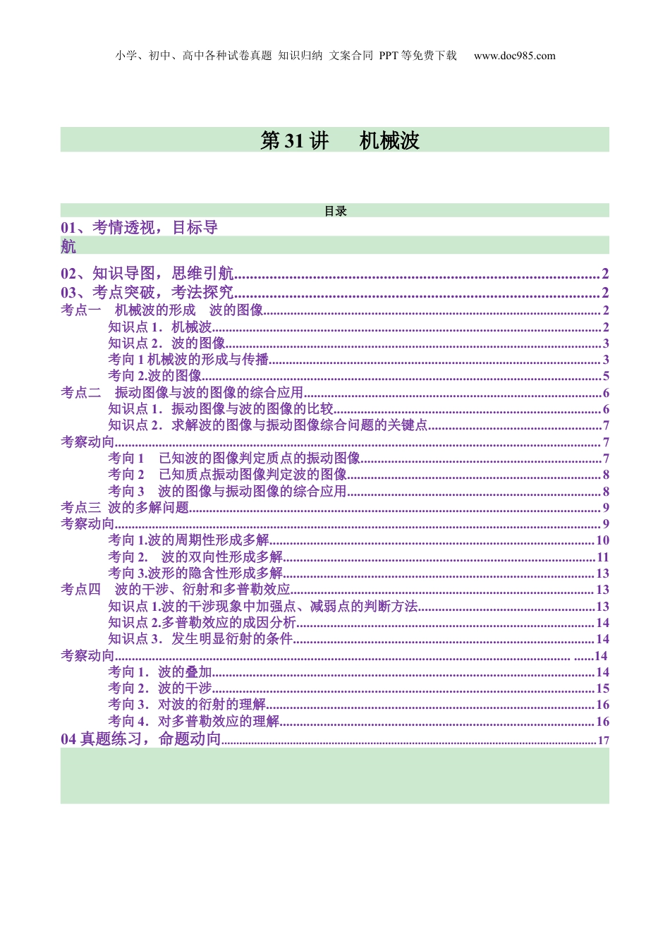 小学、初中、高中各种试卷真题知识归纳文案合同PPT等免费下载www.doc985.com第31讲机械波目录01、考情透视,目标导航02、知识导图,思维引航.............................................................................................203、考点突破,考法探究.............................................................................................2考点一机械波的形成波的图像....................................................................................................2知识点1.机械波...................................................................................................................2知识点2.波的图像...............................................................................................................3考向1机械波的形成与传播..................................................................................................3考向2.波的图像......................................................................................................................5考点二振动图像与波的图像的综合应用........................................................................................6知识点1.振动图像与波的图像的比较...............................................................................6知识点2.求解波的图像与振动图像综合问题的关键点...................................................7考察动向................................................................................................................................................7考向1已知波的图像判定质点的振动图像.......................................................................7考向2已知质点振动图像判定波的图像...........................................................................8考向3波的图像与振动图像的综合应用...........................................................................8考点三波的多解问题..........................................................................................................................9考察动向................................................................................................................................................9考向1.波的周期性形成多解................................................................................................10考向2.波的双向性形成多解............................................................................................11考向3.波形的隐含性形成多解............................................................................................13考点四波的干涉、衍射和多普勒效应..........................................................................................13知识点1.波的干涉现象中加强点、减弱点的判断方法....................................................13知识点2.多普勒效应的成因分析........................................................................................14知识点3.发生明显衍射的条件.........................................................................................14考察动向.............................................................................................................................................14考向1.波的叠加.................................................................................................................14考向2.波的干涉.................................................................................................................15考向3.对...