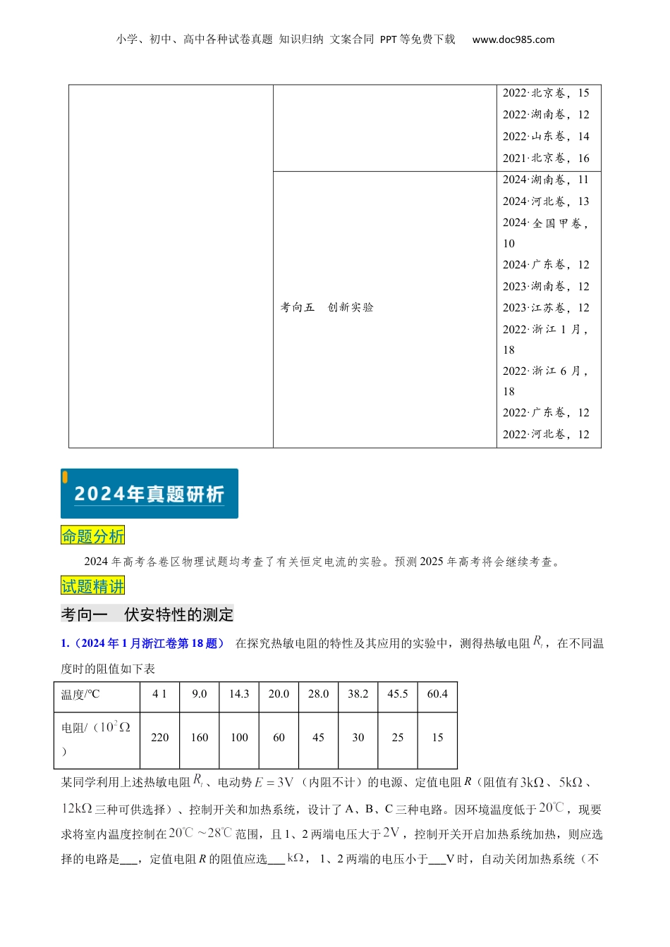 小学、初中、高中各种试卷真题知识归纳文案合同PPT等免费下载www.doc985.com考情概览:解读近年命题思路和内容要求,统计真题考查情况。2024年真题研析:分析命题特点,探寻常考要点,真题分类精讲。近年真题精选:分类精选近年真题,把握命题趋势。必备知识速记:归纳串联解题必备知识,总结易错易混点。名校模拟探源:精选适量名校模拟题,发掘高考命题之源。命题解读考向考查统计本类试题主要考查恒定电流中的相关实验。考向一伏安特性的测定2024·浙江1月,182023·全国甲卷,92022·全国乙卷,102021·全国甲卷,102021·河北卷,11考向二电表的改装及电流表、电压表内阻的测量2024·安徽卷,122023·海南卷,152022·全国甲卷,92022·辽宁卷,112021·辽宁卷,12考向三测电源的电动势和内阻2024·辽宁卷,112024·北京卷,172024·甘肃卷,122023·湖北卷,122023·浙江6月,182021·全国乙卷,102021·湖北卷,132021·湖南卷,12考向四多用电表欧姆档问题2024·新课标卷,102023·天津卷,10小学、初中、高中各种试卷真题知识归纳文案合同PPT等免费下载www.doc985.com2022·北京卷,152022·湖南卷,122022·山东卷,142021·北京卷,16考向五创新实验2024·湖南卷,112024·河北卷,132024·全国甲卷,102024·广东卷,122023·湖南卷,122023·江苏卷,122022·浙江1月,182022·浙江6月,182022·广东卷,122022·河北卷,12命题分析2024年高考各卷区物理试题均考查了有关恒定电流的实验。预测2025年高考将会继续考查。试题精讲考向一伏安特性的测定1.(2024年1月浙江卷第18题)在探究热敏电阻的特性及其应用的实验中,测得热敏电阻,在不同温度时的阻值如下表温度/℃4.19.014.320.028.038.245.560.4电阻/()2201601006045302515某同学利用上述热敏电阻、电动势(内阻不计)的电源、定值电阻R(阻值有、、三种可供选择)、控制开关和加热系统,设计了A、B、C三种电路。因环境温度低于,现要求将室内温度控制在范围,且1、2两端电压大于,控制开关开启加热系统加热,则应选择的电路是___,定值电阻R的阻值应选___,1、2两端的电压小于___V时,自动关闭加热系统(不小学、初中、高中各种试卷真题知识归纳文案合同PPT等免费下载www.doc985.com考虑控制开关对电路的影响)。A.B.C.【答案】①.C②.3③.1.8【解析】[1]A.电路A,定值电阻和热敏电阻并联,电压不变,故不能实现电路的控制,故A错误;B.定值电阻和热敏电阻串联,温度越低,热敏电阻的阻值越大,定值电阻分得电压越小,无法实现1、2两端电压大于,控制开关开启加热系统加热。故B错误;C.定值电阻和热敏电阻串联,温度越低,热敏电阻的阻值越大,热敏电阻分得电压越大,可以实现1、2两端电压大于,控制开关开启加热系统加热。故C正确。故选C。[2]由热敏电阻在不同温度时的阻值表可知,的阻值为由题意可知解得[3]时关闭加热系统,此时热敏电阻阻值为,此时1、2两点间的电压为则1、2两端的电压小于1.8V时,自动关闭加热系统。考向二电表的改装及电流表、电压表内阻的测量2.(2024年安徽卷第12题)某实验小组要将电流表G(铭牌标示:,)改装成量程为1V和3V的电压表,并用标准电压表对其进行校准。选用合适的电源、滑动变阻器、电阻箱、开关和标准电压表等实验器材,按图(1)所示连接电路,其中虚线框内为改装电路。小学、初中、高中各种试卷真题知识归纳文案合同PPT等免费下载www.doc985.com(1)开关闭合前,滑片P应移动到________(填“M”或“N”)端。(2)根据要求和已知信息,电阻箱的阻值已调至,则的阻值应调至________。(3)当单刀双掷开关与a连接时,电流表G和标准电压表V的示数分别为I、U,则电流表G的内阻可表示为________。(结果用U、I、、表示)(4)校准电表时,发现改装后电压表的读数始终比标准电压表的读数偏大,经排查发现电流表G内阻的真实值与铭牌标示值有偏差,则只要________即可。(填正确答案标号)A.增大电阻箱的阻值B.减小电阻箱的阻值C.将滑动变阻器的滑片P向M端滑动(5)校准完成后,开关与b连接,电流表G的示数如图(2)所示,此示数对应的改装电压表读数为________V。(保留2...
