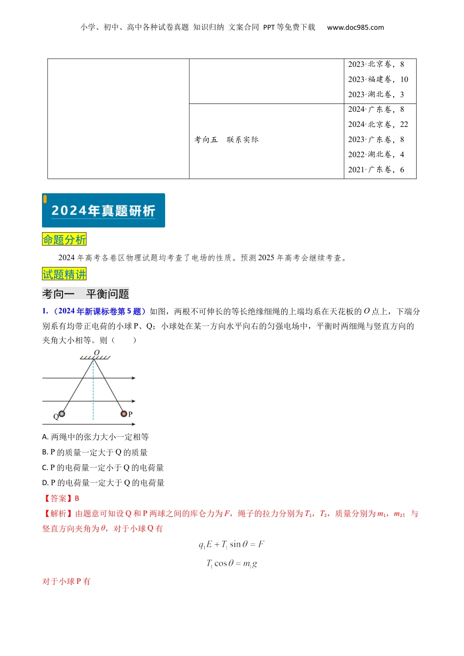 小学、初中、高中各种试卷真题知识归纳文案合同PPT等免费下载www.doc985.com考情概览:解读近年命题思路和内容要求,统计真题考查情况。2024年真题研析:分析命题特点,探寻常考要点,真题分类精讲。近年真题精选:分类精选近年真题,把握命题趋势。必备知识速记:归纳串联解题必备知识,总结易错易混点。名校模拟探源:精选适量名校模拟题,发掘高考命题之源。命题解读考向考查统计本类试题主要考查电场的力的性质和电场的能的性质及其应用。考向一平衡问题2024·新课标卷,52023·湖南卷,82022·辽宁卷,102021·湖北卷,11考向二电场强度、电势的叠加2024·河北卷,72024·全国甲卷,52023·海南卷,122023·河北卷,52023·湖南卷,52023·全国乙卷,112023·山东卷,112023·重庆卷,32022·全国乙卷,62022·河北卷,6考向三各种图像2024·湖南卷,52024·江苏卷,12021·山东卷,6考向四对比、动态分析问题2024·河北卷,22024·江西卷,12024·北京卷,112024·安徽卷,82024·甘肃卷,92024·广西卷,72024·湖北卷,8小学、初中、高中各种试卷真题知识归纳文案合同PPT等免费下载www.doc985.com2023·北京卷,82023·福建卷,102023·湖北卷,3考向五联系实际2024·广东卷,82024·北京卷,222023·广东卷,82022·湖北卷,42021·广东卷,6命题分析2024年高考各卷区物理试题均考查了电场的性质。预测2025年高考会继续考查。试题精讲考向一平衡问题1.(2024年新课标卷第5题)如图,两根不可伸长的等长绝缘细绳的上端均系在天花板的O点上,下端分别系有均带正电荷的小球P、Q;小球处在某一方向水平向右的匀强电场中,平衡时两细绳与竖直方向的夹角大小相等。则()A.两绳中的张力大小一定相等B.P的质量一定大于Q的质量C.P的电荷量一定小于Q的电荷量D.P的电荷量一定大于Q的电荷量【答案】B【解析】由题意可知设Q和P两球之间的库仑力为F,绳子的拉力分别为T1,T2,质量分别为m1,m2;与竖直方向夹角为θ,对于小球Q有对于小球P有小学、初中、高中各种试卷真题知识归纳文案合同PPT等免费下载www.doc985.com联立有所以可得又因为可知,即P的质量一定大于Q的质量;两小球的电荷量则无法判断。故选B。考向二电场强度、电势的叠加2.(2024年河北卷第7题)如图,真空中有两个电荷量均为的点电荷,分别固定在正三角形的顶点B、C.M为三角形的中心,沿的中垂线对称放置一根与三角形共面的均匀带电细杆,电荷量为.已知正三角形的边长为a,M点的电场强度为0,静电力常量的k.顶点A处的电场强度大小为()A.B.C.D.【答案】D【解析】B点C点的电荷在M的场强的合场强为因M点的合场强为零,因此带电细杆在M点的场强,由对称性可知带电细杆在A点的场强为,方向竖直向上,因此A点合场强为小学、初中、高中各种试卷真题知识归纳文案合同PPT等免费下载www.doc985.com故选D。3.(2024年全国甲卷第5题)在电荷量为Q的点电荷产生的电场中,将无限远处的电势规定为零时,距离该点电荷r处的电势为,其中k为静电力常量,多个点电荷产生的电场中某点的电势,等于每个点电荷单独存在的该点的电势的代数和。电荷量分别为和的两个点电荷产生的电场的等势线如图中曲线所示(图中数字的单位是伏特),则()A.,B.,C.,D.,【答案】B【解析】根据两点电荷周围的电势分布可知带正电,带负电;由图中电势为0的等势线可知由图中距离关系可知联立解得故选B。考向三各种图像4.(2024年湖南卷第5题)真空中有电荷量为和的两个点电荷,分别固定在x轴上和0处。设无限远处电势为0,x正半轴上各点电势随x变化的图像正确的是()小学、初中、高中各种试卷真题知识归纳文案合同PPT等免费下载www.doc985.comA.B.C.D.【答案】D【解析】根据点电荷周围的电势公式,设处的电势为0,得解得故可知当时,;当时,。故选D。5.(2024·江苏卷·第1题)在静电场中有a、b两点,试探电荷在两点的静电力F与电荷量q满足如图所示的关系,请问a、b两点的场强大小关系是()A.B.C.D.【答案】D【解析】根据可知图像斜率表示电场强度,由图可知根据题意无法得出和的数量关系。故选D。考向四对比、动态分析问题6.(2024年河北卷第2题)我国...