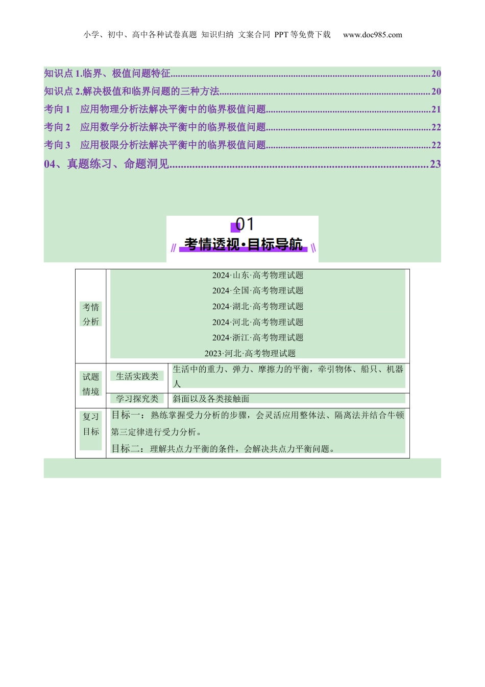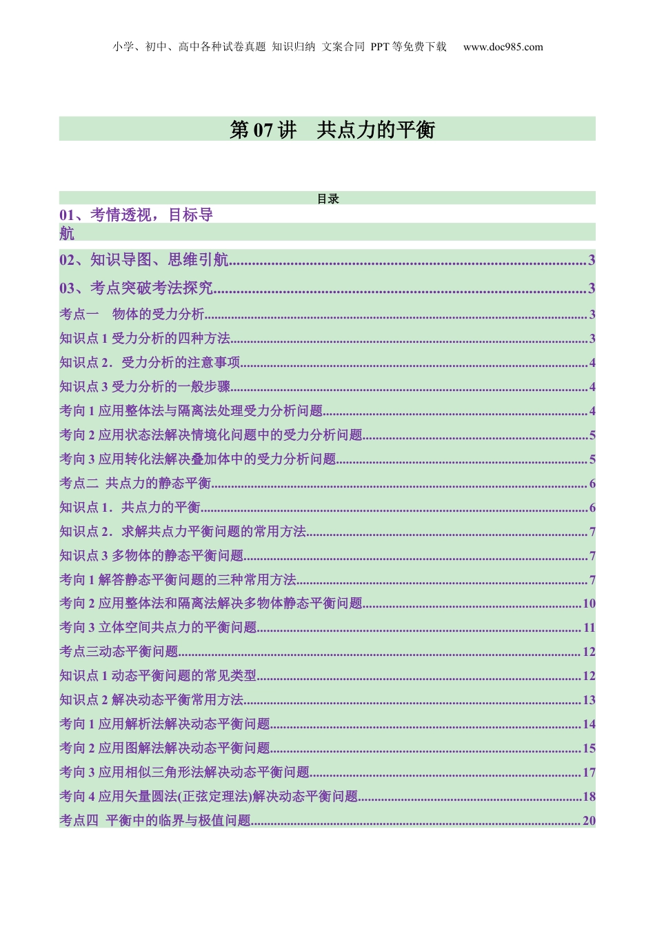小学、初中、高中各种试卷真题知识归纳文案合同PPT等免费下载www.doc985.com第07讲共点力的平衡目录01、考情透视,目标导航02、知识导图、思维引航.............................................................................................303、考点突破考法探究.................................................................................................3考点一物体的受力分析....................................................................................................................3知识点1受力分析的四种方法............................................................................................................3知识点2.受力分析的注意事项.........................................................................................................4知识点3受力分析的一般步骤............................................................................................................4考向1应用整体法与隔离法处理受力分析问题................................................................................4考向2应用状态法解决情境化问题中的受力分析问题....................................................................5考向3应用转化法解决叠加体中的受力分析问题............................................................................5考点二共点力的静态平衡..................................................................................................................6知识点1.共点力的平衡.....................................................................................................................6知识点2.求解共点力平衡问题的常用方法.....................................................................................7知识点3多物体的静态平衡问题........................................................................................................7考向1解答静态平衡问题的三种常用方法........................................................................................7考向2应用整体法和隔离法解决多物体静态平衡问题..................................................................10考向3立体空间共点力的平衡问题..................................................................................................11考点三动态平衡问题..........................................................................................................................12知识点1动态平衡问题的常见类型..................................................................................................12知识点2解决动态平衡常用方法......................................................................................................13考向1应用解析法解决动态平衡问题..............................................................................................14考向2应用图解法解决动态平衡问题..............................................................................................15考向3应用相似三角形法解决动态平衡问题..................................................................................17考向4应用矢量圆法(正弦定理法)解决动态平衡问题....................................................................18考点四平衡中的临界与极值问题....................................................................................................20小学、初中、高中各种试卷真题知识归纳文案合同PPT等免费下载www.doc985.com知识点1.临界、极值问题特征..............................................................................