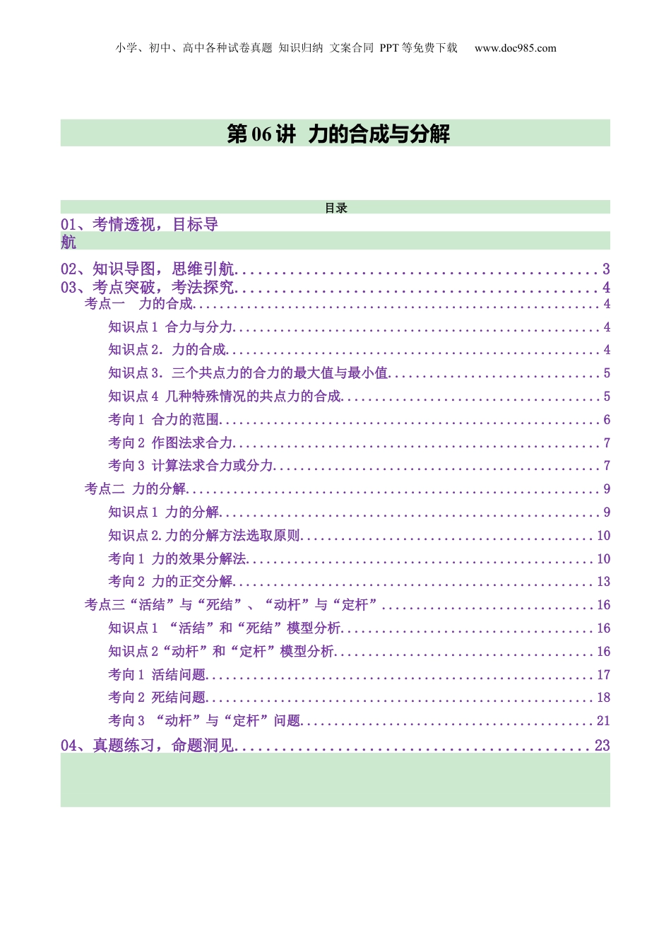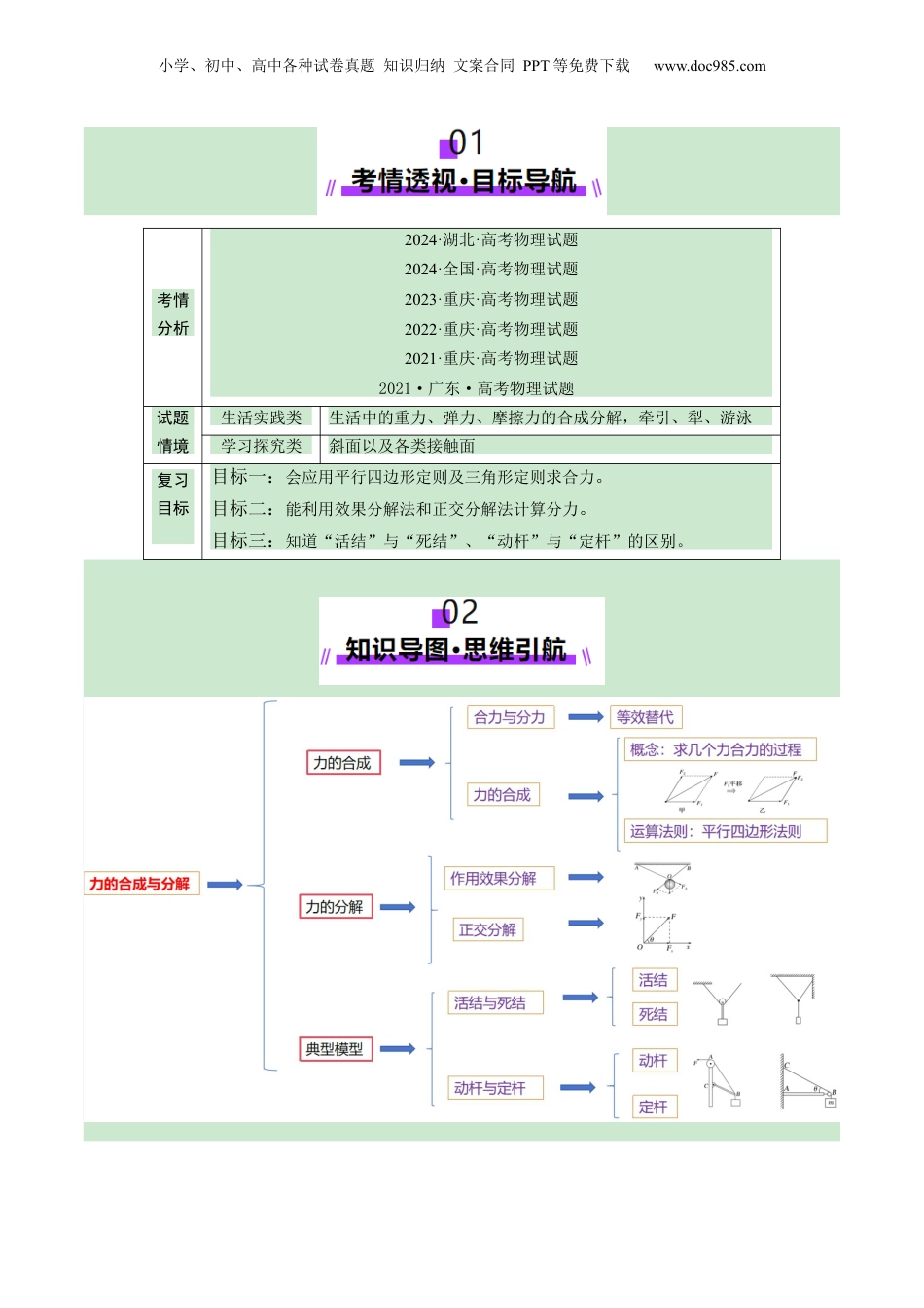 小学、初中、高中各种试卷真题知识归纳文案合同PPT等免费下载www.doc985.com第06讲力的合成与分解目录01、考情透视,目标导航02、知识导图,思维引航..............................................303、考点突破,考法探究..............................................4考点一力的合成............................................................4知识点1合力与分力......................................................4知识点2.力的合成.......................................................4知识点3.三个共点力的合力的最大值与最小值...............................5知识点4几种特殊情况的共点力的合成......................................5考向1合力的范围........................................................6考向2作图法求合力......................................................7考向3计算法求合力或分力................................................7考点二力的分解.............................................................9知识点1力的分解........................................................9知识点2.力的分解方法选取原则...........................................10考向1力的效果分解法...................................................10考向2力的正交分解.....................................................13考点三“活结”与“死结”、“动杆”与“定杆”...............................16知识点1“活结”和“死结”模型分析.....................................16知识点2“动杆”和“定杆”模型分析......................................16考向1活结问题.........................................................17考向2死结问题.........................................................18考向3“动杆”与“定杆”问题...........................................2104、真题练习,命题洞见.............................................23小学、初中、高中各种试卷真题知识归纳文案合同PPT等免费下载www.doc985.com考情分析2024·湖北·高考物理试题2024·全国·高考物理试题2023·重庆·高考物理试题2022·重庆·高考物理试题2021·重庆·高考物理试题2021·广东·高考物理试题试题情境生活实践类生活中的重力、弹力、摩擦力的合成分解,牵引、犁、游泳学习探究类斜面以及各类接触面复习目标目标一:会应用平行四边形定则及三角形定则求合力。目标二:能利用效果分解法和正交分解法计算分力。目标三:知道“活结”与“死结”、“动杆”与“定杆”的区别。小学、初中、高中各种试卷真题知识归纳文案合同PPT等免费下载www.doc985.com主题导入:在情境迁移中厘清“物理观念”【情境创设】如甲所示,小孩分用力图两个别F1、F2提着一桶水,水桶止;如乙所示,一大人用力静图个单独F提着同一桶水,水桶止。静【快速判断】(1)F1和F2是共点力。()(2)F1和F2的共同作用效果与F的作用效果相同。()(3)合力F与分力F1、F2之间满足平行四边形定则。()(4)水桶的重力就是F1、F2两个力的合力。()(5)几个力的共同作用效果可以用一个力代替。((6)在进行力的合成与分解时,要应用平行四边形定则或三角形定则。()(7)两个力的合力一定比任一分力大。()(8)合力与分力是等效替代关系,因此受力分析时不要重复分析。()(9)矢量既有大小又有方向,所以既有大小又有方向的物理量一定是矢量。()考点一力的合成知识点1合力与分力(1)定义:如果一个力单独作用的效果跟某几个力共同作用的效果相同,这个力叫作那几个力的,那几个力叫作这个力的。小学、初中、高中各种试卷真题知识归纳文案合同PPT等免费下载www.doc985.com(2)关系:合力与分力是关系。知识点2.力的合成(1)定义:求几个力的的过程。(2)运算法则①平行四边形定则:求两个互成角度的分力的合力,可以用表示这两个力的有向线段为作平行四边形,这两个邻边之间的就表示合力的大小和方向。如图甲所示,F1、F2为分力,F为合力。②三角形定则:把两个矢量的...