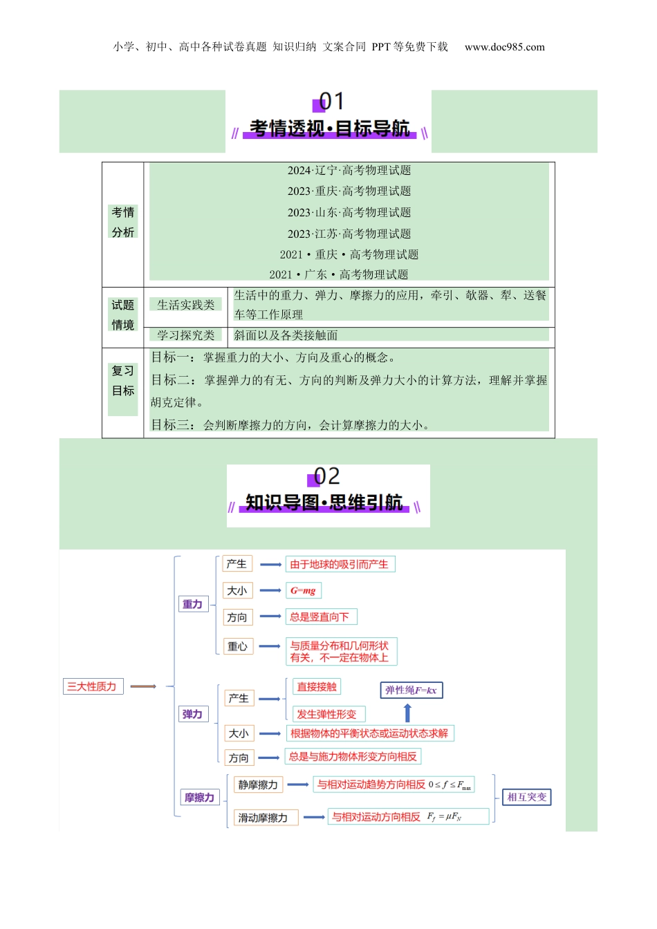 小学、初中、高中各种试卷真题知识归纳文案合同PPT等免费下载www.doc985.com第05讲三大性质力目录01、考情透视,目标导航02、知识导图,思维引航...........................................................................................................................203、考点突破,考法探究...........................................................................................................................4考点一重力弹力........................................................................................................................................4知识点1重力和重心............................................................................................................................4知识点2弹力........................................................................................................................................4考向1重力与重心................................................................................................................................5考向2弹力的有无及方向判断............................................................................................................6考向3弹力的大小计算........................................................................................................................7考点二摩擦力...........................................................................................................................................10知识点1.两种摩擦力的比较..............................................................................................................10知识点2.关于摩擦力的四个易错点...............................................................................................11考向1静摩擦力的有无及方向判断..................................................................................................11考向2静摩擦力大小的计算..............................................................................................................13考向3滑动摩擦力大小的计算..........................................................................................................14考点三摩擦力的四类突变.......................................................................................................................16知识点1“静—静”突变.....................................................................................................................16知识点2“静—动”突变.....................................................................................................................16知识点3“动—静”突变...............................................................................................................16知识点4“动—动”突变.....................................................................................................................16考向1“静—静”突变........................................................................................................................17考向2“静—动”突变........................................................................................................................17考向3“动—静”突变........................................................................................................................18考向4“动—动”突变....................................................................................................................