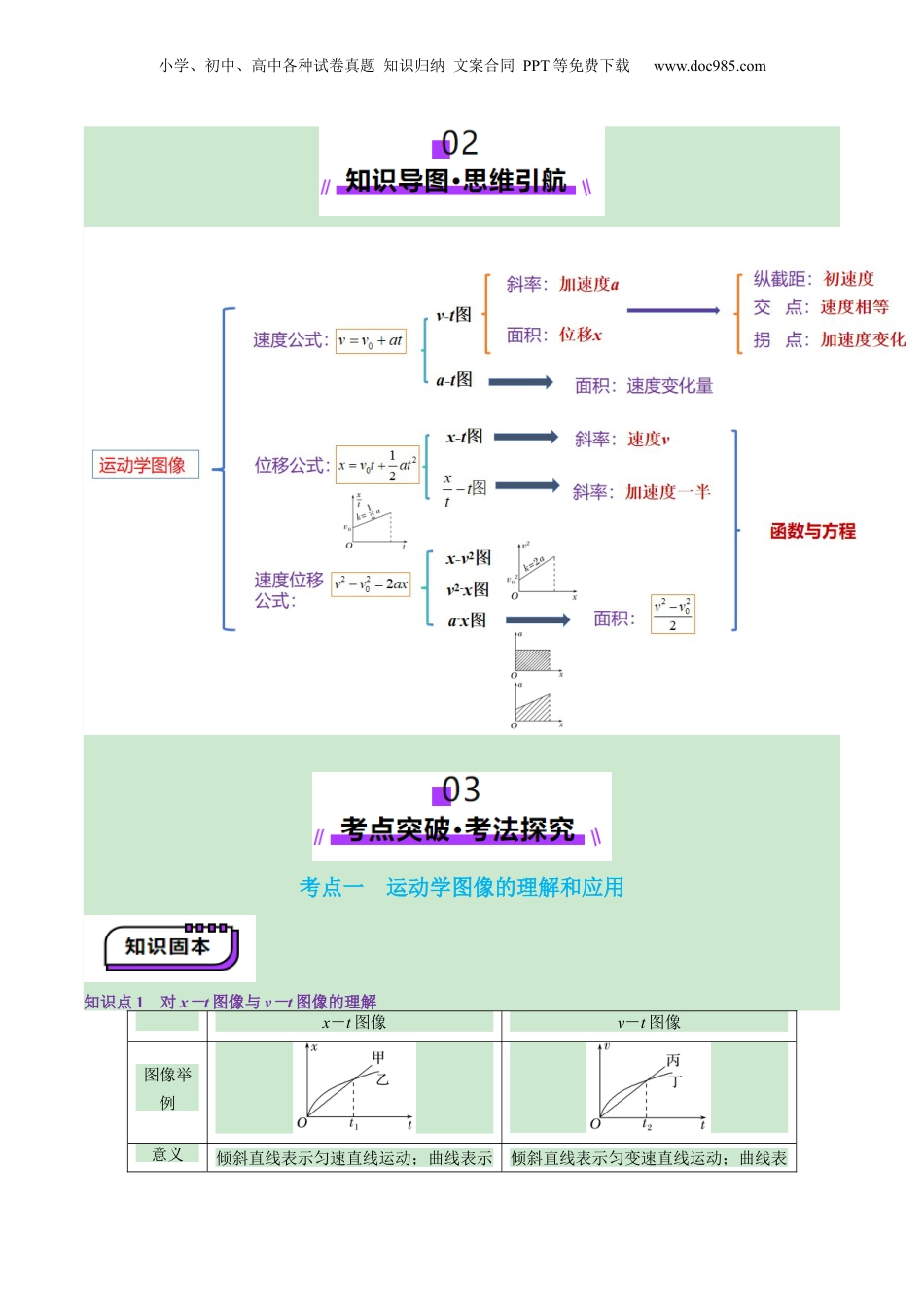 小学、初中、高中各种试卷真题知识归纳文案合同PPT等免费下载www.doc985.com第03讲运动学图像追击相遇问题目录01、考情透视,目标导航02、知识导图,思维引航..............................................203、考点突破,考法探究..............................................2考点一运动学图像的理解和应用.............................................................................................3考向1位移—时间(x-t)图像...................................................................................................4考向2速度—时间(v-t)图像...................................................................................................6考向3x-t图像与v-t图像的比较.......................................................................................8考向3加速度—时间(a-t)图像...............................................................................................9考向4图像间的相互转化....................................................................................................11考点二“数学思维”分析非常规图像问题...............................................................................12考向1-t图像的理解与应用.................................................................................................13考向2v2-x图像的理解与应用.............................................................................................14考向3a-x图像的理解与应用..............................................................................................15考向4-图像的理解与应用................................................................................................16考向5-x图像的理解与应用.............................................................................................17考点三追及相遇问题.................................................................................................................20考向1应用情境分析法求解追及相遇问题........................................................................21考向2应用图像分析法求解追及相遇问题........................................................................22考向3应用函数分析法求解追及相遇问题........................................................................2304、真题练习、命题洞见.........................................................................................................................24小学、初中、高中各种试卷真题知识归纳文案合同PPT等免费下载www.doc985.com考情分析2024·全国·高考真题物理试题2024·甘肃·高考真题物理试题2024·福建·高考真题物理试题2023·广东·高考真题物理试题2023·全国·高考真题物理试题2023·江苏·高考真题物理试题2023·福建·高考真题物理试题2023·重庆·高考真题物理试题2023·湖北·高考真题物理试题2022·河北·高考真题物理试题2022·湖南·高考真题物理试题试题情境生活实践类安全行车,生活娱乐,交通运输,体育运动(如汽车刹车,飞机起飞,电梯运行,无人机升空)学习探究类科学实验,无人机测试等复习目标目标一:知道常见运动学图像的物理意义。目标二:会根据图像分析物体的运动情况。目标三:会分析图像并能进行图像间的相互转化。目标四:会分析追及相遇问题,掌握追及相遇问题的分析方法和技巧。目标五:熟练运用运动学公式结合运动学图像解决追及相遇问题。小学、初中、高中各种试卷真题知识归纳文案合同PPT等免费下载www.doc985.com考点一运动学图像的理解和应用知识点1对x-t图像与v-t图像的理解x-t图像v-t图像图像举例意义倾斜直线表示匀速直线运动;曲线表示倾斜直线表示匀变速直线运动;曲线表小学、初中、高中各种...