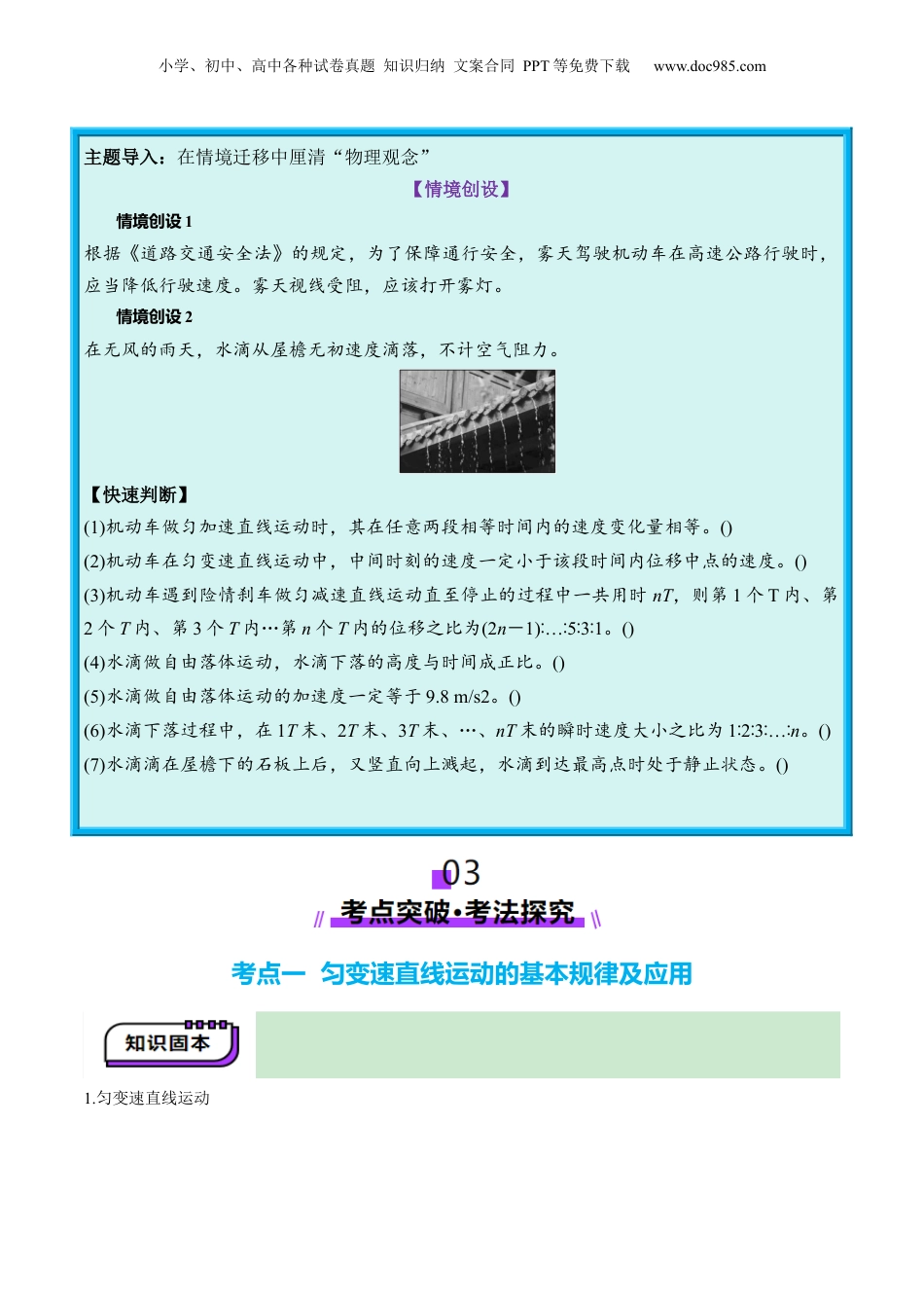小学、初中、高中各种试卷真题知识归纳文案合同PPT等免费下载www.doc985.com第02讲匀变速直线运动的规律目录01、考情透视,目标导航02、知识导图,思维引航..............................................203、考点突破,考法探究..............................................3考点一匀变速直线运动的基本规律及应用...........................4考向1基本公式的应用....................................................4考向2两类特殊的匀减速直线运动对比......................................7考向3匀变速直线运动中的多过程问题......................................9考点二匀变速直线运动的推论及应用...............................10考向1平均速度公式的应用...............................................10考向2位移差公式的应用.................................................11考向3初速度为零的匀变速直线运动比例式的应用............................12考点三自由落体和竖直上抛.......................................12考向1自由落体规律的应用...............................................13考向2竖直上抛运动的处理方法...........................................15考点四解决匀变速直线运动问题的六种方法.........................16考向1基本公式法.......................................................17考向2平均速度法.......................................................18考向3比例法...........................................................18考向4逆向思维法.......................................................19考向5推论法...........................................................19考向6图像法...........................................................2004、真题练习,命题洞见小学、初中、高中各种试卷真题知识归纳文案合同PPT等免费下载www.doc985.com考情分析2021年湖北省普通高校招生选考物理试题2021年河北省普通高校招生物理试题2022年全国卷物理试题2023年山东省普通高校招生选考物理试题卷2022年湖北省普通高校招生选考物理试题试题情境生活实践类安全行车,生活娱乐,交通运输,体育运动(如汽车刹车,飞机起飞,电梯运行,无人机升空)学习探究类伽利略对自由落体运动的研究,速度的测量,加速度的测量,追及相遇问题概念辨析复习目标目标一:.理解匀变速直线运动的基本公式,并能熟练灵活应用。目标二:.掌握匀变速直线运动的推论,并能应用解题。小学、初中、高中各种试卷真题知识归纳文案合同PPT等免费下载www.doc985.com主题导入:在情境迁移中厘清“物理观念”【情境创设】情境创设1根据《道路交通安全法》的规定,为了保障通行安全,雾天驾驶机动车在高速公路行驶时,应当降低行驶速度。雾天视线受阻,应该打开雾灯。情境创设2在无风的雨天,水滴从屋檐无初速度滴落,不计空气阻力。【快速判断】(1)机动车做匀加速直线运动时,其在任意两段相等时间内的速度变化量相等。()(2)机动车在匀变速直线运动中,中间时刻的速度一定小于该段时间内位移中点的速度。()(3)机动车遇到险情刹车做匀减速直线运动直至停止的过程中一共用时nT,则第1个T内、第2个T内、第3个T内…第n个T内的位移之比为(2n-1)…531∶∶∶∶。()(4)水滴做自由落体运动,水滴下落的高度与时间成正比。()(5)水滴做自由落体运动的加速度一定等于9.8m/s2。()(6)水滴下落过程中,在1T末、2T末、3T末、…、nT末的瞬时速度大小之比为123…∶∶∶∶n。()(7)水滴滴在屋檐下的石板上后,又竖直向上溅起,水滴到达最高点时处于静止状态。()考点一匀变速直线运动的基本规律及应用1.匀变速直线运动小学、初中、高中各种试卷真题知识归纳文案合同PPT等免费下载www.doc985.com沿着一条直线且不变的运动。如图所示,v-t图线是一条倾斜的直线。2.匀变速直线运动的两个基本规律(1)速度与时间的关系式:v=(2)位移与时间的关系式:x=v0t+at2。由以上两式联立可得速度与位移的关系式:。3.公式选用原则以上三个公式共涉及五个物...