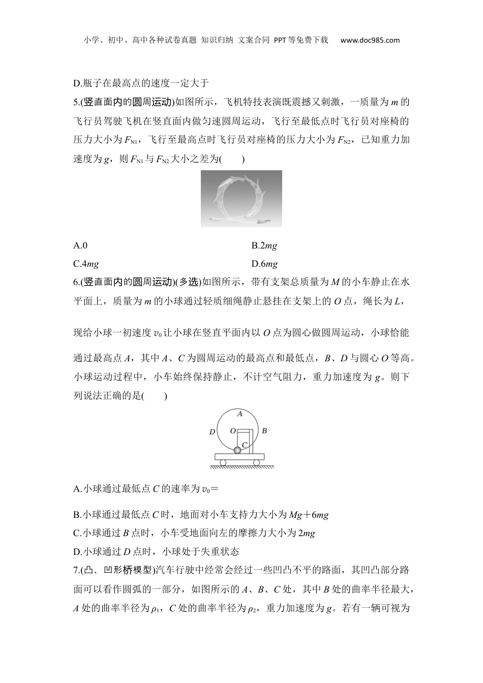 小学、初中、高中各种试卷真题知识归纳文案合同PPT等免费下载www.doc985.com选择题考点专项22竖直面内与倾斜面内的圆周运动1.(秋千模型)荡秋千是人们平时喜爱的一项休闲娱乐活动,如图所示小孩正在荡秋千,若忽略空气阻力,则下列说法正确的是()A.在最高点时小孩速度为零,处于平衡状态B.在最低点时小孩处于失重状态C.在最低点时小孩速度最大,加速度为零D.在最低点时小孩对踏板的压力大小等于踏板对该同学的支持力2.(水流星模型)杂技演员表演“水流星”,在长为1.6m的细绳的一端,系一个与水的总质量为m=0.5kg的盛水容器,以绳的另一端为圆心,在竖直平面内做圆周运动,如图所示,若“水流星”通过最高点时的速率为4m/s,则下列说法正确的是(g=10m/s2)()A.“水流星”通过最高点时,有水从容器中流出小学、初中、高中各种试卷真题知识归纳文案合同PPT等免费下载www.doc985.comB.“水流星”通过最高点时,绳的张力及容器底部受到的压力均为零C.“水流星”通过最高点时,处于完全失重状态,不受力的作用D.“水流星”通过最高点时,绳子的拉力大小为5N3.(“—球绳”模型)(多选)如图甲所示,用一轻质绳拴着一质量为m的小球,在竖直平面内做圆周运动(不计一切阻力),小球运动到最高点时绳对小球的拉力为FT,小球在最高点的速度大小为v,其FT-v2图像如图乙所示,则()A.当地的重力加速度为B.轻质绳长为C.当v2=c时,轻质绳的拉力大小为+aD.只要v2≥b,小球在最低点和最高点时绳的拉力差均为6a4.(完全失重下的速周状态匀圆运动)2022年3月23日,三位神舟十三号航天员翟志刚、王亚平、叶光富相互配合完成“天宫课堂”第二次太空授课。如图所示,授课中航天员叶光富手拉细线不断加速让一个小瓶子在竖直平面内做圆周运动,从而实现瓶内油水分层。若绳子长为l(瓶子可视为质点),水的质量为m,则()A.油和水的向心加速度相等B.油受到的向心力可能大于水C.水受到瓶子的作用力为m小学、初中、高中各种试卷真题知识归纳文案合同PPT等免费下载www.doc985.comD.瓶子在最高点的速度一定大于5.(直面的周竖内圆运动)如图所示,飞机特技表演既震撼又刺激,一质量为m的飞行员驾驶飞机在竖直面内做匀速圆周运动,飞行至最低点时飞行员对座椅的压力大小为FN1,飞行至最高点时飞行员对座椅的压力大小为FN2,已知重力加速度为g,则FN1与FN2大小之差为()A.0B.2mgC.4mgD.6mg6.(直面的周竖内圆运动)(多选)如图所示,带有支架总质量为M的小车静止在水平面上,质量为m的小球通过轻质细绳静止悬挂在支架上的O点,绳长为L,现给小球一初速度v0让小球在竖直平面内以O点为圆心做圆周运动,小球恰能通过最高点A,其中A、C为圆周运动的最高点和最低点,B、D与圆心O等高。小球运动过程中,小车始终保持静止,不计空气阻力,重力加速度为g。则下列说法正确的是()A.小球通过最低点C的速率为v0=B.小球通过最低点C时,地面对小车支持力大小为Mg+6mgC.小球通过B点时,小车受地面向左的摩擦力大小为2mgD.小球通过D点时,小球处于失重状态7.(凸、凹形模型桥)汽车行驶中经常会经过一些凹凸不平的路面,其凹凸部分路面可以看作圆弧的一部分,如图所示的A、B、C处,其中B处的曲率半径最大,A处的曲率半径为ρ1,C处的曲率半径为ρ2,重力加速度为g。若有一辆可视为小学、初中、高中各种试卷真题知识归纳文案合同PPT等免费下载www.doc985.com质点、质量为m的小汽车与路面之间各处的动摩擦因数均为μ,当该车以恒定的速率v沿这段凹凸路面行驶时,下列说法正确的是()A.汽车经过A处时处于超重状态,经过C处时处于失重状态B.汽车经过B处时最容易爆胎C.为了保证行车不脱离路面,该车的行驶速度不得超过D.汽车经过C处时所受的摩擦力大小为μmg8.(“杆—球”模型)(多选)做“单臂大回环”的高难度动作时,用一只手抓住单杠,伸展身体,以单杠为轴做圆周运动。如图甲所示,运动员运动到最高点时,用力传感器测得运动员与单杠间弹力大小为F,用速度传感器记录他在最高点的速度大小为v,得到F-v2图像如图乙所示。g取10m/s2,则下列说法中正确的是()A.运动员的质量为65kgB.运动员的重心到单杠的距离为0.9mC.当运动员在最高点的速度为4m/s时,...