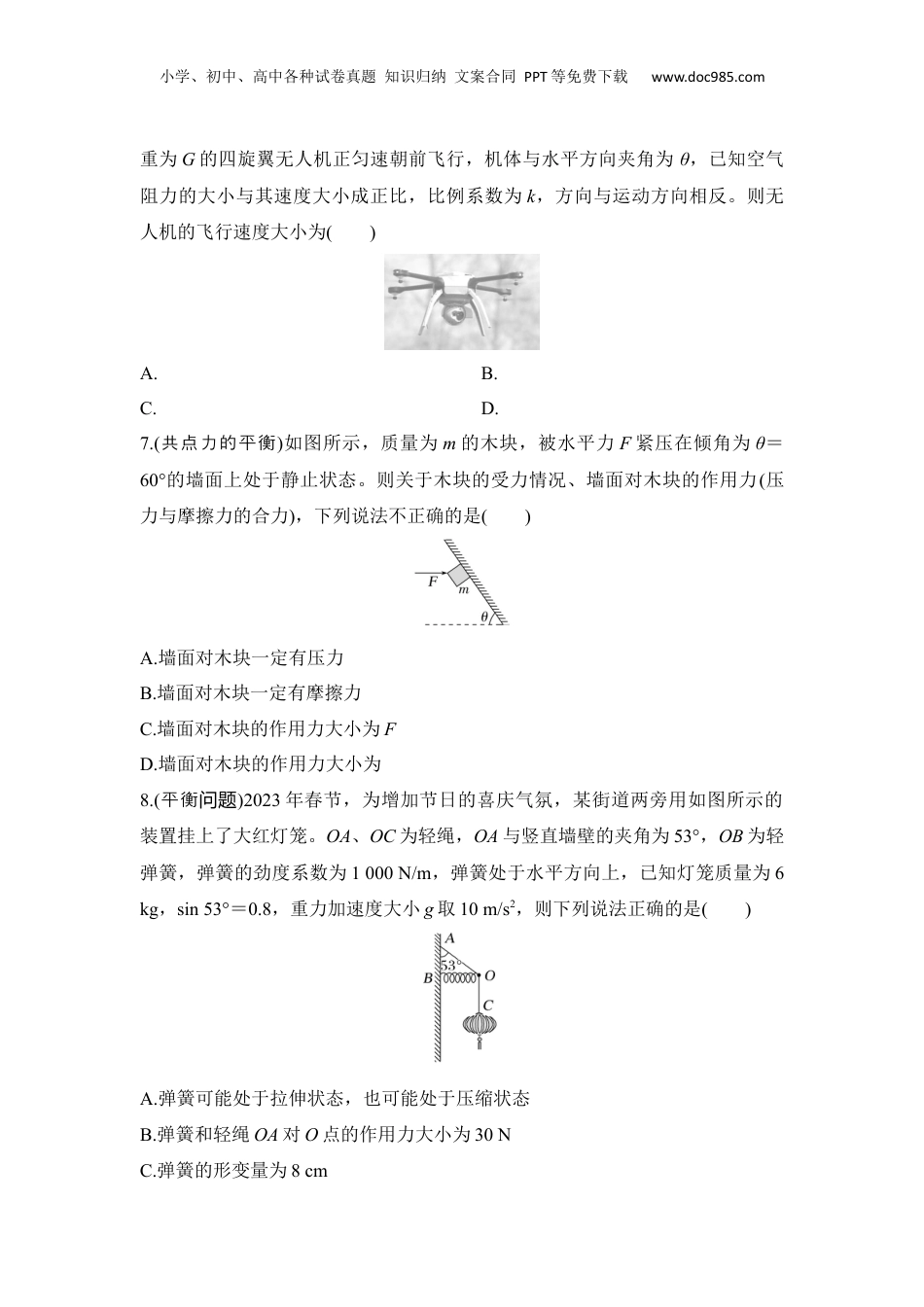 小学、初中、高中各种试卷真题知识归纳文案合同PPT等免费下载www.doc985.com选择题考点专项7静态平衡问题1.(共点力的平衡)餐厅暖盘车的储盘装置示意图如图所示,三根完全相同的弹簧等间距竖直悬挂在水平固定圆环上,下端连接托盘。托盘上叠放若干相同的盘子,取走一个盘子,稳定后余下的正好升高补平。已知单个盘子的质量为300g,相邻两盘间距1.0cm,重力加速度大小取10m/s2。弹簧始终在弹性限度内,每根弹簧的劲度系数为()A.10N/mB.100N/mC.200N/mD.300N/m2.(共点力的平衡)一根长2m,重为G的不均匀直棒AB,用两根细绳水平悬挂在天花板上,当棒平衡时细绳与水平面的夹角如图所示,则关于直棒重心C的位置,下列说法正确的是()A.距离B端0.5m处B.距离B端0.75m处C.距离B端m处D.距离B端m处3.(共点力的平衡)如图甲所示,“爬绳”是一项锻炼臂力的体育运动。一位同学看见体育场支架上竖直悬挂着的粗壮而均匀的爬绳,忽然来了兴致想估测一下爬绳的重力。他在绳的下端施加一个横向的力F使绳缓缓偏离竖直方向,当绳的上端与竖直方向成30°角时使绳保持静止,此时力F与水平方向恰好也成30°角斜向上且大小为15N,如图乙所示。由此可知该绳的重力约为()小学、初中、高中各种试卷真题知识归纳文案合同PPT等免费下载www.doc985.comA.15NB.30NC.15ND.30N4.(合成法求摩擦力)如图所示,小明正在擦一块竖直放置的黑板,可吸附在黑板上的黑板擦质量m=0.3kg,小明施加给黑板擦沿黑板平面内的推力大小为F=4N,方向水平,黑板擦做匀速直线运动,重力加速度g取10m/s2,则关于黑板擦所受摩擦力的说法正确的是()A.摩擦力大小为5NB.摩擦力沿水平方向C.黑板擦所受摩擦力与推力大小成正比D.黑板擦吸附在黑板上静止时不受摩擦力5.(正交分解法求解平衡问题)如图所示,质量为1kg的物块静止在固定斜面上,第一次用大小为2.5N、方向沿斜面向下的推力推物块,物块沿斜面匀速下滑;第二次用大小为12.5N、方向沿斜面向上的拉力拉物块,物块沿斜面匀速上滑。取重力加速度大小g=10m/s2。物块与斜面间的动摩擦因数为()A.0.2B.0.5C.D.6.(正交分解法的用应)四旋翼无人机通过改变前后端的旋翼转速,形成前后旋翼升力差,使机体倾斜,产生垂直于机体指向前上方的力,实现朝前飞行。一架小学、初中、高中各种试卷真题知识归纳文案合同PPT等免费下载www.doc985.com重为G的四旋翼无人机正匀速朝前飞行,机体与水平方向夹角为θ,已知空气阻力的大小与其速度大小成正比,比例系数为k,方向与运动方向相反。则无人机的飞行速度大小为()A.B.C.D.7.(共点力的平衡)如图所示,质量为m的木块,被水平力F紧压在倾角为θ=60°的墙面上处于静止状态。则关于木块的受力情况、墙面对木块的作用力(压力与摩擦力的合力),下列说法不正确的是()A.墙面对木块一定有压力B.墙面对木块一定有摩擦力C.墙面对木块的作用力大小为FD.墙面对木块的作用力大小为8.(平衡问题)2023年春节,为增加节日的喜庆气氛,某街道两旁用如图所示的装置挂上了大红灯笼。OA、OC为轻绳,OA与竖直墙壁的夹角为53°,OB为轻弹簧,弹簧的劲度系数为1000N/m,弹簧处于水平方向上,已知灯笼质量为6kg,sin53°=0.8,重力加速度大小g取10m/s2,则下列说法正确的是()A.弹簧可能处于拉伸状态,也可能处于压缩状态B.弹簧和轻绳OA对O点的作用力大小为30NC.弹簧的形变量为8cm小学、初中、高中各种试卷真题知识归纳文案合同PPT等免费下载www.doc985.comD.轻绳OA上的弹力大小为50N9.(定杆和杆动问题)(多选)图甲中轻杆OA的A端固定在竖直墙壁上,另一端O光滑,一端固定在竖直墙壁B点的细线跨过O端系一质量为m的重物,OB水平;图乙中轻杆O′A′可绕A′点自由转动,另一端O′光滑;一端固定在竖直墙壁B′点的细线跨过O′端系一质量也为m的重物,已知图甲中∠BOA=30°,以下说法正确的是()A.图甲轻杆中弹力大小为mgB.图乙轻杆中弹力大小为mgC.图甲中轻杆中弹力与细线OB中拉力的合力方向一定沿竖直方向D.图乙中∠B′O′A′不可能等于30°10.(平衡问题)如图所示,起重机将正方形工件缓缓吊起,四根等长的钢绳(质量不计)一端分别固定在正方形工件的四个角上,另一端汇聚一起挂在挂钩上,绳...