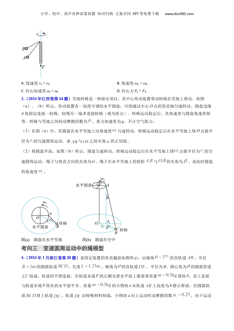 小学、初中、高中各种试卷真题知识归纳文案合同PPT等免费下载www.doc985.com考情概览:解读近年命题思路和内容要求,统计真题考查情况。2024年真题研析:分析命题特点,探寻常考要点,真题分类精讲。近年真题精选:分类精选近年真题,把握命题趋势。必备知识速记:归纳串联解题必备知识,总结易错易混点。名校模拟探源:精选适量名校模拟题,发掘高考命题之源。命题解读考向考查统计本类试题主要考查圆周运动的运动特点、受力特点,变速圆周运动中的绳模型与杆模型。匀速圆周运动常与电学进行综合。要求能根据问题情景选择合适的向心加速度的表达式。考向一圆周运动的运动特点2024·辽宁卷,22022·山东卷,82021·全国甲卷,22021·广东卷,4考向二匀速圆周运动中的受力特点2024·江苏卷,102024·江西卷,142023·北京卷,102023·福建卷,152023·江苏卷,132023·全国甲卷,42021·河北卷,9考向三变速圆周运动中的绳模型2024·浙江1月,202024·河北卷,142023·北京卷,182023·湖北卷,142023·浙江1月,182021·浙江卷,72021·浙江卷,212022·全国甲卷,1考向四变速圆周运动中的杆模型2024·湖南卷,152024·全国甲卷,42024·山东卷,17小学、初中、高中各种试卷真题知识归纳文案合同PPT等免费下载www.doc985.com2023·浙江6月,182022·浙江1月,202022·浙江6月,202022·全国乙卷,3考向五实验:探究向心力大小的表达式2021·浙江1月,16(2)命题分析2024年高考各卷区物理试题均考查了各种圆周运动。预测2025年高考将继续考查各种圆周运动。试题精讲考向一圆周运动的运动特点1.(2024年辽宁卷第2题)“指尖转球”是花式篮球表演中常见的技巧。如图,当篮球在指尖上绕轴转动时,球面上P、Q两点做圆周运动的()A.半径相等B.线速度大小相等C.向心加速度大小相等D.角速度大小相等考向二匀速圆周运动中的受力特点2.(2024·江苏卷·第10题)(多选)如图所示,细绳穿过竖直的管子拴住一个小球,让小球在A高度处作水平面内的匀速圆周运动,现用力将细绳缓慢下拉,使小球在B高度处作水平面内的匀速圆周运动,不计一切摩擦,则()小学、初中、高中各种试卷真题知识归纳文案合同PPT等免费下载www.doc985.comA.线速度vA>vBB.角速度ωA<ωBC.向心加速度aA<aBD.向心力FA>FB3.(2024年江西卷第14题)雪地转椅是一种游乐项目,其中心传动装置带动转椅在雪地上滑动。如图(a)、(b)所示,传动装置有一高度可调的水平圆盘,可绕通过中心O点的竖直轴匀速转动。圆盘边缘A处固定连接一轻绳,轻绳另一端B连接转椅(视为质点)。转椅运动稳定后,其角速度与圆盘角速度相等。转椅与雪地之间的动摩擦因数为,重力加速度为g,不计空气阻力。(1)在图(a)中,若圆盘在水平雪地上以角速度匀速转动,转椅运动稳定后在水平雪地上绕O点做半径为的匀速圆周运动。求与之间夹角的正切值。(2)将圆盘升高,如图(b)所示。圆盘匀速转动,转椅运动稳定后在水平雪地上绕点做半径为的匀速圆周运动,绳子与竖直方向的夹角为,绳子在水平雪地上的投影与的夹角为。求此时圆盘的角速度。考向三变速圆周运动中的绳模型4.(2024年1月浙江卷第20题)某固定装置的竖直截面如图所示,由倾角的直轨道,半径的圆弧轨道,长度、倾角为的直轨道,半径为R、圆心角为的圆弧管道组成,轨道间平滑连接。在轨道末端F的右侧光滑水平面上紧靠着质量滑块b,其上表面与轨道末端F所在的水平面平齐。质量的小物块a从轨道上高度为h静止释放,经圆弧轨道滑上轨道,轨道由特殊材料制成,小物块a向上运动时动摩擦因数,向下运动小学、初中、高中各种试卷真题知识归纳文案合同PPT等免费下载www.doc985.com时动摩擦因数,且最大静摩擦力等于滑动摩擦力。当小物块a滑块b上滑动时动摩擦因数恒为,小物块a动到滑块右侧的竖直挡板能发生完全弹性碰撞。(其它轨道均光滑,小物块视为质点,不计空气阻力,,)(1)若,求小物块①第一次经过C点的向心加速度大小;②在上经过的总路程;③在上向上运动时间和向下运动时间之比。(2)若,滑块至少多长才能使小物块不脱离滑块。5.(2024年湖北卷第14题)如图所示,水平传送带以5m/s的速度...