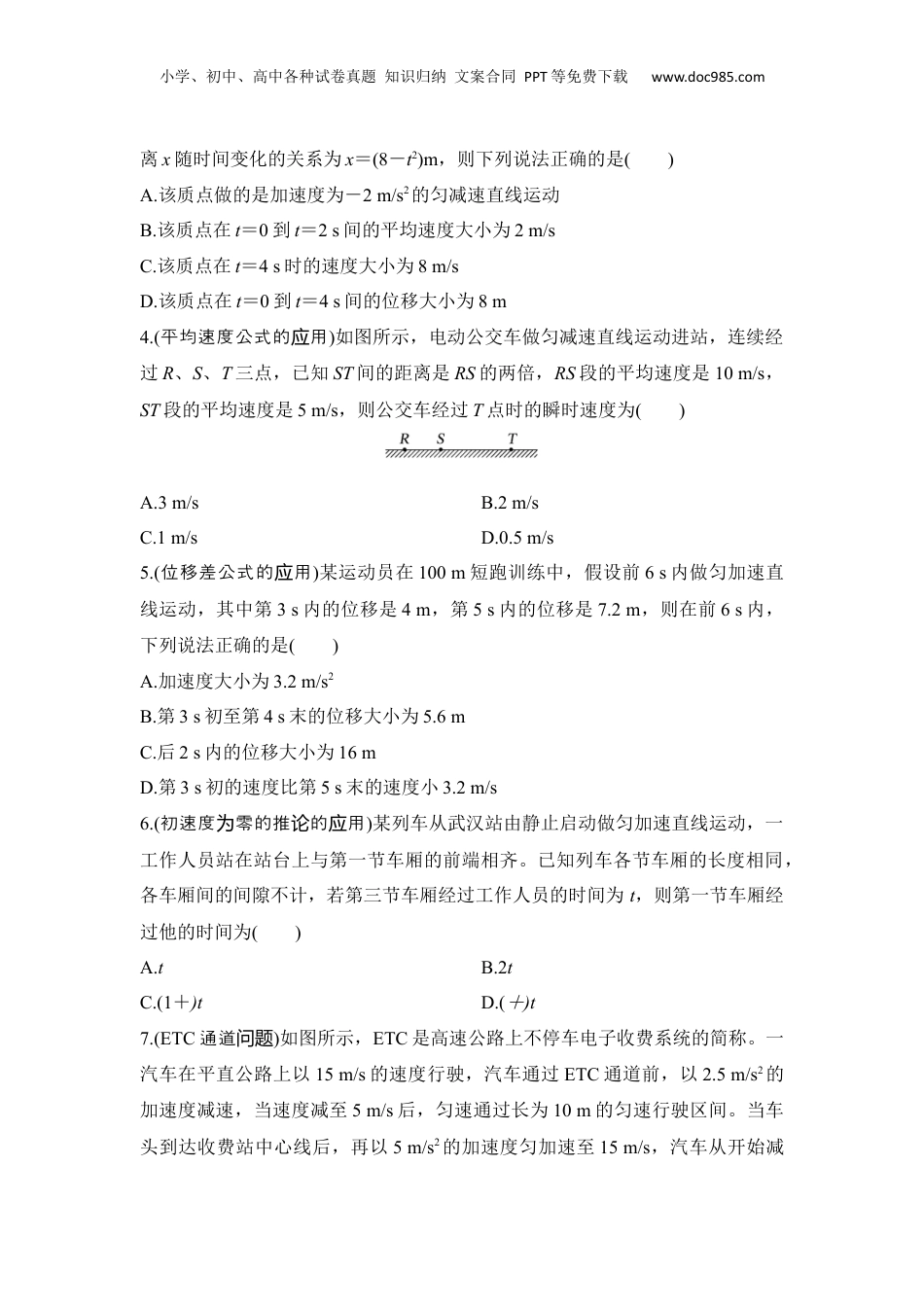 小学、初中、高中各种试卷真题知识归纳文案合同PPT等免费下载www.doc985.com选择题考点专项1匀变速直线运动规律的应用1.(速度位移公式的用应)“福建舰”是中国完全自主设计建造的首艘电磁弹射型航空母舰。采用平直通长飞行甲板,如图所示。某舰载机由弹射系统提供30m/s的初速度,在甲板的跑道上以5m/s2的加速度做匀加速直线运动,当舰载机速度达到50m/s时能离开航空母舰起飞。下列说法正确的是()A.航空母舰静止,舰载机需在甲板上加速滑行10s起飞B.航空母舰静止,舰载机需在甲板上加速滑行160m起飞C.研究航空母舰在海上运动的时间,航空母舰不可以看成质点D.研究舰载机在航空母舰上加速运动的时间,舰载机不可以看成质点2.(位移公式的用时间应)具有完全自主知识产权的“复兴号”动车组以安全快捷、平稳舒适、高品质的运营服务成为中国高铁的一张亮丽名片。一列有8节车厢的“复兴号”动车组从某地高铁站开出,做匀加速直线运动,车头经过路边一保持不动的工作人员时速度大小为6m/s,车尾经过该工作人员时速度大小为8m/s。每节车厢的长度相等,则前4节车厢经过工作人员的时间与后4节车厢经过工作人员的时间之比为()A.B.C.+1D.-13.(待定系法求量数运动参)(多选)一质点沿直线Ox方向运动,它离开O点的距小学、初中、高中各种试卷真题知识归纳文案合同PPT等免费下载www.doc985.com离x随时间变化的关系为x=(8-t2)m,则下列说法正确的是()A.该质点做的是加速度为-2m/s2的匀减速直线运动B.该质点在t=0到t=2s间的平均速度大小为2m/sC.该质点在t=4s时的速度大小为8m/sD.该质点在t=0到t=4s间的位移大小为8m4.(平均速度公式的用应)如图所示,电动公交车做匀减速直线运动进站,连续经过R、S、T三点,已知ST间的距离是RS的两倍,RS段的平均速度是10m/s,ST段的平均速度是5m/s,则公交车经过T点时的瞬时速度为()A.3m/sB.2m/sC.1m/sD.0.5m/s5.(位移差公式的用应)某运动员在100m短跑训练中,假设前6s内做匀加速直线运动,其中第3s内的位移是4m,第5s内的位移是7.2m,则在前6s内,下列说法正确的是()A.加速度大小为3.2m/s2B.第3s初至第4s末的位移大小为5.6mC.后2s内的位移大小为16mD.第3s初的速度比第5s末的速度小3.2m/s6.(初速度零的推的用为论应)某列车从武汉站由静止启动做匀加速直线运动,一工作人员站在站台上与第一节车厢的前端相齐。已知列车各节车厢的长度相同,各车厢间的间隙不计,若第三节车厢经过工作人员的时间为t,则第一节车厢经过他的时间为()A.tB.2tC.(1+)tD.(+)t7.(ETC通道问题)如图所示,ETC是高速公路上不停车电子收费系统的简称。一汽车在平直公路上以15m/s的速度行驶,汽车通过ETC通道前,以2.5m/s2的加速度减速,当速度减至5m/s后,匀速通过长为10m的匀速行驶区间。当车头到达收费站中心线后,再以5m/s2的加速度匀加速至15m/s,汽车从开始减小学、初中、高中各种试卷真题知识归纳文案合同PPT等免费下载www.doc985.com速至回到原行驶速度的过程,下列判断正确的是()A.通过的最短距离为60mB.通过的最短距离为70mC.所用的最短时间为4sD.所用的最短时间为6s小学、初中、高中各种试卷真题知识归纳文案合同PPT等免费下载www.doc985.com选择题考点专项1匀变速直线运动规律的应用1.B[机需在甲板上滑行的舰载时间为t==s=4s,A;机在甲板错误舰载上滑行的距离为x=t=×4m=160m,B正确;究航空母在海上的研舰运动时间,航空母的度的究影很小,航空母可以看成点,舰长对问题研响舰质C;错误研究机在航空母上加速的,机大小和形的影可以舰载舰运动时间舰载状对问题响忽略,机可以看成点,舰载质D。错误]2.A[第设4通工作人速度节车厢刚过该员时为v1,则v1==m/s=5m/s,设每的度节车厢长为L,前四工作人的节车厢经过员时间为t1===s,后四节车工作人的厢经过员时间为t2===s,有=,故A正确。]3.BC[离开O点的距离x化的系随时间变关为x=(8-t2)m,由速直匀变线运的位移公式动x=v0t+at2可知,点的初速度质v0=0m/s,加速度a=-2m/s2,点沿质x方向做加速度大小轴负为2m/s2的加速直,故匀线运动A;点错误质在t=2s的速度时为v2=at2=-2×2m/s=-4m/s,点在质t=0...