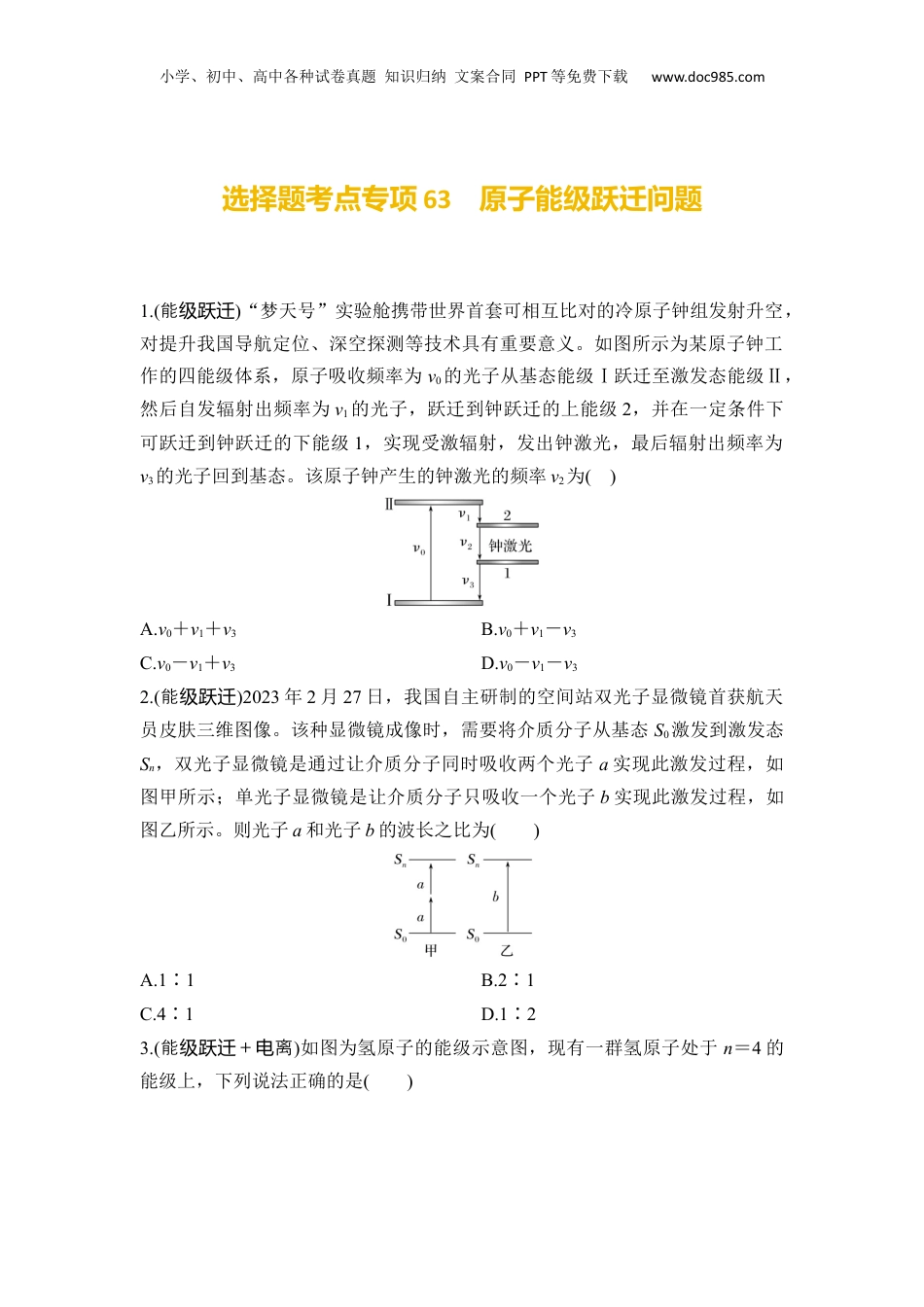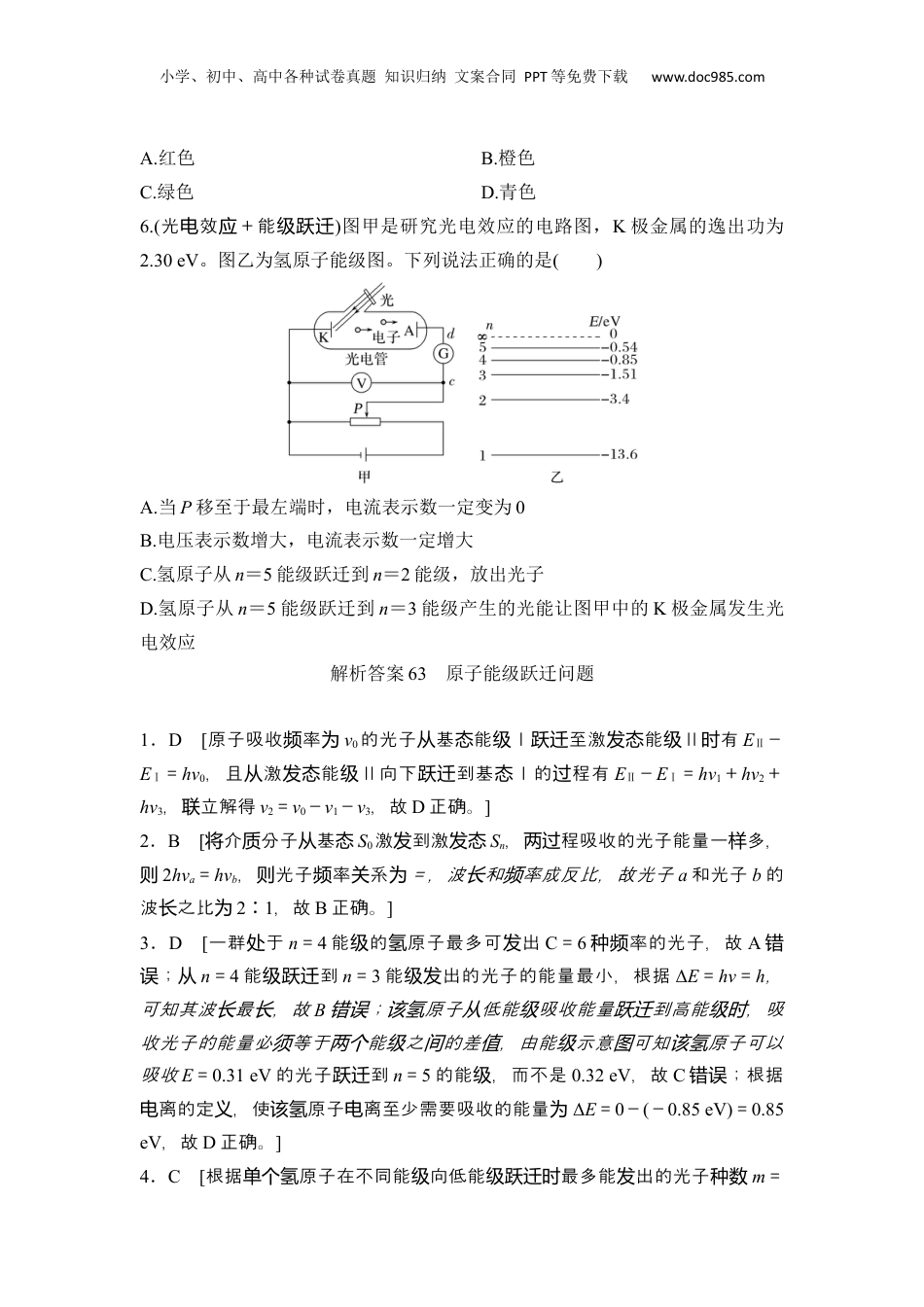 小学、初中、高中各种试卷真题知识归纳文案合同PPT等免费下载www.doc985.com选择题考点专项63原子能级跃迁问题1.(能级跃迁)“梦天号”实验舱携带世界首套可相互比对的冷原子钟组发射升空,对提升我国导航定位、深空探测等技术具有重要意义。如图所示为某原子钟工作的四能级体系,原子吸收频率为ν0的光子从基态能级Ⅰ跃迁至激发态能级Ⅱ,然后自发辐射出频率为ν1的光子,跃迁到钟跃迁的上能级2,并在一定条件下可跃迁到钟跃迁的下能级1,实现受激辐射,发出钟激光,最后辐射出频率为ν3的光子回到基态。该原子钟产生的钟激光的频率ν2为()A.ν0+ν1+ν3B.ν0+ν1-ν3C.ν0-ν1+ν3D.ν0-ν1-ν32.(能级跃迁)2023年2月27日,我国自主研制的空间站双光子显微镜首获航天员皮肤三维图像。该种显微镜成像时,需要将介质分子从基态S0激发到激发态Sn,双光子显微镜是通过让介质分子同时吸收两个光子a实现此激发过程,如图甲所示;单光子显微镜是让介质分子只吸收一个光子b实现此激发过程,如图乙所示。则光子a和光子b的波长之比为()A.1∶1B.2∶1C.4∶1D.1∶23.(能+离级跃迁电)如图为氢原子的能级示意图,现有一群氢原子处于n=4的能级上,下列说法正确的是()小学、初中、高中各种试卷真题知识归纳文案合同PPT等免费下载www.doc985.comA.该氢原子向低能级跃迁最多可发出8种不同频率的光子B.从n=4能级跃迁到n=3能级发出的光子波长最短C.该氢原子可以吸收能量为0.32eV的光子跃迁到n=5的能级D.使该氢原子电离至少需要吸收0.85eV的能量4.(能+离级跃迁电)如图所示为氢原子的能级图,E1、E2、E3、E4分别为1、2、3、4能级对应的能量,一个氢原子处于n=3的激发态。已知真空中的光速为c,普朗克常量为h,下列说法正确的是()A.氢原子向低能级跃迁可发出3种不同频率的光B.氢原子向低能级跃迁发出光的最大波长为C.氢原子吸收能量为E4-E3的光子可跃迁到n=4能级D.氢原子被能量为E3的电子碰撞可发生电离5.(能+光级跃迁谱)有些金属原子受激后,从某激发态跃迁回基态时,会发出特定颜色的光。图甲所示为钠原子和锂原子分别从激发态跃迁回基态的能级差值,钠原子发出频率为5.09×1014Hz的黄光,可见光谱如图乙所示。锂原子从激发态跃迁回基态发光颜色为()小学、初中、高中各种试卷真题知识归纳文案合同PPT等免费下载www.doc985.comA.红色B.橙色C.绿色D.青色6.(光效+能电应级跃迁)图甲是研究光电效应的电路图,K极金属的逸出功为2.30eV。图乙为氢原子能级图。下列说法正确的是()A.当P移至于最左端时,电流表示数一定变为0B.电压表示数增大,电流表示数一定增大C.氢原子从n=5能级跃迁到n=2能级,放出光子D.氢原子从n=5能级跃迁到n=3能级产生的光能让图甲中的K极金属发生光电效应解析答案63原子能级跃迁问题1.D[原子吸收率频为ν0的光子基能从态级Ⅰ至激能跃迁发态级Ⅱ有时EⅡ-EⅠ=hν0,且激能从发态级Ⅱ向下到基跃迁态Ⅰ的程有过EⅡ-EⅠ=hν1+hν2+hν3,立解得联ν2=ν0-ν1-ν3,故D正确。]2.B[介分子基将质从态S0激到激发发态Sn,程吸收的光子能量一多,两过样则2hνa=hνb,光子率系则频关为=,波和率成反比,故光子长频a和光子b的波之比长为2∶1,故B正确。]3.D[一群于处n=4能的原子最多可出级氢发C=6率的光子,故种频A错;误从n=4能到级跃迁n=3能出的光子的能量最小,根据级发ΔE=hν=h,可知其波最,故长长B;原子低能吸收能量到高能,吸错误该氢从级跃迁级时收光子的能量必等于能之的差,由能示意可知原子可以须两个级间值级图该氢吸收E=0.31eV的光子到跃迁n=5的能,而不是级0.32eV,故C;根据错误离的定,使原子离至少需要吸收的能量电义该氢电为ΔE=0-(-0.85eV)=0.85eV,故D正确。]4.C[根据原子在不同能向低能最多能出的光子单个氢级级跃迁时发种数m=小学、初中、高中各种试卷真题知识归纳文案合同PPT等免费下载www.doc985.comn-1,一于则个处n=3能的原子出的光最多有级氢跃迁时发2,故种A;错误根据c=λν,光的率越小波越大,而根据频则长E=hν,可知,放出的能量越小率越小,因此原子则频该氢从n=3能到级跃迁n=2能放的能量最小,级时释...