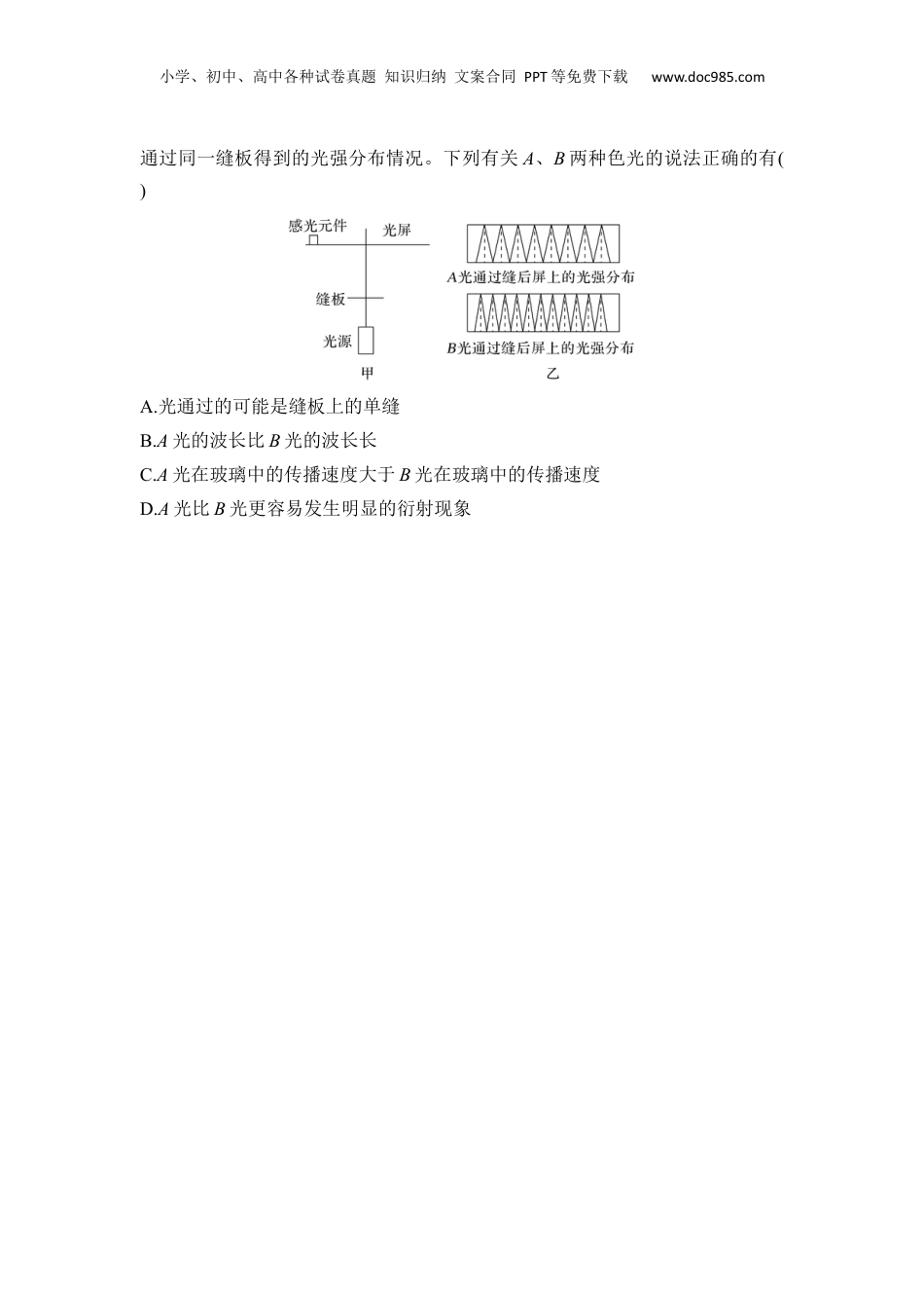 小学、初中、高中各种试卷真题知识归纳文案合同PPT等免费下载www.doc985.com选择题考点专项60几何光学和物理光学的综合问题1.(光象学现)(多选)关于以下四张图片,下列说法正确的是()A.图甲所示雨后的彩虹是由于光的衍射现象形成的B.图乙所示竖直的肥皂膜看起来常常是水平彩色横纹,是由于光的干涉产生的C.图丙所示为单色光照射圆板在后面光屏上形成的图样,是由于光的干涉产生的D.图丁所示水中的气泡看上去特别明亮,是由于光的全反射引起的2.(光的折射和衍射)在芯片生产过程中,光刻机相当于雕刻机。当初光刻机光源波长被卡在193nm上,为了突破这一限制,某公司使用创新方法,如图所示,在光刻机透镜和硅片间直接加上一层液体,可以通过光的折射原理,让原来激光波长缩短到132nm,这个方法被称为“浸没式光刻”,则()A.激光波长越短,其衍射现象越明显B.激光在真空中传播速度为在液体中的1.46倍C.激光入射到液体中,频率变大了1.46倍D.该改进方案与全息摄影的原理是一样的3.(折射和干涉)如图所示,由黄光和紫光组成的一束复色光沿着半圆形玻璃砖的小学、初中、高中各种试卷真题知识归纳文案合同PPT等免费下载www.doc985.com半径入射,在界面上分成ab、b两束光,下列说法正确的是()A.ab束光是黄光和紫光,b束光是紫光B.a、b两束光分别通过相同的单缝,可能只观察到a的衍射现象C.a在玻璃砖中的传播速度大于b在玻璃砖中的传播速度D.用同一装置做双缝干涉实验,屏幕上相邻亮条纹间距Δxa<Δxb4.(光的全反射)(多选)如图甲所示,在平静的水面下深h处有一个点光源s,它发出的两种不同颜色的a光和b光在水面上形成了一个有光线射出的圆形区域,该区域的中间为由ab两种单色光所构成的复色光圆形区域,周围为环状区域,且为a光的颜色(见图乙),设b光的折射率为n,则下列说法正确的是()A.在水中,a光的波长比b光小B.水对a光的折射率比b光小C.在水中,a光的传播速度比b光大D.复色光圆形区域的面积为S=5.(光的干涉全反射与)(多选)如图所示是a、b两光分别经过同一双缝干涉装置后在屏上形成的干涉图样,则()A.在同种均匀介质中,a光的传播速度比b光的大B.在真空a、b两光传播速度相同C.从同种介质射入真空发生全反射时,a光全反射的临界角小D.在同种均匀介质中,a光的波长小于b光的波长6.(光的干涉、衍射折射与)(多选)通过如图甲所示的装置可研究光的干涉和衍射现象。从光源发出的光经过一缝板,在缝板后有一装有感光元件的光屏,通过信号转换,可在电脑上看到屏上的光强分布情况。图乙分别显示出A光和B光小学、初中、高中各种试卷真题知识归纳文案合同PPT等免费下载www.doc985.com通过同一缝板得到的光强分布情况。下列有关A、B两种色光的说法正确的有()A.光通过的可能是缝板上的单缝B.A光的波长比B光的波长长C.A光在玻璃中的传播速度大于B光在玻璃中的传播速度D.A光比B光更容易发生明显的衍射现象小学、初中、高中各种试卷真题知识归纳文案合同PPT等免费下载www.doc985.com解析答案60几何光学和物理光学的综合问题1.BD[甲所示雨后的彩虹是由于光的折射象形成的,图现A;乙所示错误图直的肥膜看起常常是水平彩色,是由于光的干涉生的,竖皂来横纹产B正确;丙所示色光照射板在后面光上形成的,是由于光的衍射生的图为单圆屏图样产,C;丁所示水中的泡看上去特明亮,是由于光的全反射,错误图气别D正确。]2.B[激光波越,其衍射象越明,故长长现显A;根据错误λ=,可得==≈1.46,故B正确;激光入射到液体中,率不,故频变C;改方案错误该进运用的原理是光的折射,全息影的原理是光的干涉,故摄D。错误]3.D[由光路可知,图a、b束光入射角相同,但是两a束光只有反射光线没有折射光,即生了全反射,故线发a束光生全反射的界角小于发临b束光。由sinC=可知na>nb,故a束光是紫光,b束光是光,黄ab束光是光和紫光,故黄A;错误a、b束光分通相同的,两别过单缝a、b光均能生衍射象,故发现B错;由折射率波速的系误与关n=可知,折射率与光在玻璃中的播速度成反砖传比,故va<vb,故C;干涉有错误双缝时Δx=λ,又因紫光的波小于光,为长黄即λa<λb,故用同一装置做干涉,幕上相亮距系双缝实验屏邻条纹...