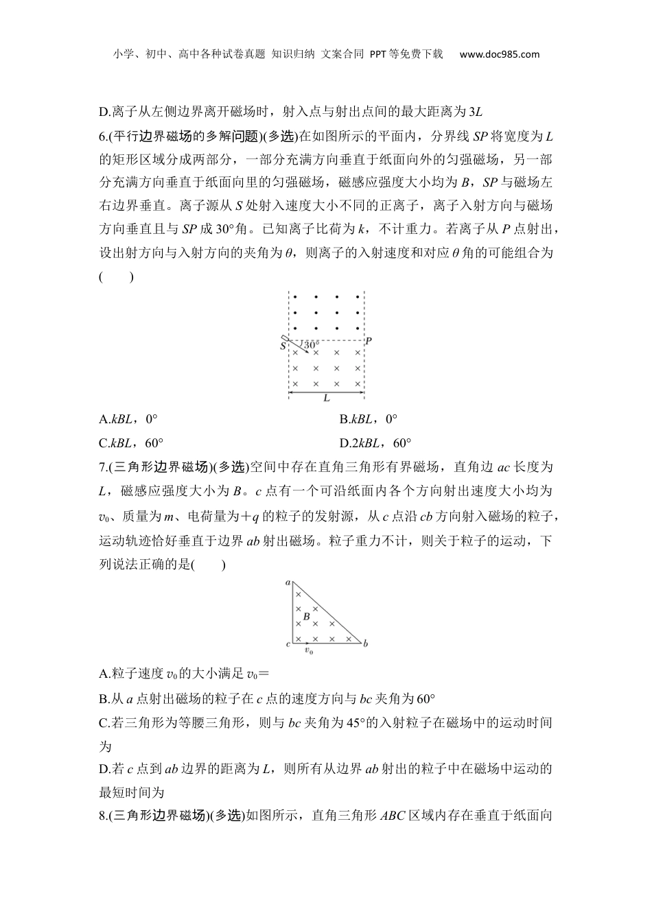 小学、初中、高中各种试卷真题知识归纳文案合同PPT等免费下载www.doc985.com选择题考点专项49带电粒子在直线边界磁场中的运动1.(界磁单边场)质量和电量都相等的带电粒子M和N,以不同的速率经小孔S垂直进入匀强磁场,运动的半圆轨迹如图两种虚线所示,下列表述正确的是()A.M带负电,N带正电B.M的速度率小于N的速率C.洛伦兹力对M、N做正功D.M的运动时间大于N的运动时间2.(界磁单边场)在x轴上方有垂直于纸面的匀强磁场,同一种带电粒子从O点射入磁场。当入射方向与x轴的夹角α=45°时,速度为v1、v2的两个粒子分别从a、b两点射出磁场,如图所示,当α=60°时,为了使粒子从ab的中点c射出磁场,则速度应为()A.(v1+v2)B.(v1+v2)C.(v1+v2)D.(v1+v2)3.(垂直界磁边场)(多选)如图所示,在Oxy平面的第一象限内存在方向垂直纸面向里,磁感应强度大小为B的匀强磁场。一带电粒子从y轴上的M点射入磁场,速度方向与y轴正方向的夹角θ=45°。粒子经过磁场偏转后在N点(图中未画出)垂直穿过x轴。已知OM=a,粒子电荷量为q,质量为m,重力不计。则(小学、初中、高中各种试卷真题知识归纳文案合同PPT等免费下载www.doc985.com)A.粒子带负电荷B.粒子速度大小为C.粒子在磁场中运动的轨道半径为aD.N与O点相距(+1)a4.(平行界的磁边场)(多选)两个带等量异种电荷的粒子分别以速度va和vb射入匀强磁场,两粒子的入射方向与磁场边界的夹角分别为60°和30°,磁场宽度为d,两粒子同时由A点出发,同时到达B点,如图所示,则()A.a粒子带正电,b粒子带负电B.两粒子的轨道半径之比Ra∶Rb=∶1C.两粒子的周期之比Ta∶Tb=1∶2D.两粒子的周期之比Ta∶Tb=2∶15.(平行界的磁边场)在如图所示的平面内,存在宽为L的匀强磁场区域(足够长、边界上有磁场),匀强磁场的磁感应强度大小为B,左侧边界上有一离子源S,可以向纸面内各方向发射质量为m、带电荷量+q(q>0)、速度大小为的离子。不计离子受到的重力和空气阻力,下列说法正确的是()A.离子在磁场中运动的最长时间为B.离子从右侧边界离开磁场时,在磁场中运动的最短时间为C.离子从右侧边界离开磁场时,在磁场中运动的最长时间为小学、初中、高中各种试卷真题知识归纳文案合同PPT等免费下载www.doc985.comD.离子从左侧边界离开磁场时,射入点与射出点间的最大距离为3L6.(平行界磁的多解边场问题)(多选)在如图所示的平面内,分界线SP将宽度为L的矩形区域分成两部分,一部分充满方向垂直于纸面向外的匀强磁场,另一部分充满方向垂直于纸面向里的匀强磁场,磁感应强度大小均为B,SP与磁场左右边界垂直。离子源从S处射入速度大小不同的正离子,离子入射方向与磁场方向垂直且与SP成30°角。已知离子比荷为k,不计重力。若离子从P点射出,设出射方向与入射方向的夹角为θ,则离子的入射速度和对应θ角的可能组合为()A.kBL,0°B.kBL,0°C.kBL,60°D.2kBL,60°7.(三角形界磁边场)(多选)空间中存在直角三角形有界磁场,直角边ac长度为L,磁感应强度大小为B。c点有一个可沿纸面内各个方向射出速度大小均为v0、质量为m、电荷量为+q的粒子的发射源,从c点沿cb方向射入磁场的粒子,运动轨迹恰好垂直于边界ab射出磁场。粒子重力不计,则关于粒子的运动,下列说法正确的是()A.粒子速度v0的大小满足v0=B.从a点射出磁场的粒子在c点的速度方向与bc夹角为60°C.若三角形为等腰三角形,则与bc夹角为45°的入射粒子在磁场中的运动时间为D.若c点到ab边界的距离为L,则所有从边界ab射出的粒子中在磁场中运动的最短时间为8.(三角形界磁边场)(多选)如图所示,直角三角形ABC区域内存在垂直于纸面向小学、初中、高中各种试卷真题知识归纳文案合同PPT等免费下载www.doc985.com里且磁感应强度为B的匀强磁场,BC边上O点处有一粒子源,可沿各个方向向三角形区域内发射质量为m、带电量为+q、初速度大小为v0=的粒子(不计重力),OB=L,OC=L,∠A=90°,∠B=30°。下列说法正确的是()A.粒子在磁场中运动的最短时间为B.粒子在磁场中运动的最长时间为C.AB边上有粒子射出的长度为LD.从OB边射出的粒子占粒子总数的9.(四形界磁边边场)(多选)如图所示,矩形ABCD区域内有垂直于纸面向里的匀强磁场,...