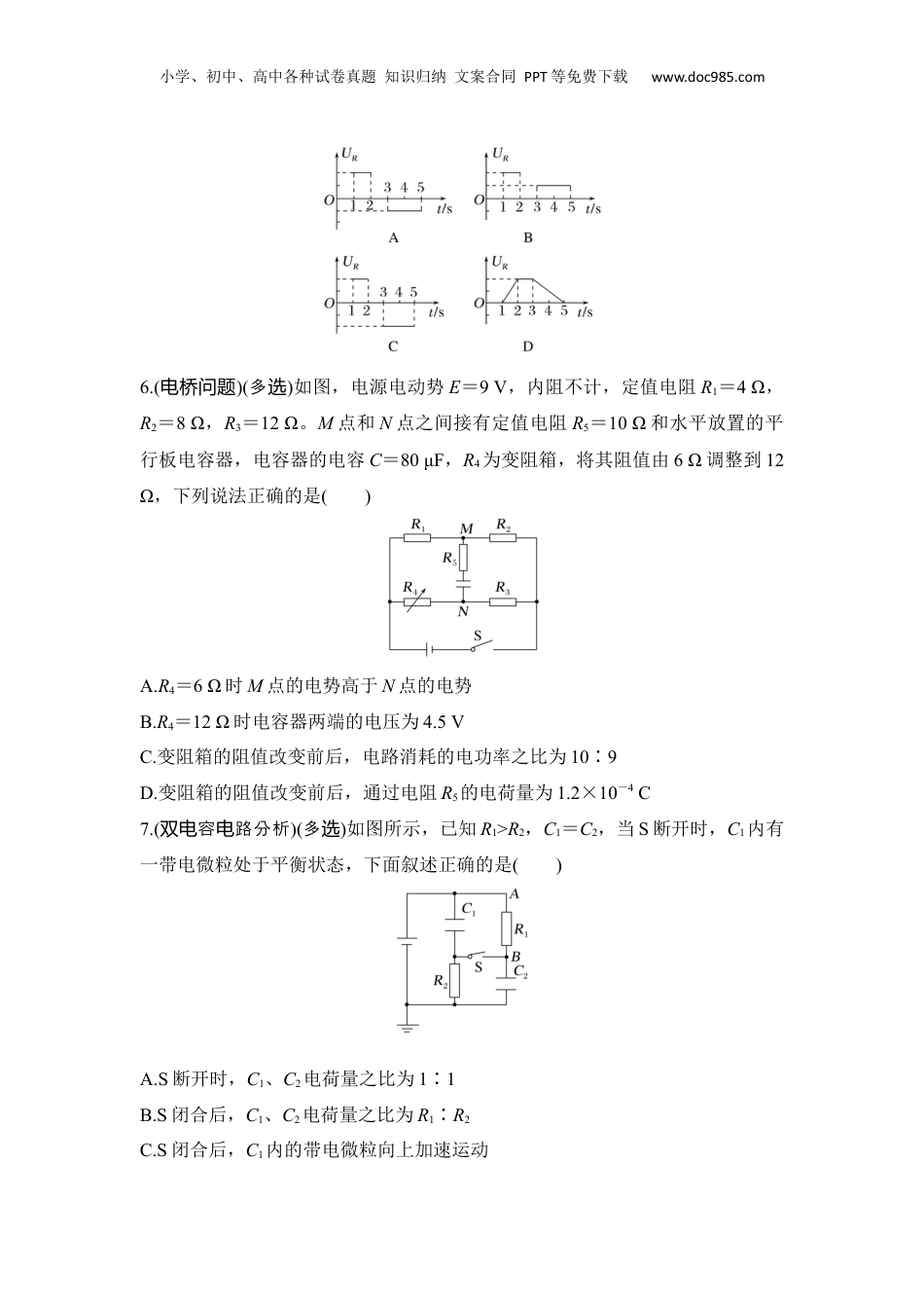 小学、初中、高中各种试卷真题知识归纳文案合同PPT等免费下载www.doc985.com选择题考点专项47含电容的直流电路分析1.(平衡问题)如图所示,电路中R1、R2均为可变电阻,电源内阻不能忽略,平行板电容器C的极板水平放置,闭合开关S,电路达到稳定时,带电油滴悬浮在两板之间静止不动。如果仅改变下列某一个条件,油滴仍能静止不动的是()A.增大R1的阻值B.增大R2的阻值C.增大两板间的距离D.断开开关S2.(偏转问题)如图所示,M、N是两块水平放置的平行金属板,R0为定值电阻,R1、R2为可变电阻,开关S闭合。质量为m的带正电的微粒从P点以水平速度v0射入金属板间,沿曲线打在N板上的O点,若经下列调整后,微粒仍从P点以水平速度v0射入,则关于微粒打在N板上的位置说法正确的是()A.保持开关S闭合,增大R1,微粒打在O点左侧B.保持开关S闭合,增大R2,微粒打在O点左侧C.断开开关S,M极板稍微上移,微粒打在O点右侧D.断开开关S,M极板稍微下移,微粒打在O点右侧3.(量算参计)如图所示,电源电动势E=7V、内阻r=2Ω,电阻R=R1=R2=5Ω,R3=10Ω,电流表为理想电表,电容器的电容C=6μF,闭合开关S,电路小学、初中、高中各种试卷真题知识归纳文案合同PPT等免费下载www.doc985.com稳定后,下列说法正确的是()A.电流表示数为0.67AB.R3两端的电压为5VC.电容器所带的电量为3×10-5CD.若S断开,通过R2的电荷量为7.5×10-6C4.(分析动态)如图所示电路中,直流电源内阻r≠0,R1、R2为定值电阻,滑动变阻器最大阻值为R3,r<R1=R2<R3。开关S闭合且电路稳定后,滑动变阻器的滑片P缓慢从b向a滑动过程中()A.电流表示数变小B.电源的效率减小C.滑动变阻器消耗的功率一直增大D.通过R2的电流方向为从c到d5.(像图问题)图(a)所示的电路中,K与L间接一智能电源,用以控制电容器C两端的电压UC。如果UC随时间t的变化如图(b)所示,则下列描述电阻R两端电压UR随时间t变化的图像中,正确的是()小学、初中、高中各种试卷真题知识归纳文案合同PPT等免费下载www.doc985.com6.(电桥问题)(多选)如图,电源电动势E=9V,内阻不计,定值电阻R1=4Ω,R2=8Ω,R3=12Ω。M点和N点之间接有定值电阻R5=10Ω和水平放置的平行板电容器,电容器的电容C=80μF,R4为变阻箱,将其阻值由6Ω调整到12Ω,下列说法正确的是()A.R4=6Ω时M点的电势高于N点的电势B.R4=12Ω时电容器两端的电压为4.5VC.变阻箱的阻值改变前后,电路消耗的电功率之比为10∶9D.变阻箱的阻值改变前后,通过电阻R5的电荷量为1.2×10-4C7.(容路分析双电电)(多选)如图所示,已知R1>R2,C1=C2,当S断开时,C1内有一带电微粒处于平衡状态,下面叙述正确的是()A.S断开时,C1、C2电荷量之比为1∶1B.S闭合后,C1、C2电荷量之比为R1∶R2C.S闭合后,C1内的带电微粒向上加速运动小学、初中、高中各种试卷真题知识归纳文案合同PPT等免费下载www.doc985.comD.S闭合后,B点电势降低小学、初中、高中各种试卷真题知识归纳文案合同PPT等免费下载www.doc985.com解析答案47含电容的直流电路分析1.B[以油滴究象行受力分析可知,油滴止不,所受力重为研对进静动电场与力平衡,即mg=qE=q,欲使油滴仍能于平衡,保强度不现处状态则证电场发生化即可,变R1的不即可,中电压变题R2有流通,改没电过变R2路工作时对电无影,所以状态响B正确,A;而增大板距离,强度小,油错误两间时电场减滴下落,所以C;错误断开开关S,容器可阻成合回路,容时电与变电构闭电器放,油滴下落,所以电D。错误]2.A[MN板和两极间电压R0端相同,故板强度方向向上,两电压两极间电场微粒所受力方向向上;保持电场S合,增大闭R1,那,么R0端小,两电压减两板小,故强度小,微粒所受力小,合外力增大,粒子极间电压减电场减电场减加速度增大,粒子打在O点左,故侧A正确;保持S合,增大闭R2,板两极间不,故强度不,微粒受力不,粒子不,仍打在电压变电场变变运动变O点,故B;错误断开S,板端荷保持不,那由容极两电变么电C=,C=可知强度电场E==,不,那微粒受力不,粒子不,仍打在变么变运动变O点,故C、D错。误]3.B[由合路姆定律,可得闭电欧I=,依意路定后,容器所在支路题电稳电路,有断R外=...