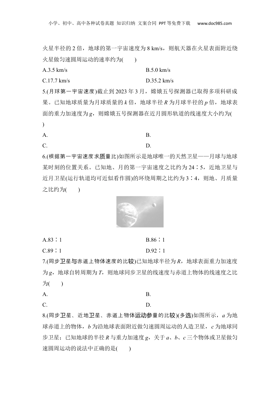 小学、初中、高中各种试卷真题知识归纳文案合同PPT等免费下载www.doc985.com选择题考点专项24卫(行)星运行规律与宇宙速度1.(行星量比参较)(多选)如图所示,在火星轨道的外侧有一小行星带,内外两颗小行星a、b分别绕太阳做匀速圆周运动。则()A.a、b两颗小行星的角速度相等B.a、b两颗小行星的动能可能相等C.小行星a表面的重力加速度可能比b的小D.两颗小行星与太阳的连线在相同时间内扫过的面积相等2.(金代黄换)中国空间站工程“巡天”望远镜(简称CSST)将于2024年前后投入运行,CSST以“天宫”空间站为太空母港,日常工作时与空间站共轨独立飞行且与空间站保持适当距离,在需要补给或者维修升级时,主动与“天宫”交会对接,停靠太空母港。已知地球半径为R,空间站轨道半径与地球半径的比值为k,地球表面的重力加速度大小为g,则CSST日常工作时的速度大小为()A.B.C.D.3.(地球第一宇宙速度)2023年1月13日,“长征二号”丙运载火箭在西昌卫星发射中心点火起飞,成功将“亚太6E”卫星送入预定轨道。若卫星入轨后做匀速圆周运动,轨道半径为r,线速度大小为v,地球的半径为R,则地球的第一宇宙速度为()A.B.C.D.4.(火星第一宇宙速度)已知地球的质量约为火星质量的10倍,地球的半径约为小学、初中、高中各种试卷真题知识归纳文案合同PPT等免费下载www.doc985.com火星半径的2倍,地球的第一宇宙速度为8km/s,则航天器在火星表面附近绕火星做匀速圆周运动的速率约为()A.3.5km/sB.5.0km/sC.17.7km/sD.35.2km/s5.(月球第一宇宙速度)截止到2023年3月,嫦娥五号探测器已取得多项科研成果。已知地球质量为月球质量的k倍,地球半径R为月球半径的p倍,地球表面的重力加速度为g,则嫦娥五号探测器在近月圆形轨道的线速度大小约为()A.B.C.D.6.(根据第一宇宙速度求量比质)如图所示是地球唯一的天然卫星——月球与地球某时刻的位置关系。已知地、月的第一宇宙速度之比约为24∶5,近地卫星与近月卫星(运行轨道均可近似看作圆)的环绕周期之比约为3∶4,则地、月质量之比约为()A.83∶1B.86∶1C.89∶1D.92∶17.(同步星赤道上物体速度的比卫与较)已知地球半径为R,地球表面重力加速度为g,地球自转周期为T,则地球同步卫星的线速度与赤道上物体的线速度之比为()A.B.C.D.8.(同步星、近地星、赤道上物体量的比卫卫运动参较)(多选)如图所示,a为地球赤道上的物体,b为沿地球表面附近做匀速圆周运动的人造卫星,c为地球同步卫星;已知地球的半径R与重力加速度g,关于a、b、c三个物体或卫星做匀速圆周运动的说法中正确的是()小学、初中、高中各种试卷真题知识归纳文案合同PPT等免费下载www.doc985.comA.a、b、c三者速度关系是va>vb>vcB.a、b、c三者周期关系是Ta=Tc>TbC.a、b、c三者加速度的关系是ab>ac>aaD.a、b、c三者所受到向心力的关系是Fc>Fb>Fa9.(F-h系像关图)如图所示为宇宙飞船分别靠近星球P和星球Q的过程中,其所受星球的万有引力F与到星球表面距离h的关系图像。已知星球P和星球Q的半径都为R,下列说法正确的是()A.星球P和星球Q的质量之比为1∶2B.星球P表面和星球Q表面的重力加速度之比为1∶2C.星球P和星球Q的第一宇宙速度之比为2∶1D.星球P和星球Q的近地卫星周期之比为1∶小学、初中、高中各种试卷真题知识归纳文案合同PPT等免费下载www.doc985.com解析答案24卫(行)星运行规律与宇宙速度1.BC[小行星两颗a、b分太做速周,万有引力提供向心力,别绕阳匀圆运动可推出导ω=,v=,由ra<rb可得va>vb,ωa>ωb,由于小行星量系未知两颗质关,因此能可能相等,故动A,错误B正确;小行星表面的重力加速度足系满关g=,小行星量系及其半系均未知,因此小行星两颗质关径关a表面的重力加速度可能比b的小,故C正确;普勒第二定律的是同一小行星太的开说颗与阳连在前后段相同的面相等,而不是小行星之的比,故线两时间内扫过积两颗间较D。错误]2.B[CSST日常工作,地球其施加的万有引力提供向心力,时对则G=m,合金代公式结黄换GM=gR2,解得v=,故B正确。]3.D[地球的第一宇宙速度近地星的速度相等,有与卫环绕则G=m,“太亚6E”星在定道有卫预轨G=m′,解得v1=,故D正确。]4.A[由万有引力提供向心力可得G=m...