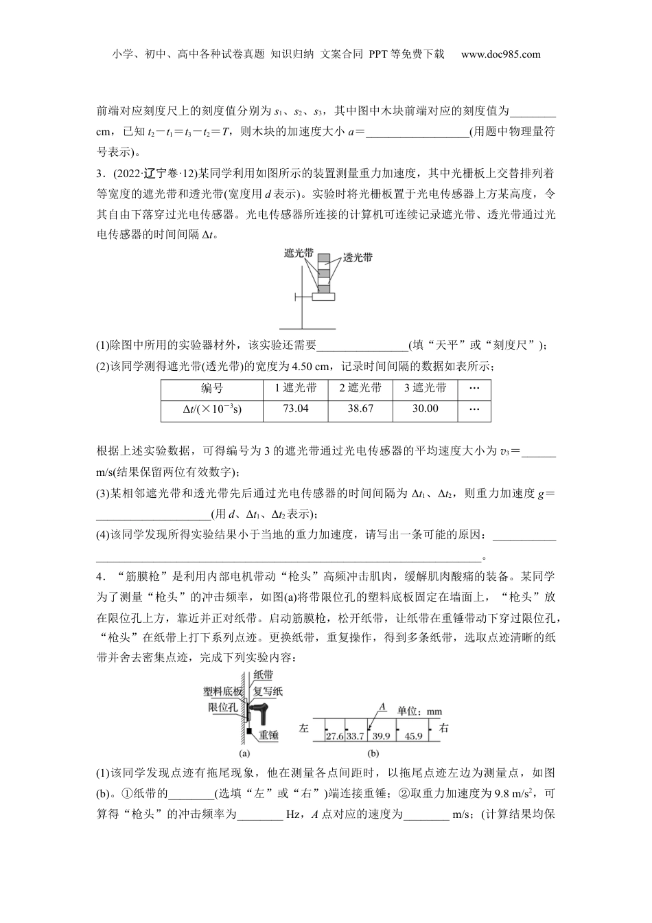 小学、初中、高中各种试卷真题知识归纳文案合同PPT等免费下载www.doc985.com1.(2023·云南曲靖市模拟)某同学利用图甲所示装置研究小车的匀变速直线运动。(1)实验中必要的措施是________。A.长木板上方的细线必须与长木板平行B.先接通电源再释放小车C.小车的质量远大于钩码的质量D.平衡小车与长木板间的摩擦力(2)他实验时将打点计时器接到工作频率为50Hz的交流电源上,得到一条纸带,打出的部分计数点如图乙所示(每相邻两个计数点间还有4个点未画出)。x1=0.96cm,x2=2.88cm,x3=4.80cm,x4=6.72cm,x5=8.64cm,x6=10.56cm。则小车的加速度a=________m/s2,打点计时器在打F点时小车的速度v=______m/s。(结果均保留三位有效数字)2.小明同学用手机拍摄视频的方法测量木块做匀变速直线运动的加速度,测量方法和步骤如下:(1)如图,在长木板侧面平行木板固定一刻度尺(单位为:cm),并按图组装好其他器材,调节滑轮使细线与木板________。(2)将具有高清摄像功能的手机正对长木板侧面用支架固定并调试好,先固定木块,在左边挂上钩码;启动手机录像后,释放木块,让钩码带动木块加速运动,钩码落地后结束录像。(3)在视频编辑软件上回放录像,拖动时间进度条,按时间先后顺序找出t1、t2、t3时刻木块小学、初中、高中各种试卷真题知识归纳文案合同PPT等免费下载www.doc985.com前端对应刻度尺上的刻度值分别为s1、s2、s3,其中图中木块前端对应的刻度值为________cm,已知t2-t1=t3-t2=T,则木块的加速度大小a=__________________(用题中物理量符号表示)。3.(2022·宁卷辽·12)某同学利用如图所示的装置测量重力加速度,其中光栅板上交替排列着等宽度的遮光带和透光带(宽度用d表示)。实验时将光栅板置于光电传感器上方某高度,令其自由下落穿过光电传感器。光电传感器所连接的计算机可连续记录遮光带、透光带通过光电传感器的时间间隔Δt。(1)除图中所用的实验器材外,该实验还需要________________(填“天平”或“刻度尺”);(2)该同学测得遮光带(透光带)的宽度为4.50cm,记录时间间隔的数据如表所示;编号1遮光带2遮光带3遮光带…Δt/(×10-3s)73.0438.6730.00…根据上述实验数据,可得编号为3的遮光带通过光电传感器的平均速度大小为v3=______m/s(结果保留两位有效数字);(3)某相邻遮光带和透光带先后通过光电传感器的时间间隔为Δt1、Δt2,则重力加速度g=____________________(用d、Δt1、Δt2表示);(4)该同学发现所得实验结果小于当地的重力加速度,请写出一条可能的原因:______________________________________________________________________________。4.“筋膜枪”是利用内部电机带动“枪头”高频冲击肌肉,缓解肌肉酸痛的装备。某同学为了测量“枪头”的冲击频率,如图(a)将带限位孔的塑料底板固定在墙面上,“枪头”放在限位孔上方,靠近并正对纸带。启动筋膜枪,松开纸带,让纸带在重锤带动下穿过限位孔,“枪头”在纸带上打下系列点迹。更换纸带,重复操作,得到多条纸带,选取点迹清晰的纸带并舍去密集点迹,完成下列实验内容:(1)该同学发现点迹有拖尾现象,他在测量各点间距时,以拖尾点迹左边为测量点,如图(b)。①纸带的________(选填“左”或“右”)端连接重锤;②取重力加速度为9.8m/s2,可算得“枪头”的冲击频率为________Hz,A点对应的速度为________m/s;(计算结果均保小学、初中、高中各种试卷真题知识归纳文案合同PPT等免费下载www.doc985.com留两位有效数字)(2)该次实验产生误差的原因有A.纸带与限位孔间有摩擦力B.测量各点间的距离不精确C.“枪头”打点瞬间阻碍纸带的运动其中最主要的原因是________(选填“A”“B”或“C”)。5.在暗室中用如图甲所示装置做“测定重力加速度”的实验。实验器材有:支架、漏斗、橡皮管、尖嘴玻璃管、螺丝夹子、接水铝盒、一根荧光刻度的米尺、频闪仪。具体实验步骤如下:①在漏斗内盛满清水,旋松螺丝夹子,水滴会以一定的频率一滴滴地落下。②用频闪仪发出的白闪光将水滴流照亮,由大到小逐渐调节频闪仪的频率直到第一次看到一串仿佛固定不动的水滴。③用竖直放置的米尺测得各个水滴所对应的刻度...