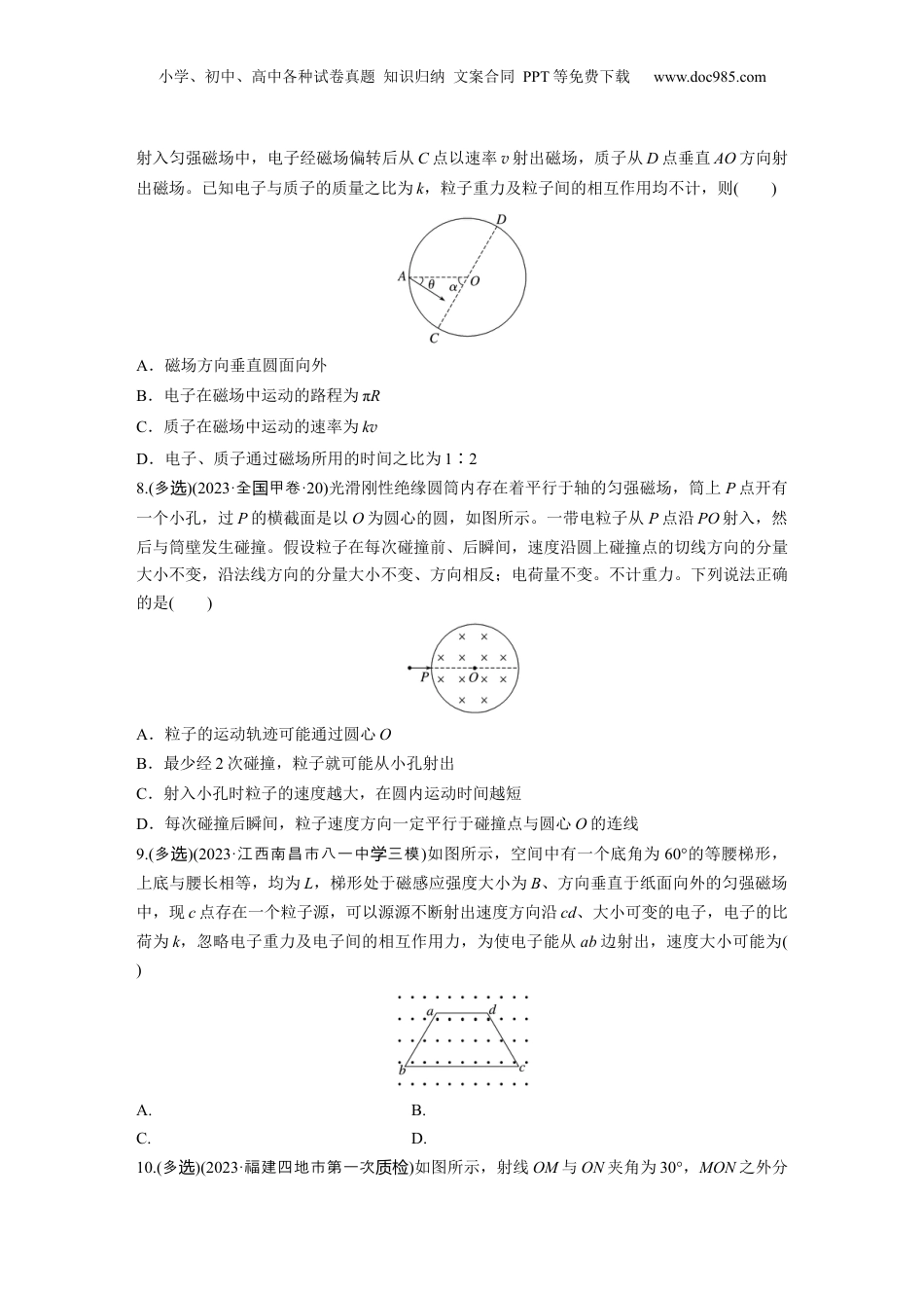 小学、初中、高中各种试卷真题知识归纳文案合同PPT等免费下载www.doc985.com1.(多选)如图所示,虚线MN上方存在匀强磁场,磁感应强度大小为B。一群电子以不同速率从边界MN上的P点以相同的入射方向射入磁场。其中某一速率为v的电子从Q点射出边界.已知电子入射方向与边界MN的夹角为θ,则()A.该匀强磁场的方向垂直纸面向里B.所有电子在磁场中的轨迹半径相等C.速率越大的电子在磁场中运动时间越长D.在此过程中每个电子的速度方向都改变2θ2.(多选)如图所示,一单边有界磁场的边界上有一粒子源,以与水平方向成θ角的不同速率向磁场中射入两个相同的粒子1和2,粒子1经磁场偏转后从边界上A点出磁场,粒子2经磁场偏转后从边界上B点出磁场,OA=AB,则()A.粒子1与粒子2的动能之比为1∶2B.粒子1与粒子2的动能之比为1∶4C.粒子1与粒子2在磁场中运动的弧长之比为1∶1D.粒子1与粒子2在磁场中运动的弧长之比为1∶23.(多选)(2024·北京市模拟)如图所示,匀强磁场限定在一个圆形区域内,磁感应强度大小为B,一个质量为m、电荷量为q、初速度大小为v的带电粒子沿磁场区域的直径方向从P点射入磁场,从Q点沿半径方向射出磁场,粒子射出磁场时的速度方向与射入磁场时相比偏转了θ角,忽略粒子重力,下列说法正确的是()A.粒子带负电小学、初中、高中各种试卷真题知识归纳文案合同PPT等免费下载www.doc985.comB.粒子在磁场中运动的轨迹长度为C.粒子在磁场中运动的时间为D.圆形磁场区域的半径为tanθ4.如图,边长为l的正方形abcd内存在匀强磁场,磁感应强度大小为B,方向垂直于纸面(abcd所在平面)向外。ab边中点有一电子发射源O,可向磁场内沿垂直于ab边的方向发射电子。已知电子的比荷为k。则从a、d两点射出的电子的速度大小分别为()A.kBl,kBlB.kBl,kBlC.kBl,kBlD.kBl,kBl5.如图所示,四分之一圆区域OMN内存在方向垂直纸面向外的匀强磁场,P点为半径OM的中点。现有两个带电粒子a、b,以相同的速度先后从P点沿平行ON方向射入磁场,并分别从N、M两点射出磁场。不计粒子所受重力及粒子间相互作用。则粒子a、b在磁场中运动周期之比为()A.5∶1B.1∶5C.2∶3D.3∶26.(2023·四川江市第六中模内学拟)如图所示,两方向相反、磁感应强度大小均为B的匀强磁场被边长为L的等边三角形ABC边界分开,三角形内磁场方向垂直纸面向里,三角形顶点A处有一质子源,能沿∠BAC的角平分线发射速度不同的质子(质子重力不计),所有质子均能通过C点,质子比荷=,忽略子重力和子的相互作用,子的速度不可能质质间则质为()A.B.C.D.7.(多选)如图,半径为R的圆形区域(纸面)内存在着匀强磁场,磁场方向垂直于纸面,半径OA与半径OC夹角α=60°,CD为直径。电子、质子均从A点沿与OA夹角θ=30°方向垂直小学、初中、高中各种试卷真题知识归纳文案合同PPT等免费下载www.doc985.com射入匀强磁场中,电子经磁场偏转后从C点以速率v射出磁场,质子从D点垂直AO方向射出磁场。已知电子与质子的质量之比为k,粒子重力及粒子间的相互作用均不计,则()A.磁场方向垂直圆面向外B.电子在磁场中运动的路程为πRC.质子在磁场中运动的速率为kvD.电子、质子通过磁场所用的时间之比为1∶28.(多选)(2023·全甲卷国·20)光滑刚性绝缘圆筒内存在着平行于轴的匀强磁场,筒上P点开有一个小孔,过P的横截面是以O为圆心的圆,如图所示。一带电粒子从P点沿PO射入,然后与筒壁发生碰撞。假设粒子在每次碰撞前、后瞬间,速度沿圆上碰撞点的切线方向的分量大小不变,沿法线方向的分量大小不变、方向相反;电荷量不变。不计重力。下列说法正确的是()A.粒子的运动轨迹可能通过圆心OB.最少经2次碰撞,粒子就可能从小孔射出C.射入小孔时粒子的速度越大,在圆内运动时间越短D.每次碰撞后瞬间,粒子速度方向一定平行于碰撞点与圆心O的连线9.(多选)(2023·江西南昌市八一中三模学)如图所示,空间中有一个底角为60°的等腰梯形,上底与腰长相等,均为L,梯形处于磁感应强度大小为B、方向垂直于纸面向外的匀强磁场中,现c点存在一个粒子源,可以源源不断射出速度方向沿cd、大小可变的电子,电子的比荷为k,忽略电子重力及电子间的相互作用力,为使...