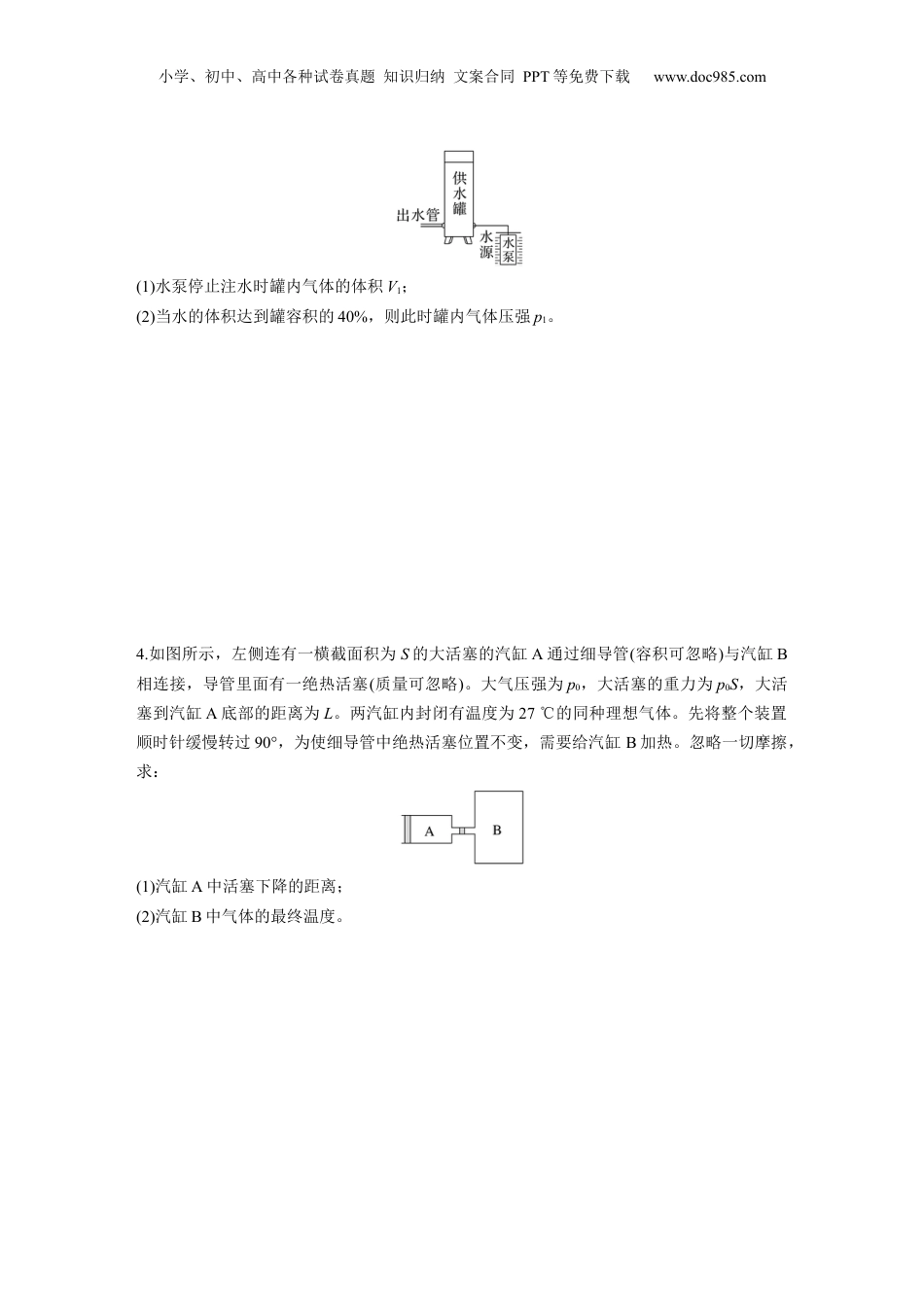 小学、初中、高中各种试卷真题知识归纳文案合同PPT等免费下载www.doc985.com1.(2023·江南京市模苏拟)如图所示,A、B是两个面积不等的活塞,可以在水平固定的两端开口的汽缸内无摩擦地滑动,缸内密封的气体为理想气体。随着温度降低,描述气体状态变化的图像可能正确的是()2.(2023·山聊城市二模东)如图甲所示,水平放置的汽缸被两个活塞分为A、B、C三部分,C为真空,A、B中有理想气体,A中气体压强p0=1.0×105Pa,汽缸横截面积SA=2SB=20cm2,两个活塞总质量为m,活塞到两汽缸底部的距离均为d=3cm,活塞之间用水平轻杆连接。现将汽缸顺时针缓慢转过90°,如图乙所示(活塞未到汽缸连接处),取重力加速度g=10m/s2,若活塞移动的距离为1cm,气体温度保持不变,则活塞质量m为()A.7.5kgB.15kgC.25kgD.30kg3.(2024·重市八中庆检测)某种供水装置工作原理如图所示。由水泵将水压入罐体,当罐内气体压强增加到3p0时,水泵停止抽水。供水时罐内水位下降,罐内气体压强减小到1.5p0时,水泵重新启动,可如此反复供水。罐容积为V0,第一次注水前罐内气体压强等于外界大气压强p0,此时罐内气体体积与罐容积相等,注水、供水过程中罐内气体总质量不变,罐内气体可视为理想气体,忽略温度变化。求:小学、初中、高中各种试卷真题知识归纳文案合同PPT等免费下载www.doc985.com(1)水泵停止注水时罐内气体的体积V1;(2)当水的体积达到罐容积的40%,则此时罐内气体压强p1。4.如图所示,左侧连有一横截面积为S的大活塞的汽缸A通过细导管(容积可忽略)与汽缸B相连接,导管里面有一绝热活塞(质量可忽略)。大气压强为p0,大活塞的重力为p0S,大活塞到汽缸A底部的距离为L。两汽缸内封闭有温度为27℃的同种理想气体。先将整个装置顺时针缓慢转过90°,为使细导管中绝热活塞位置不变,需要给汽缸B加热。忽略一切摩擦,求:(1)汽缸A中活塞下降的距离;(2)汽缸B中气体的最终温度。小学、初中、高中各种试卷真题知识归纳文案合同PPT等免费下载www.doc985.com5.(2023·江西州市平川中考赣兴国学联)某密闭容器压力计的简化原理图如图所示,粗细均匀的竖直U形玻璃管右侧封闭着气体A,左侧与密闭容器相连,密闭容器中封闭着气体B,U形管体积与密闭容器体积相比可以忽略不计。初始,所有封闭气体的压强均等于大气压p0=75cmHg,U形管两侧的水银柱液面恰好齐平,右侧气体A的长度L=20cm。在密闭容器内的气体B被加热一段时间后,观察员发现U形玻璃管右侧水银液面上升了5cm。U形玻璃管右侧始终处于恒温箱中(图中未画出),其封闭的气体A可视为温度始终不变。(1)求加热后密闭容器内气体B的压强;(2)若密闭容器内的初始温度T0=300K,求加热后密闭容器内气体B的温度。6.(2023·州市二模贵贵阳)如图所示,一竖直放置、上端开口且导热良好的圆筒形汽缸高度为3h,汽缸内部横截面积为S。现将厚度不计的活塞保持水平状态从汽缸上部轻放,稳定时活塞距汽缸底部的距离为2h,已知外界大气压强恒为p0,环境温度保持不变,汽缸不漏气且不计活塞与汽缸之间的摩擦,重力加速度大小为g。小学、初中、高中各种试卷真题知识归纳文案合同PPT等免费下载www.doc985.com(1)求活塞质量;(2)若再将一个相同的活塞从汽缸上端轻放,求系统再次稳定时上部的活塞距汽缸顶端的距离。7.(2024·湖南省湘九校考东联)如图所示,活塞将左侧导热汽缸分成容积均为V的A、B两部分,汽缸A部分通过带有阀门的细管与容积为、性能良好的汽缸导热C相连。开始时阀门关闭,A、B两部分气体的压强分别为p0和1.5p0。现将阀门打开,当活塞稳定时,B的体积变为,然后再。已知将阀门关闭A、B、C内为同种理想气体,细管及活塞的体积均可忽略,外界温度保持不变,活塞与汽缸之间的摩擦力不计。求:(1)阀门打开后活塞稳定时,A部分气体的压强pA;(2)活塞稳定后,C中剩余气体的质量M2与最初C中气体质量M0之比。小学、初中、高中各种试卷真题知识归纳文案合同PPT等免费下载www.doc985.com第4练专题强化:气体实验定律的综合应用1.A[着度降低,体先做等化,由于度的降低,体的体小。活塞随温气压变温气积减当A至汽缸接,体体到最小。之后体做等容化,着度的降低,体的运动...