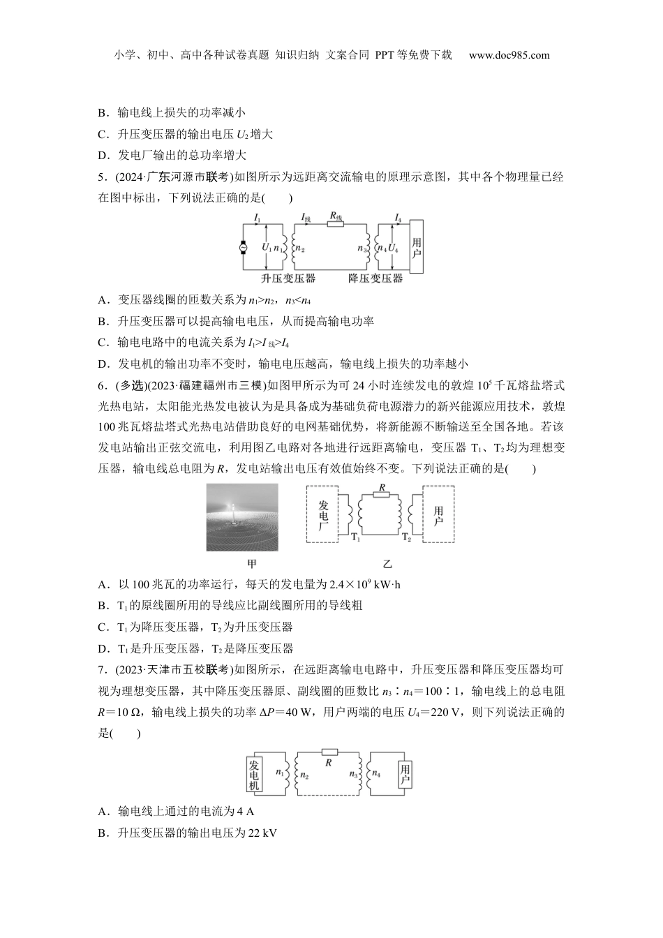 小学、初中、高中各种试卷真题知识归纳文案合同PPT等免费下载www.doc985.com训练2远距离输电1.(2023·宁沈市第二中模辽阳学拟)在如图所示的某地远距离输电电路图中,升压变压器和降压变压器均为理想变压器,发电厂的输出电压和输电线的电阻均不变,如果发电厂的输出功率增大为原来的2倍,输电线上损耗的功率将增大为原来的()A.1倍B.2倍C.4倍D.8倍2.(多选)某发电厂原来用11kV的交流电压输电,后来改用升压变压器将电压升高到550kV后再输电。若输电的电功率都是P,输电线路的电阻均为R,则下列说法中正确的是()A.根据公式P损=I2R,为减小输电功率损失,可以减小输电电流B.根据公式P损=,小功率失,可以降低为减输电损输电电压C.根据公式I=,提高后上的流增大原的电压输电线电为来50倍D.根据公式I=,提高后上的流小原的电压输电线电减为来3.(2023·浙江6月考选·7)我国1100kV特高压直流输电工程的送电端用“整流”设备将交流变换成直流,用户端用“逆变”设备再将直流变换成交流。下列说法正确的是()A.送电端先升压再整流B.用户端先降压再变交流C.1100kV是指交流电的最大值D.输电功率由送电端电压决定4.(2023·江徐州市一模苏)随着经济发展,在寒冬来临时,用电需求增加,当火力发电供应紧张时,通过远距离调度方式,会及时将其他地区的风力发电、太阳能发电并入电网保障电力供应。如图是远距离输电的原理图,假设发电厂输出电压恒定不变,两个变压器均为理想变压器。当用户用电器增加(假设所有用电器均可视为纯电阻),下列说法正确的是()A.降压变压器的输出电流I4减小小学、初中、高中各种试卷真题知识归纳文案合同PPT等免费下载www.doc985.comB.输电线上损失的功率减小C.升压变压器的输出电压U2增大D.发电厂输出的总功率增大5.(2024·广河源市考东联)如图所示为远距离交流输电的原理示意图,其中各个物理量已经在图中标出,下列说法正确的是()A.变压器线圈的匝数关系为n1>n2,n3<n4B.升压变压器可以提高输电电压,从而提高输电功率C.输电电路中的电流关系为I1>I线>I4D.发电机的输出功率不变时,输电电压越高,输电线上损失的功率越小6.(多选)(2023·福建福州市三模)如图甲所示为可24小时连续发电的敦煌105千瓦熔盐塔式光热电站,太阳能光热发电被认为是具备成为基础负荷电源潜力的新兴能源应用技术,敦煌100兆瓦熔盐塔式光热电站借助良好的电网基础优势,将新能源不断输送至全国各地。若该发电站输出正弦交流电,利用图乙电路对各地进行远距离输电,变压器T1、T2均为理想变压器,输电线总电阻为R,发电站输出电压有效值始终不变。下列说法正确的是()A.以100兆瓦的功率运行,每天的发电量为2.4×109kW·hB.T1的原线圈所用的导线应比副线圈所用的导线粗C.T1为降压变压器,T2为升压变压器D.T1是升压变压器,T2是降压变压器7.(2023·天津市五校考联)如图所示,在远距离输电电路中,升压变压器和降压变压器均可视为理想变压器,其中降压变压器原、副线圈的匝数比n3∶n4=100∶1,输电线上的总电阻R=10Ω,输电线上损失的功率ΔP=40W,用户两端的电压U4=220V,则下列说法正确的是()A.输电线上通过的电流为4AB.升压变压器的输出电压为22kV小学、初中、高中各种试卷真题知识归纳文案合同PPT等免费下载www.doc985.comC.发电机的输出功率为66kWD.用户消耗的功率为44kW8.(2023·广韶市模东关拟)如图所示为某小型电站高压输电示意图,变压器均为理想变压器,发电机输出功率恒为20kW。在输电线路上接入一个电流互感器,其原、副线圈的匝数比为1∶10,电流表的示数为1A,输电线的总电阻用R线表示,大小为10Ω。下列说法正确的是()A.电流互感器是一种降压变压器B.将滑动触头P下移,用户获得的电压将增大C.升压变压器的输出电压U2=1000VD.用户获得的功率为19kW9.交流发电机的输出电压为U,采用图示理想变压器输电,升压变压器原、副线圈匝数比为m,降压变压器原、副线圈匝数比为n。现输电距离增大,输电线电阻r随之增大,若要保证负载仍能正常工作,下列做法一定可行的是()A.增大mB.减小mC.增大nD.减小U10.如图所示为某小型发电站高压输电示...