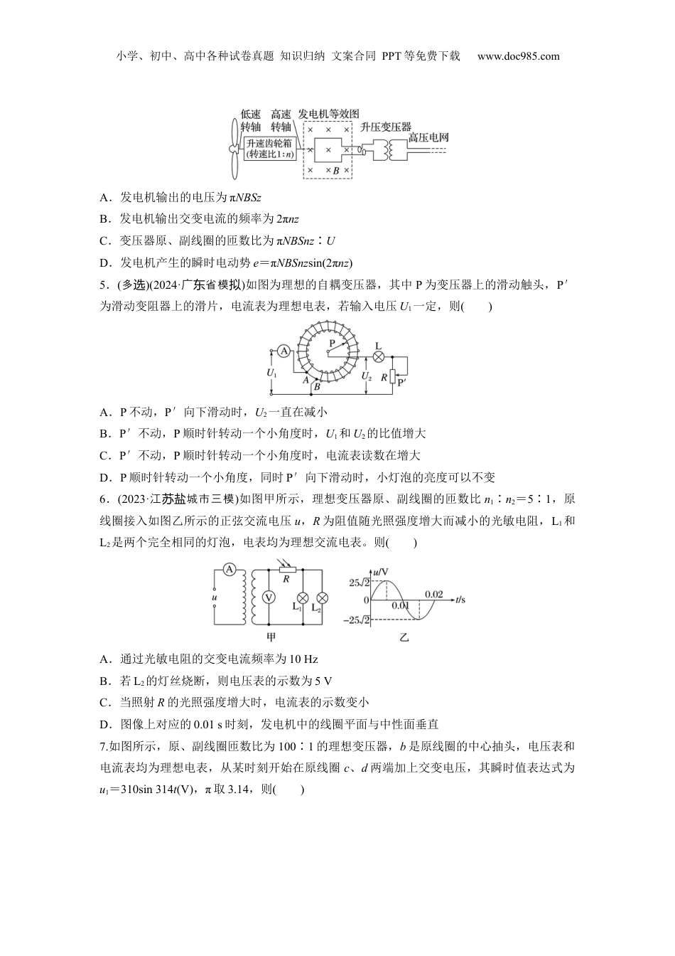 小学、初中、高中各种试卷真题知识归纳文案合同PPT等免费下载www.doc985.com训练1变压器1.(2020·江卷苏·2)电流互感器是一种测量电路中电流的变压器,工作原理如图所示。其原线圈匝数较少,串联在电路中,副线圈匝数较多,两端接在电流表上。则电流互感器()A.是一种降压变压器B.能测量直流电路的电流C.原、副线圈电流的频率不同D.副线圈的电流小于原线圈的电流2.(2023·广卷东·6)用一台理想变压器对电动汽车充电,该变压器原、副线圈的匝数比为1∶2,输出功率为8.8kW,原线圈的输入电压u=220sin(100πt)V。关于副线圈输出电流的有效值和频率正确的是()A.20A,50HzB.20A,50HzC.20A,100HzD.20A,100Hz3.(2023·北京卷·7)自制一个原、副线圈匝数分别为600匝和190匝的变压器,原线圈接12V的正弦交流电源,副线圈接额定电压为3.8V的小灯泡。实际测得小灯泡两端电压为2.5V。下列措施有可能使小灯泡正常发光的是()A.仅增加原线圈匝数B.仅增加副线圈匝数C.将原、副线圈匝数都增为原来的两倍D.将两个3.8V小灯泡并联起来接入副线圈4.(2022·河北卷·3)张家口市坝上地区的风力发电场是北京冬奥会绿色电能的主要供应地之一,其发电、输电简易模型如图所示,已知风轮机叶片转速为每秒z转,通过转速比为1∶n的升速齿轮箱带动发电机线圈高速转动,发电机线圈面积为S,匝数为N,匀强磁场的磁感应强度为B,t=0时刻,线圈所在平面与磁场方向垂直,发电机产生的交变电流经过理想变压器升压后,输出电压为U。忽略线圈电阻,下列说法正确的是()小学、初中、高中各种试卷真题知识归纳文案合同PPT等免费下载www.doc985.comA.发电机输出的电压为πNBSzB.发电机输出交变电流的频率为2πnzC.变压器原、副线圈的匝数比为πNBSnz∶UD.发电机产生的瞬时电动势e=πNBSnzsin(2πnz)5.(多选)(2024·广省模东拟)如图为理想的自耦变压器,其中P为变压器上的滑动触头,P′为滑动变阻器上的滑片,电流表为理想电表,若输入电压U1一定,则()A.P不动,P′向下滑动时,U2一直在减小B.P′不动,P顺时针转动一个小角度时,U1和U2的比值增大C.P′不动,P顺时针转动一个小角度时,电流表读数在增大D.P顺时针转动一个小角度,同时P′向下滑动时,小灯泡的亮度可以不变6.(2023·江城市三模苏盐)如图甲所示,理想变压器原、副线圈的匝数比n1∶n2=5∶1,原线圈接入如图乙所示的正弦交流电压u,R为阻值随光照强度增大而减小的光敏电阻,L1和L2是两个完全相同的灯泡,电表均为理想交流电表。则()A.通过光敏电阻的交变电流频率为10HzB.若L2的灯丝烧断,则电压表的示数为5VC.当照射R的光照强度增大时,电流表的示数变小D.图像上对应的0.01s时刻,发电机中的线圈平面与中性面垂直7.如图所示,原、副线圈匝数比为100∶1的理想变压器,b是原线圈的中心抽头,电压表和电流表均为理想电表,从某时刻开始在原线圈c、d两端加上交变电压,其瞬时值表达式为u1=310sin314t(V),π取3.14,则()小学、初中、高中各种试卷真题知识归纳文案合同PPT等免费下载www.doc985.comA.当单刀双掷开关与a连接时,电压表的示数为3.1VB.副线圈两端的电压频率为50HzC.当单刀双掷开关由a扳向b时,原线圈输入功率变小D.当单刀双掷开关由a扳向b时,电压表和电流表的示数均变小8.(多选)(2022·湖北卷·9)近年来,基于变压器原理的无线充电技术得到了广泛应用,其简化的充电原理图如图所示。发射线圈的输入电压为220V、匝数为1100匝,接收线圈的匝数为50匝。若工作状态下,穿过接收线圈的磁通量约为发射线圈的80%,忽略其他损耗,下列说法正确的是()A.接收线圈的输出电压约为8VB.接收线圈与发射线圈中电流之比约为22∶1C.发射线圈与接收线圈中交变电流的频率相同D.穿过发射线圈的磁通量变化率与穿过接收线圈的相同9.(2023·广广州市育才中期中东学)一含有理想自耦变压器的电路如图所示,变压器副线圈匝数可调,原线圈串联定值电阻r后接在有效值为220V的正弦式交流电源上,定值电阻R=4r。当副线圈匝数调至某位置时,R和r的功率恰好相等,则此时原、副线圈匝数比为()A.2∶1B.1∶2C.4∶1D.1∶410.(多选)(2023·河南封市...