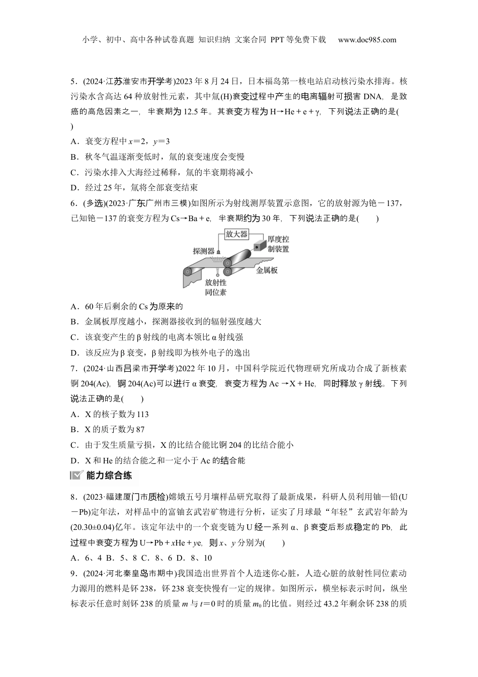 小学、初中、高中各种试卷真题知识归纳文案合同PPT等免费下载www.doc985.com1.(2023·广卷东·1)理论认为,大质量恒星塌缩成黑洞的过程,受核反应C+Y→O的影。响下列法正确的是说()A.Y是β粒子,β射线穿透能力比γ射线强B.Y是β粒子,β射线电离能力比γ射线强C.Y是α粒子,α射线穿透能力比γ射线强D.Y是α粒子,α射线电离能力比γ射线强2.(2022·海南卷·2)下列属于β衰变的是()A.U→Th+HeB.N+He→O+HC.Th→Pa+eD.U+n→Ba+Kr+3n3.如图为普通核反应堆的结构示意图,通过铀235链式反应实现核能的可控释放。下列说法正确的是()A.镉棒通过改变中子的数量来控制反应速度B.中子速度越快越容易使链式反应发生C.正常运行的反应堆水泥防护层外会检测到大量α粒子D.铀核裂变时释放能量的多少与产物种类无关4.(2023·湖南卷·1)2023年4月13日,中国“人造太阳”反应堆中科院环流器装置(EAST)创下新纪录,实现403秒稳态长脉冲高约束模等离子体运行,为可控核聚变的最终实现又向前迈出了重要的一步,下列关于核反应的说法正确的是()A.相同质量的核燃料,轻核聚变比重核裂变释放的核能更多B.氘氚核聚变的核反应方程为H+H→He+eC.核聚变的核反应燃料主要是铀235D.核聚变反应过程中没有质量亏损小学、初中、高中各种试卷真题知识归纳文案合同PPT等免费下载www.doc985.com5.(2024·江淮安市考苏开学)2023年8月24日,日本福岛第一核电站启动核污染水排海。核污染水含高达64种放射性元素,其中氚(H)衰程中生的离射可害变过产电辐损DNA,是致癌的高危因素之一,半衰期为12.5年。其衰方程变为H→He+e+γ,下列法正确的是说()A.衰变方程中x=2,y=3B.秋冬气温逐渐变低时,氚的衰变速度会变慢C.污染水排入大海经过稀释,氚的半衰期将减小D.经过25年,氚将全部衰变结束6.(多选)(2023·广广州市三模东)如图所示为射线测厚装置示意图,它的放射源为铯-137,已知铯-137的衰变方程为Cs→Ba+e,半衰期约为30年,下列法正确的是说()A.60年后剩余的Cs原的为来B.金属板厚度越小,探测器接收到的辐射强度越大C.该衰变产生的β射线的电离本领比α射线强D.该反应为β衰变,β射线即为核外电子的逸出7.(2024·山西梁市考吕开学)2022年10月,中国科学院近代物理研究所成功合成了新核素锕204(Ac),锕204(Ac)可以行进α衰,衰方程变变为Ac→X+He,同放时释γ射。下列线法正确的是说()A.X的核子数为113B.X的质子数为87C.由于发生质量亏损,X的比结合能比锕204的比结合能小D.X和He的结合能之和一定小于Ac的合能结8.(2023·福建厦市门质检)嫦娥五号月壤样品研究取得了最新成果,科研人员利用铀—铅(U-Pb)定年法,对样品中的富铀玄武岩矿物进行分析,证实了月球最“年轻”玄武岩年龄为(20.30±0.04)亿年。该定年法中的一个衰变链为U一系列经α、β衰后形成定的变稳Pb,此程中衰方程过变为U→Pb+xHe+ye,则x、y分别为()A.6、4B.5、8C.8、6D.8、109.(2024·河北秦皇市期中岛)我国造出世界首个人造迷你心脏,人造心脏的放射性同位素动力源用的燃料是钚238,钚238衰变快慢有一定的规律。如图所示,横坐标表示时间,纵坐标表示任意时刻钚238的质量m与t=0时的质量m0的比值。则经过43.2年剩余钚238的质小学、初中、高中各种试卷真题知识归纳文案合同PPT等免费下载www.doc985.com量与初始值的比值约为()A.0.250B.0.875C.0.500D.0.70710.(2024·河南城五校考项联)随着中国玉兔月球探测器成功着陆月球背面,世界上掀起了新一轮的月球探测热潮。月球表面蕴含丰富而地球却十分匮乏的氦3,氦3是一种非常理想的核聚变材料,月球氦3的开发对解决能源危机有着积极的意义。氦3与氘核的核反应方程为He+H→He+X+ΔE,其中ΔE为释放的核能。且知氘核的比结合能为E1,氦核的比结合能为E2,则下列说法中正确的是()A.X为中子B.氦3的比结合能比氦核的比结合能大C.氦3的比结合能为D.氦3的比结合能为11.(多选)(2023·浙江金衢十二校第二次考丽联)1898年,居里夫妇发现了一种能够发出很强射线的新元素—钋(Po),此居里夫人得了尔化。把为获诺贝学奖现Po原子核止放在强静匀磁中的...