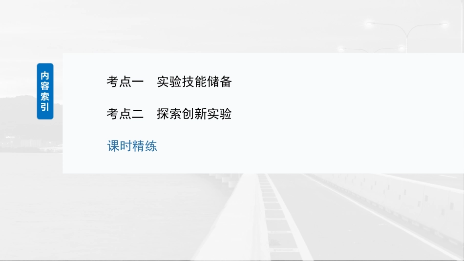 第一章运动的描述匀变速直线运动的研究第5课时实验一:探究小车速度随时间变化的规律目标要求1.会正确使用打点计时器,学会利用纸带上的点迹求物体的速度和加速度。2.掌握判断物体是否做匀变速直线运动的方法。内容索引考点一实验技能储备考点二探索创新实验课时精练><考点一实验技能储备实验技能储备考点一一、打点器计时1.作用:器,所用交源的率计时仪当变电频f=50Hz,每隔时s打一次点。0.02实验技能储备考点一2.结构(1)磁打点器电计时(如图)实验技能储备考点一(2)火花器电计时(如图)实验技能储备考点一3.工作件:条磁打点器:电计时交源变电火花器:电计时交源变电8V220V实验技能储备考点一二、:探究小速度化的律实验车随时间变规1.器材实验火花器电计时(或磁打点器电计时)、一端附有滑的木板、小、轮长车、、槽、纸带细绳码、、导线源。电2.程实验过(1)按照装置,把打点器固定在木板实验计时长的一端,接好电源;刻度尺交变无滑轮实验技能储备考点一(2)把一系在小上,滑,下端挂合适的槽,穿细绳车细绳绕过轮码纸带过打点器,固定在小后面;计时车(3)把小停在靠近打点器,先车计时处,后;(4)小一段后,源,取下;车运动时间断开电纸带(5)更重三次,一比理想的行量、分析。换纸带复实验选择条较纸带进测接通源电放小开车实验技能储备考点一3.据理数处(1)求小的速度加速度车与①利用平均速度求瞬速度:时vn=xn+xn+12T=dn+1-dn-12T。②利用逐差法求解平均加速度a1=x4-x13T2,a2=x5-x23T2,a3=x6-x33T2,则a=a1+a2+a33=x4+x5+x6-x1+x2+x39T2实验技能储备考点一③利用速度-像求加速度时间图a.作出速度-像,通像的斜率求解小的加速度;时间图过图车b.剪下相点的排在一起求解加速度。邻计数纸带紧(2)依据判小是否做速直纸带断车匀变线运动①x1、x2、x3、…、xn是相点的距离。邻两计数间②Δx是相等的的位移差:两个连续时间内Δx1=x2-x1,Δx2=x3-x2,…。③若Δx等于恒量(aT2),明小做速直。则说车匀变线运动④Δx=aT2只要小做速直在任意相等的车匀变线运动它两个连续时实验技能储备考点一4.注意事项(1)平行:、要木板平行。纸带细绳与长(2)先后:中先接通源,后小;完先两两实验应电让车运动实验毕应断开源,后取下。电纸带(3)防止撞:在到木板末端前小停止,防止槽落地及碰达长应让车运动码小滑相撞。车与轮(4)小差:小的加速度适大些,可以小度量的相差,减误车应当减长测对误加速度大小以能在约50cm的上楚地取出纸带清6、7点宜。个计数为(5)小靠近打点器位置放。车从计时释实验技能储备考点一5.差分析误(1)摩擦力不均,打点不定引起差。纸带运动时匀稳误(2)点距离的量有偶然差。计数间测误(3)作有差。图误实验技能储备考点一例1某班同利用如甲所示装置学图“探究小速度化的律车随时间变规”,火花器使用的是率电计时频为50Hz的交源。变电(1)火花器的工作电计时电压为________(选填“8V”或“220V”)。安装,需要置于纸带时将纸带__________(选填“复写纸”或“墨粉纸盘”)的______(选填“上方”或“下方”)。220V墨粉纸盘下方实验技能储备考点一(2)下列法中正确的是说______。A.,先放,再接通源实验时释纸带电B.,先接通源,待打点定实验时电稳后,再放释纸带C.,先接通源或先放都可以实验时电释纸带D.上打点越密集明速度越大纸带说纸带运动B实验技能储备考点一(3)第1小所得上打出的部分点如乙所示个实验组纸带计数图(每相邻两个点有计数间还4点,中未出个图画)。x1=3.59cm,x2=4.41cm,x3=5.19cm,x4=5.97cm,x5=6.78cm,x6=7.64cm。小的加则车速度a=_______m/s2(要求充分利用量的据测数),打点器在打计时B点小的速度时车vB=_______m/s。(果均保留位有效字结两数)0.800.40实验技能储备考点一(4)第2小算出所得个实验组计c上各纸带计点的速度后,在坐系中描出的点如数对应标丙所示,根据些点在丙中作出图请这图v-t像,根据像算出小的加速图并图计车运动度a=___________________m/s2。(果结保留三位有效字数)答案如图所示1.53(1.52、1.54均可)返回探索创新实验><考点二探索创新实验考点二1.装置的新实验创用照相的方法、滴水...