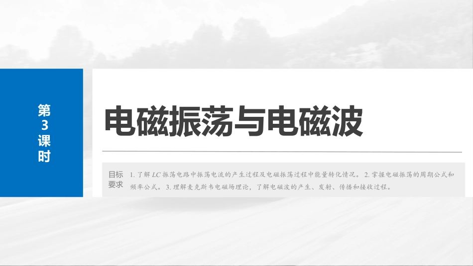 第十三章交变电流电磁波传感器第3课时电磁振荡与电磁波目标要求1.了解LC振荡电路中振荡电流的产生过程及电磁振荡过程中能量转化情况。2.掌握电磁振荡的周期公式和频率公式。3.理解麦克斯韦电磁场理论,了解电磁波的产生、发射、传播和接收过程。内容索引考点一电磁振荡考点二电磁波的特点及应用课时精练><考点一电磁振荡电磁振荡考点一1.振路:生大小和方向都做荡电产_______迅速化的流变电(即_________)的路。由感圈电电线L和容电C成最的振路,组简单荡电称为LC振路。荡电2.磁振:在电荡LC振路中,容器不地充和放,就使荡电电断电电会电容器板上的荷量极电q、路中的电_______、容器的强度电内电场E、圈的线内_____________生周期性的化,象就是磁振。发变这种现电荡周期性振流荡电流电i磁感强度应B电磁振荡考点一3.磁振中的能量化电荡变(1)放程中容器存的电过电储_____能逐化圈渐转为线的_____能。(2)充程中圈中的电过线_____能逐化容器的渐转为电_____能。(3)在磁振程中,能和磁能生电荡过电场场会发_______的化。转电场磁场磁场电场周期性电磁振荡考点一4.磁振的周期和率电荡频(1)周期T=_______。(2)率频f=________。2πLC12πLC电磁振荡考点一思考如甲、乙、丙、丁、戊五代表图个图LC振路中的五。荡电个状态(1)甲图qC最大,i=____;乙图i最大,qC=____;丙图qC最大,i=____;丁图i最大,qC=____;戊图qC最大,i=____。00000电磁振荡考点一(2)甲从→乙的程中,过i_____,qC_____;乙从→丙的程中,过i_____,qC_____;丙从→丁的程中,过i_____,qC_____;丁从→戊的程中,过i_____,qC_____。增大小减小减增大增大小减小减增大电磁振荡考点一(3)出甲始一周期画从开计时个内i-t、qC-t像。图答案判断正误电磁振荡考点一1.LC振路中,容器放完,回路中流最小。荡电电电毕时电()2.LC振路中,回路中的流最大回路中的磁能最大。荡电电时场()3.磁振的固有周期流的化快慢有。电荡与电变关()×√×电磁振荡考点一例1(2024·北京市模拟)如甲所示某一图为LC振路,乙荡电图i-t像图为LC振路的流化的系像。在荡电电随时间变关图t=0刻,回时路中容器的电M板正,下列法中正确的是带电说A.O~a段,容器正在充,能阶电电电场正在向磁能化场转B.a~b段,容器正在放,磁能正在向能化阶电电场电场转C.b~c段,容器正在放,回路中流沿方向阶电电电顺时针D.c~d段,容器正在充,回路中流沿逆方向阶电电电时针√电磁振荡考点一O~a段,容器正在放,流不阶电电电断增加,能正在向磁能化,电场场转选项A;错误a~b段,容器正在充,流逐小,磁能正在向能阶电电电渐减场电场化,转选项B;错误b~c段,容器正在放,回路中流沿方向,阶电电电顺时针选项C正确;c~d段容器正在充回路中流沿方向阶电电电顺时针选项D错电磁振荡考点一例2(2023·江南京市六校苏调研)在LC振路中,某刻路中荡电时电的流方向如所示,且流正在小,刻电图电减则该时A.容器上板,下板正电极带负电极带电B.容器板正在小电两极间电压减C.能正在向磁能化电场场转D.流的化率小电变减√电磁振荡考点一根据流正在小可以判,此容器在充,电减断时电电结合流方向知容器上板,下板正电电极应该带负电极带,在振路中,容器充,流小但电荡电当电电时电减电流化得越越快,即流化率增大;容器上的荷量增大,此变来电变电电,磁能化能,故时场转为电场A正确,C、D;错误由Q=CU可得,容器荷量增大,板的也增大,故电电两极间电压B。错误总结提升电磁振荡考点一LC振荡电路充、放电过程的判断方法根据流流向电判断流流向正的板,容器的荷量增加,磁能向当电带电极时电电场能化,于充程;反之,流流出正的板电场转处电过当电带电极,荷量少,能向磁能化,于放程时电减电场场转处电过根据物理量的化判变趋势断容器的荷量当电带电q(电压U、强度电场E)增大或流电i(磁感强度应B)小,于充程;反之,于放程减时处电过处电过根据能量判断能增加充,磁能增加放电场时电场时电电磁振荡考点一例3(2020·浙江1月考选·8)如所示,刀图单双掷开关S先打到a端容器充。让电满电t=0时开关S打到b端,t=0.02s时LC回路中电容器下板正荷且荷量第一次到最大。极带电...