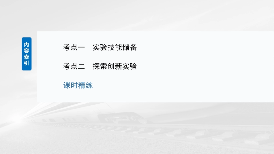 第四章抛体运动圆周运动第3课时实验五:探究平抛运动的特点目标要求1.知道平抛运动的轨迹是抛物线,能熟练操作器材,会在实验中描绘其轨迹。2.会通过描绘的平抛运动轨迹计算物体的初速度。内容索引考点一实验技能储备考点二探索创新实验课时精练><考点一实验技能储备实验技能储备考点一1.思路实验用描迹法逐点出小球做平抛的迹,判迹是否抛物画钢运动轨断轨为线并求出小球的初速度。钢2.器材实验末端水平的斜槽、背板、板、、白、球、挡复写纸纸钢、重垂、三角板、等。线铅笔刻度尺实验技能储备考点一3.程实验过(1)安装、整背板:白放在下面,然后固定在装置背板上,调将纸复写纸用重垂背板是否并线检查。(2)安装、整斜槽:固定有斜槽的木板放在上,用平衡法调将实验桌检查斜槽末端是否,也就是小球放在斜槽末端直将道上,小球若能轨,则表明斜槽末端已水平,如。调图直竖水平止在直道上的任意位置静轨实验技能储备考点一(3)描迹:小球在斜槽的某一固定位置由止下,斜槽绘运动轨让静滚并从末端出始做平抛,小球落到斜的板上,,在飞开运动倾挡挤压复写纸会白上留下印迹。取下白用平滑的曲把些印迹接起,就得到纸纸线这连来小球做平抛的迹。运动轨(4)确定坐原点及坐:定标标轴选__________________________________坐原点为标O,坐原点从标O出直向下的画竖y和水平向右的轴x。轴斜槽末端小球球心在白上的投影点处纸实验技能储备考点一4.据理数处(1)判平抛的迹是不是抛物断运动轨线如所示,在图x上找出等距离的几点轴个A1、A2、A3…,把段线OA1的度长记为l,则OA2=2l,OA3=3l,由A1、A2、A3…向下作垂,迹交点线与轨分别记为M1、M2、M3…,若迹是一抛物,各点的轨条线则y坐和标x坐之足系式标间应该满关y=ax2(a是待定常量),用刻度尺量某点的测x、y坐代入两个标值y=ax2求出a,再量其他几点的测个x、y坐,标值代入y=ax2若在差范都足系式曲是一抛误围内满这个关则这条线条实验技能储备考点一(2)算平抛物体的初速度计运动情景1:若原点O抛出点,利用公式为x=v0t和y=12gt2即可求出多个初速度v0=,最后求出初速度的平均,就是做平抛的物体值运动的初速度。xg2y实验技能储备考点一情景2:若原点O不是抛出点①在迹曲上取三点轨线A、B、C,使xAB=xBC=x,如所示。图A到B与B到C的相等,时间设为T。②用刻度尺分出别测yA、yB、yC,有则yAB=yB-yA,yBC=yC-yB。③yBC-yAB=gT2,且v0T=x,由以上式得两v0=xgyBC-yAB。实验技能储备考点一5.注意事项(1)固定斜槽,要保斜槽末端的切水平,以保小球的初速度时证线证,否小球的就不是平抛了。则运动运动(2)小球每次槽中的同一位置由止放,可以确保每次小球抛出从静释这样的时相等。(3)坐原点标(小球做平抛的起点运动)不是槽口的端点,是小球在槽应口,球的时在背板上的水平投影点。水平速度球心实验技能储备考点一例1用如所示装置究平抛。白和重固定图研运动将纸复写纸对齐叠并在直的硬板上。球沿斜槽道竖钢轨PQ滑下后从Q点出,落在水平飞挡板MN上。由于板靠近硬板一低,球落在挡侧较钢板上,球面在白上出一痕迹挡时钢侧会纸挤压个点。移板,重新放球,如此重,白动挡释钢复纸上留下一系列痕迹点。将实验技能储备考点一(1)下列件必足的有实验条须满______。A.斜槽道光滑轨B.斜槽道末端水平轨C.板高度等距化挡间变D.每次斜槽上相同的位置无初速度放球从释钢BD实验技能储备考点一因本是究平抛,只需要每次为实验研运动实都能保球做相同的平抛,即每次验证钢运动都要保球同一高度无初速度放实验证钢从释水平抛出,必要要求斜槽道光滑,因并没轨此A,错误B、D正确;板高度可以不等距化,故挡间变C。错误实验技能储备考点一(2)定量究,建立以水平方向为研为x、直方向轴竖为y的坐系。轴标a.取平抛的起始点坐原点,球置运动为标将钢静于Q点,球的钢_____(选填“最上端”“最下端”或者“球心”)白上的位置即原点;在对应纸为确定y轴时_____(选填“需要”或者“不需要”)y重垂平行。轴与线球心需要实验技能储备考点一因球做平抛的迹是其球心的迹,为钢运动轨轨故球置于将钢静Q点,球的球心白钢对应纸上的位置即坐原点为标(平抛的起始运动点);在...