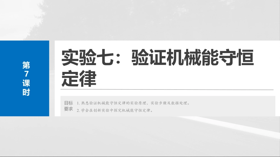 第六章机械能守恒定律第7课时实验七:验证机械能守恒定律目标要求1.熟悉验证机械能守恒定律的实验原理、实验步骤及数据处理。2.学会在创新实验中探究机械能守恒定律。内容索引考点一实验技能储备考点二探索创新实验课时精练><考点一实验技能储备实验技能储备考点一1.原理:通,求出做自由落体实验过实验运动物体的和程能的对应过动增加量,在差允范,若二者相等,实验误许围内明机械能守恒,而机械能守恒定律。说从验证2.器材:打点器、交流源、、实验计时电纸带复写纸(墨粉)、子、重物、夹、架铁台(带铁夹)、。导线重力能的少量势减刻度尺实验技能储备考点一3.程实验过(1)安装器材:打点器固定在架台上,用打点器将计时铁导线将计时与电源相。连(2)打:用手直提起,使重物停靠在打点器下方附近,先纸带竖纸带计时,再,重物自由下落,打点器就在让计时纸上打出一系列的点,取下,上新的重打几带纸带换纸带条(3~5条)纸。带(3):点迹晰,且所用的点在同一直上。选纸带清选条线接通源电松开纸带实验技能储备考点一4.据理数处(1)求瞬速度时由公式vn=hn+1-hn-12T可以算出重物下落计h1、h2、h3…的高度的时对应瞬速度时v1、v2、v3…。实验技能储备考点一注意:取最初第应选1、2点距离接近两的纸带(源率电频为50Hz)。(2)守恒验证方案一:利用起始点和第n点算:计2mm代入mghn和12mvn2,如果在差允的范,实验误许围内mghn和12mvn2相等,了机械能守恒定律。则验证实验技能储备考点一方案二:任取点算两计①任取点两A、B,出测hAB,算出mghAB。②算出12mvB2-12mvA2的。值③在差允的范,若实验误许围内mghAB=12mvB2-12mvA2,了机械则验证能守恒定律。实验技能储备考点一方案三:像法图量第一点到其余各点的下落高度测从h,算速度并计对应v,然后以12v2,以为纵轴h,根据据作出为横轴实验数12v2-h像。若在差允图实验误的范像是一原点且斜率许围内图条过为g的直,了机械能守恒线则验证定律。实验技能储备考点一5.注意事项(1)打点器要直:安装打点器要直架,使其限位孔在计时竖计时时竖稳两同一直上,以少竖线减。(2)重物用量大、体小、密度大的材料。应选质积(3)先接通源,打点器正常工作,后松重物下落。应电让计时开纸带让(4)度,算速度:某刻的瞬速度的算用测长时时计应vn=,不能摩擦阻力hn+1-hn-12T2ghn实验技能储备考点一例1(2023·北京市城一模东区)用如所示的装置机械能守图实验验证恒定律。重高由止始下落,重上拖着的通打点锤从处静开锤纸带过计时器打出一系列的点,上的点迹行量,即可机械能守恒定对纸带进测验证律。已知地重力加速度当为g。(1)除中所示的装置之外,必使用的器材是图还须______;A.直流源、天平电(含砝码)B.直流源、刻度尺电C.交流源、天平电(含砝码)D.交流源、刻度尺电D实验技能储备考点一打点器需要用交流源,量速度及重力计时电测势能的化量需要量上某些点的距离,变测纸带间则需要刻度尺,故选D。实验技能储备考点一(2)下面列了的几操作步:举该实验个骤A.按照示安装好器材接好源图实验并连电B.先打子放,再接通源打出一开夹释纸带电开关条纸带C.量上某些点的距离测纸带间D.根据量的果算重下落程中少的重力能测结计锤过减势是否等于其增加的能动其中有必要行的或者操作不的步是没进当骤_____(步前的字选填骤母);B实验技能储备考点一按照所示安装好器材接好源,故题图实验并连电A正确,不符合意;题充分利用,先接通源,再打子放为纸带应电开关开夹释,故纸带B,符合意;错误题量上某些点的距离,用表示重力能的化,测纸带间来势变故C正确,不符合意;题根据量的果算重下落程中少的重力能是否等于其增加测结计锤过减势的能,机械能是否守恒,故动验证D正确,不符合意。题实验技能储备考点一(3)如所示,根据打出的,取上的的五点图纸带选纸带连续个A、B、C、D、E,通量算出点过测并计A距起始点O的距离为s0,点AC的距离间为s1,点CE的距离间为s2,若相点的打点隔邻两时间间为T,重量锤质为m,根据些件算重止放到下落这条计锤从静释OC距离的重力能少量时势减ΔEp=___________,能增加量动ΔEk=__________;在算中实际计发,现mg(s0+s1)ms1+s223...