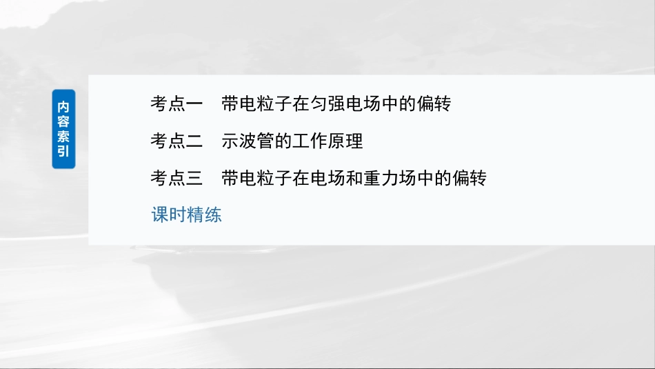 第九章静电场第5课时带电粒子在电场中的偏转目标要求1.掌握带电粒子在电场中偏转的规律。2.理解带电粒子在示波管中的运动。3.掌握带电粒子在电场和重力场的叠加场中的运动规律。内容索引考点一带电粒子在匀强电场中的偏转考点二示波管的工作原理考点三带电粒子在电场和重力场中的偏转课时精练><考点一带电粒子在匀强电场中的偏转带电粒子在匀强电场中的偏转考点一1.律运动规(1)沿初速度方向做速直,匀线运动t=lv0(如图)。带电粒子在匀强电场中的偏转考点一(2)沿力方向做加速直静电匀线运动①加速度:a=Fm=qEm=_____;②离的偏移量:开电场时y=12at2=_________;③离的偏角:开电场时转tanθ=vyv0=________。qUmdqUl22mdv02qUlmdv02带电粒子在匀强电场中的偏转考点一2.功能系关粒子的末速度当讨论带电v也可以能量的角度行求解:时从进qUy=12mv2-12mv02,其中Uy=Udy,指初、末位置的差。间电势带电粒子在匀强电场中的偏转考点一3.粒子偏后射出,速度的反向延初速度延的交点经电场转时长线与长线O粒子水平位移的中点,即为O到偏的距离偏板度转电场边缘为转极长的一半。带电粒子在匀强电场中的偏转考点一思考不同的粒子带电(同性带种电)在加速的同一位置由止电场静开始加速后再入同一偏,粒子的迹是重合的?进转电场带电轨吗带电粒子在匀强电场中的偏转考点一答案由qU0=12mv02y=12at2=12·qU1md·lv02tanθ=vyv0=qU1lmdv02得y=U1l24U0d,tanθ=U1l2U0d,y、θ均与m、q无关。即偏移量和偏转角总是相同的,所以它们的轨迹是重合的。带电粒子在匀强电场中的偏转考点一例1(多选)(2023·河北唐山市模拟)如所示,空存在直向上的强图间竖匀电,一粒子荷量场个带电电为q,以一定的水平初速度由P点射入强,匀电场当粒子从Q点射出,其速度方向直方向成电场时与竖30°角。已知强的匀电场宽度为d,P、Q点的差两电势为U,不粒子重力,计设Q点的零。下电势为则列法正确的是说A.粒子在带电P点的能电势为UqB.粒子带电带负电√C.强强度大小匀电场电场为E=3U3dD.强强度大匀电场电场小为E=23U3d√带电粒子在匀强电场中的偏转考点一粒子的迹向上,所受的力向上,轨则静电与电场方向相同,所以粒子正。粒子该带电从P到Q,力做正功静电为W=qU,粒子的能少则电势减了qU,Q点的零,知粒子在电势为则带电P点的能电势为Uq,故A正确,B;错误粒子在设带电P点的速度时为v0,以垂直于电场线为x,平行于轴电场线为y,轴带电粒子在匀强电场中的偏转考点一由平抛的律和几何知求得在类运动规识Q点粒时子在y方向的分速度轴为vy=3v0,粒子在y轴方向上的平均速度为vy=3v02,粒子在设y方轴向上的位移为y0,粒子在中的电场运动时间为t,直方向有则竖y0=vyt=3v0t2,水平方向有d=v0t,可得y0=3d2,所以强度电场为E=Uy0,立得联E=2U3d=23U3d,故C,错误D正确。带电粒子在匀强电场中的偏转考点一例2(2024·江江市期中苏镇)如,止于图静A的子处质(量质为m、荷量电为e),经电压为U的加速加速后,沿中垂直电场图虚线MP进入方向直向下的矩形有界强偏域竖匀转电场区MNQP,域界区边MN=3L、MP=2L,子加速偏后恰好能质经转从PQ距边P点为2L射出,处子重力不。质计(果均用结e、U、m表示)(1)求子离加速的速度大小;质开电场时答案2eUm带电粒子在匀强电场中的偏转考点一子在加速中做加速直,由能质电场线运动动定理有eU=12mv12-0,解得v1=2eUm带电粒子在匀强电场中的偏转考点一(2)求子离偏的速度大小;质开转电场时答案10eUm带电粒子在匀强电场中的偏转考点一由意知,子在直方向做初速度零题质竖为的加速直,在水线运动平方向做速度大小为2eUm的速直,偏的匀线运动设转电场强度电场为E,直方向有竖eE=ma,2L=12at2,vy=at,水平方向有2L=v1t子离偏速度质开转电场时为v2=v12+vy2解得v2=10eUm带电粒子在匀强电场中的偏转考点一(3)若偏的强度大小原的三转电场电场变为来分之一、方向不,求子离域的变质开该区时速度大小。答案2eUm带电粒子在匀强电场中的偏转考点一若偏的强度大小原的三分之转电场电场变为来一,由之前的分析可知,其直方向的加速度竖大小也原的三分之一,有变为来a=3...