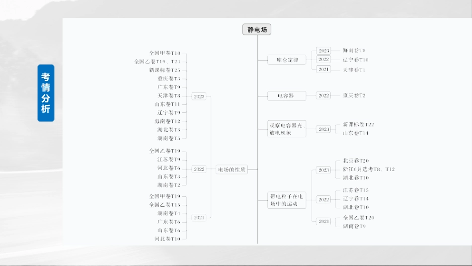 第九章静电场考情分析试题情境生活实践类人体带电头发散开,尖端放电,避雷针,静电吸附,直线加速器,示波器,静电加速器学习探究类观察静电感应现象,探究电荷间的作用力的影响因素,库仑扭秤实验,模拟电场线,观察电容器的充、放电现象第1课时静电场中力的性质目标要求1.掌握库仑定律的内容及条件,并会用来解决问题。2.理解电场强度的定义,并会计算电场强度的大小,判断电场强度方向。3.理解电场线的特点,会用电场线的特点解决相关问题。内容索引考点一电荷守恒定律库仑定律考点二电场、电场强度考点三电场线的理解及应用课时精练><考点一电荷守恒定律库仑定律电荷守恒定律库仑定律考点一1.元荷、点荷电电(1)元荷:电e=C,所有体的荷量都是元带电电荷的电倍。(2)点荷:代表体的有一定荷量的点,忽略体的电带电电带电________及荷分布之的作用力的影的理想化模型。电状况对它们间响1.60×10-19整数大小、形状电荷守恒定律库仑定律考点一2.荷守恒定律电(1)容:荷不生,也不消,只能一物体移到另一内电既会创会灭它从个转物体,或者物体的一部分移到另一部分;在移程中,荷的个从转转过电量总。(2)三起方式:摩擦起、种电电起、接起。电触电(3):物体带电实质。保持不变感应得失子电电荷守恒定律库仑定律考点一(4)荷的分配原:形、大小相同且同荷的同体,接电则两个状带种电种导后再分,二者触开带荷,若体原荷,电两导来带异种电则荷先电,余下的荷再电。公式:q1′=q2′=等量同种q1+q22。中和平分电荷守恒定律库仑定律考点一3.定律库仑(1)容内中止两个静之的相互作用力,的荷量的乘间与它们电成积,的距离的二次方成与它们,作用力的方向在它们的上。连线(2)表式达F=,式中k=N·m2/C2,叫作力常量。静电空真kq1q2r2点荷电正比反比9.0×109电荷守恒定律库仑定律考点一(3)力的方向库仑由相互作用的体定,即同荷相互两个带电决种电,荷相异种电互。(4)明说①F=,r指点荷的距离。于可点荷的均两电间对视为电两个匀带球体,电绝缘r球的球心距。为两间②荷的距离当两个电间r→0,荷不能点荷,之的时电视为电它们间静kq1q2r2排斥吸引电荷守恒定律库仑定律考点一思考金球荷量分两个带电属带电别为q1、q2,相距为r,距离近,较不能看成点荷,之的力受到什影?电它们间库仑会么响答案对于两个带电金属球,要考虑表面电荷的重新分布,如图所示。①同种电荷:F<kq1q2r2;②异种电荷:F>kq1q2r2。考点一判断正误电荷守恒定律库仑定律1.某体所的荷量可以是带电带电5×10-19C。()2.体很大的体有也可以看作点荷。积带电时电()3.荷的金球接,正荷一球移到另一两个带异种电属触时电从个转个球。()4.相互作用的点荷,荷量大的受到的力也大。两个电电库仑()5.根据公式F=,当r→0,时F→∞。()6根据公式F=当r→∞时F→0()×√××kq1q2r2kq1q2r2×√电荷守恒定律库仑定律考点一例1(2023·重市南中期中庆开学)分有荷量-别带电Q和+2Q的两相同金小球属(均可点荷视为电)相距为d,之力的大小它们间库仑为F。法小球接后再分一定的距离,之力大小依然设让两触开它们间库仑为F,此小球相距则时两A.24dB.18dC.14dD.d√电荷守恒定律库仑定律考点一小球接前,由定律得两触库仑F=k2Q·Qd2=2kQ2d2,小球接后再分两触,正荷中和后荷量均分,分的距离开负电电设开为x,有则F=k12Q·12Qx2=kQ24x2,解得x=24d,故选A。电荷守恒定律库仑定律考点一例2(2023·湖北宜昌市调研)如所示,在图边长为l的正方形的每个点都放置一点荷,其中顶个电a和b荷量均+电为q,c和d荷量均电-为q,力常量静电为k,则a荷受到的其他三荷的力的合电个电库仑力大小是A.0B.2kq2l2C.kq2l2D.3kq22l2√电荷守恒定律库仑定律考点一a和b荷量+电为q,c和d荷量-电为q,则c、d荷电对a荷的电库力引力,仑为b荷电对a荷的力斥力,根据定律,电库仑为库仑库仑力大小分别为Fca=kq22l2,Fba=Fda=kq2l2;根据力的合成法,则a荷所受的力大小电库仑为F=3kq22l2,故A、B、C,错误D正确。电荷守恒定律库仑定律考点一例3(多选)(2023·云南曲靖市模拟)如所示,的斜面体图绝缘ABC止于静水平面上,∠B=37°,∠C=53°,可点的物体两个...