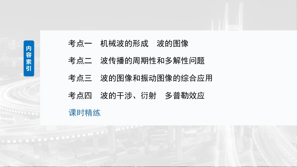 第八章机械振动机械波第3课时机械波目标要求1.知道机械波的形成条件及特点。2.掌握波速、波长和频率的关系,会分析波的图像。3.知道波的干涉、衍射现象和多普勒效应,掌握发生干涉和明显衍射的条件。内容索引考点一机械波的形成波的图像考点二波传播的周期性和多解性问题考点三波的图像和振动图像的综合应用课时精练考点四波的干涉、衍射多普勒效应><考点一机械波的形成波的图像机械波的形成波的图像考点一1.机械波(1)机械波的形成件条①有生机械振的发动。②有播传,如空、水等。气(2)播特点传①机械波播的只是振的传动和,点只在各自的平衡位质置附近做,不波简谐运动并随。②波到任意一点,点的起振方向都和波源的起振方向传该。波源介质形式能量移迁相同机械波的形成波的图像考点一③介中每点都做质个质振,因此,任一点的振率和动质动频周期都和波源的振率和周期动频。④波源一周期经过个T完成一次全振,波恰好向前播一波的动传个长距离。受迫相同机械波的形成波的图像考点一2.波的像图(1)坐:表示各点的标轴横轴质,表示刻各点的纵轴该时质。(2)意:表示在波的播方向上,某刻各点离义传时质开的位移。(3)像图(如图)平衡位置位移平衡位置机械波的形成波的图像考点一3.波、波速、率及其系长频关(1)波长λ:在波的播方向上,振相位是传动总的相点两个邻质间的距离。(2)率频f:等于波源的,由波源定。决(3)波速v:波在介中的播速度,由质传本身的性定,波质决与长和率频。(4)波、波速和率长频(周期)的系:关v==。相同λT振率动频介质无关λf考点一判断正误机械波的形成波的图像1.在机械波播程中,介中的点沿着波的播方向移。传过质质传动()2.机械波在播程中,各点振的周期、起振方向都相同。传过质动()3.机械波在一周期播的距离是振幅的个内传4倍。()4.波速表示介中点振的快慢。质质动()5.波的波播速度快。长长传较()√××××机械波的形成波的图像考点一例1(多选)(2024·安徽合肥市第一中月考学)位置坐标x=0的波源S在t=0刻平衡位置始向下,形成沿时从开运动x正、方向播的轴负两个传简谐波,沿波播方向上有距均横传间为1m的9点,位置坐如所示。个质标图t=0刻各点均于平衡位置,时质处经0.3s,x=1m的点第一次具有正处质向(即直向上竖)最大速度,同时x=3m的点始振,下列法正确质开动则说的是A.波速为10m/sB.x=-3m和x=3m的点振步完全一致两质动调C.t=0.6s,时x=4m的点具有向最大速度质负√√机械波的形成波的图像考点一由于波源形成沿该x正、方向轴负两个传播的波,于波源的点简谐横则关该对称的振步完全一致,故动调B正确;波的波速设该为v,周期为T,根据意可得题x3v=0.3s,x1v+T2=0.3s,其中x1=1m,x3=3m,立解得联v=10m/s,T=0.4s,故A正确;机械波的形成波的图像考点一波波源播到该从传x=4m所需的处时间为t=x4v=410s=0.4s,可则知0.4s时x=4m的点才始振,且跟波源的起振方向相同,处质开动即平衡位置始向下振,而从开动0.2s=T2,可知则t=0.6s,时x=4m的点到平衡位置,正向上振,此刻点具有正向最大速度,质达动该质故C;错误机械波的形成波的图像考点一波播到传x=-2.5m所用的处时间为t1=xv=2.510s=0.25s,再则经过0.25s,x=-2.5m的点正平衡位置上方向正向最大位移振,质从处动而离平衡位置越加速度越大,速度越小,即点的加速度正在增远该质大,故D。错误机械波的形成波的图像考点一例2(2023·广汕市模东头拟)在机械波相知后,名同分学习关识两学乘坐止在湖面的甲、乙艘小船,船水平距离别静两两间为20m。某时刻,一列水波甲船向乙船播,每艘船在从传1min上下浮时间内动30次,已知甲船在波峰,乙船在波谷,船恰好有时两间还2波峰,以下法个说正确的是A.水波的周期为1sB.水波的波长为8mC.水波的波速为8m/sD.水波一段,甲、乙船靠近经过时间两将√机械波的形成波的图像考点一船上下振,不波移,一段,甲、乙船不靠近,两动会随迁经过时间两会D。错误船在1min上下浮时间内动30次,故水波的周期为T=6030s=2s,A;错误甲船位于波峰,乙船位于波谷,船之有波峰,故船当时这时两间还两个两间水平距离为s=(2+12)λ=20m,解得水波的波长为λ=8m...