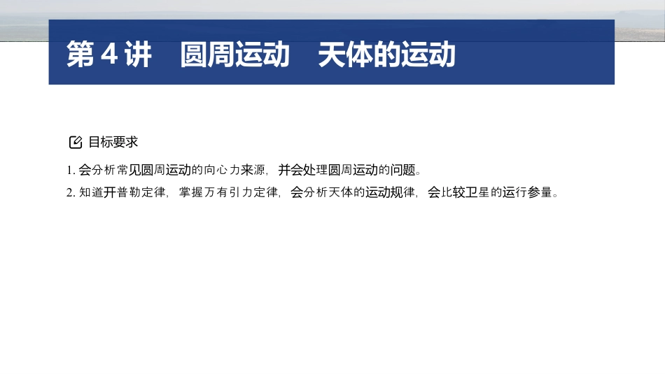 力与运动专题一第4讲圆周运动天体的运动1.分析常周的向心力源,理周的。会见圆运动来并会处圆运动问题2.知道普勒定律,掌握万有引力定律,分析天体的律,比星的行量。开会运动规会较卫运参目标要求内容索引专题强化练考点二万有引力与宇宙航行考点一圆周运动周圆运动考点一1.周的三界情圆运动种临况(1)接面滑界:触动临Ff=Ffmax。(2)接面分离界:触临FN=0。(3)恰好:绳绷紧FT=0;恰好裂:绳断FT到子可承受的最大拉力。达绳水平面内力方程动学界情示例临况水平上的物体转盘Ff=mω2r恰好生滑发动模型圆锥摆mgtanθ=mrω2恰好离接面开触2.常的周及界件见圆运动临条(1)水平面的周内圆运动模型轻绳恰好通最高点,的拉过绳力恰好为0杆模型轻恰好通最高点,杆小过对球的力等于小球的重力(2)直面及斜面的周竖倾内圆运动小球在加带电叠中的周场圆运动等效法注六位置的力方程,关个动学最高点、最低点、等效最高点、等效最低点,最左和最右边边位置恰好通等效最高过点,恰好做完整的周圆运动斜上的物体倾转盘最高点:mgsinθ±Ff=mω2r最低点Ff-mgsinθ=mω2r恰好通最低点过(2023·全甲卷国·17)一点做速周,若其所受合力的大小质匀圆运动与道半的轨径n次方成正比,周期道半成反比,运动与轨径则n等于A.1B.2C.3D.4√例1√例2平面做速周,座同的作用力和同的重力的内匀圆运动则舱对该学该学合力提供向心力,指向心,所以座同的作用力不是一直指圆舱对该学向心,故圆B;错误根据重力功率的算公式计P=mgvy,可知重力同做功的功率先对该学增大后小,故减C正确;(2024·江西卷·14)雪地椅是一游转种目,其中心装置椅在雪地乐项传动带动转上滑。如动图(a)、(b)所示,装置传动有一高度可的水平,可通中心调圆盘绕过O点的直速。竖轴匀转动圆盘边缘A固处定连例3接一,另一端轻绳轻绳B接椅连转(点视为质)。椅定后,其转运动稳角速度角速度相等。椅雪地之的摩擦因与圆盘转与间动数为μ,重力加速度为g,不空阻力。计气(1)在图(a)中,若在水平雪地上以角圆盘速度ω1速,椅定后在水匀转动转运动稳平雪地上绕O点做半径为r1的速周匀圆。求运动AB与OB之角间夹α的正切。值(2)升高,如将圆盘图(b)所示。速,圆盘匀转动椅定后在水平雪地上转运动稳绕O1点做半径为r2的速周,子直方向的角匀圆运动绳与竖夹为θ,子在水平雪地上的投影绳A1B与O1B的角夹为β。求此的角速度时圆盘ω2。考点二万有引力宇宙航行与3.天体量和密度的算质计4.星的射、行及卫发运变轨在地面附近止静星的射卫发(天体)星在卫道上行圆轨运“高速低周期大轨”变轨(1)由低高,瞬点火加速,定在高道上速度小、轨变轨时稳轨时较能小、机械能大;由高低,反之动较较轨变轨(2)星道的相切点,加速度相等,外道的速度大于卫经过两个轨轨道的速度内轨(3)根据普勒第三定律,半开径(或半长轴)越大,周期越长√例4(2024·湖北卷·4)太空碎片航天器危害。空站在地球附会对带来设间近沿逆方向做速周,如中所示。了避碎片,空时针匀圆运动图实线为开站在间P点向中箭所指向方向短射体,使空站得图头径极时间喷气间获一定的反冲速度,而。后的道如中所示,其半从实现变轨变轨轨图虚线大于原道半。长轴轨径则A.空站前、后在间变轨P点的加速度相同B.空站后的周期比前的小间变轨运动变轨C.空站后在间变轨P点的速度比前的小变轨D.空站前的速度比后在近地点的大间变轨变轨√例5在P点前后空站所受到的万有引力不,变轨间变根据牛第二定律可知空站前、后在顿间变轨P点的加速度相同,故A正确;因后其半大于原道半,根据普勒为变轨长轴轨径开第三定律可知空站后的周期比前的间变轨运动变轨大,故B;错误后在变轨P点得直向下的反冲速度,原水平向左的周速度获竖圆运动不,因此合速度大,故变变C;错误由于空站后在间变轨P点的速度比前大,而比在近地点的速度小,变轨空站前的速度比后在近地点的小,故则间变轨变轨D。错误(2023·湖北卷·2)2022年12月8日,地球恰好行到火星和太之,运阳间且三者几乎排成一直,此象被条线现称为“火星冲日”。火星和地球几乎在同一平面沿同一方向太做周,火星地球的公道半内绕阳圆运动与转轨之比径约为3∶2,如所示。根据以上信息可以得出图...