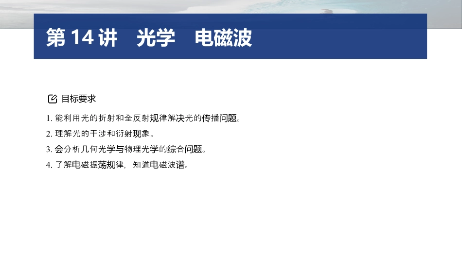 热学光学近代物理专题五1.能利用光的折射和全反射律解光的播。规决传问题2.理解光的干涉和衍射象。现3.分析几何光物理光的合。会学与学综问题4.了解磁振律,知道磁波。电荡规电谱目标要求第14讲光学电磁波知识体系内容索引考点三电磁波考点二光的干涉与衍射考点一光的折射与全反射专题强化练考点一光的折射全反射与3.求解光的折射和全反射的思路问题(1)根据意出正确的光路,特注意全反射的界光。题画图别临线(2)利用几何系确定光路中的、角系。关边关(3)利用折射定律等公式求解。(4)注意折射象中光路的可逆性。现(2022·河北卷·16(2))如,一半图个径为R的玻璃球,O点球心。球面色点光源为内侧单S出发的一束光在A点射出,出射光线AB球直与径SC平行,θ=30°。光在空中的播速度真传为c。求:(1)玻璃的折射率;例1(2)从S出的光多次全反射回到发线经S点的最短。时间(2024·山卷东·15)某光件截面如所示,学组横图半形玻璃心圆砖圆为O点,半径为R;直角三棱镜FG的延边长线过O点,EG平行于边AB且边度等于长R,∠FEG=30°。截面所在平面,横内色光以单线θ角入射到EF生折射,折射光边发线垂直EG射边例2出。已知玻璃和三色光的折射率均砖棱镜对该单为1.5。(1)求sinθ;答案0.75(2)以θ角入射的色光,若第一次到半弧单线达圆AMB可以生全反射,求光在发线EF上入射点D(中未出图标)到E点距离的范。围例3光的干涉衍射与考点二1.光的干涉象:现干涉、薄膜干涉双缝(油膜、空膜、增透膜、牛气顿环)。2.光的衍射象:现衍射、孔衍射、光衍射、泊松亮斑。单缝圆栅3.光的干涉和衍射的比双缝单缝较干涉双缝衍射单缝生件发条束光率相同、相位差两频恒定障碍物或的尺寸足狭缝够小(明衍射象显现)不图样同点度条纹宽度相等条纹宽度不等,中央最条纹宽宽距条纹间各相距相等邻条纹间各相距不等邻条纹间亮度情况晰,亮度基本相等清条纹中央最亮,暗条纹两边变光的偏振的与区别干涉、衍射都是波特有的象;现光的偏振象明光是波现说横例4√√(多选)(2024·湖南省北盟二模师联)甲是用光的干涉法物体图来检查平面平整程度的装置,其中A准平板,为标B被其平面的物体,为检查C入射光,乙和丙分次察到的干涉,下列法正确为图图别为两观条纹说的是A.当A、B之某距离入射光的半波奇倍,是暗间处为长数时对应条纹条纹B.当A、B之某距离入射光的半波奇倍,是亮间处为长数时对应条纹条纹例5√√空厚度相同的地方,列光波的光程差相同,气层两当A、B之某间处距离的倍入射光的半波奇倍,根据加原理可知两为长数时叠对应条纹是暗,故条纹A,错误B正确;空干涉是等厚干涉,即同一空膜的厚度相同;乙中气层条纹处气从图曲的可知,曲是凸起的,故弯条纹弯处C;错误由丙可知,被平面的位置偏左,即左的空膜厚度图检查条纹边处气与后面的空膜厚度相同,所以是凹陷的,其他的气该条纹处该条纹与条平行,可知被平面上有凹陷,故纹检查沟状D正确。(2024·安徽省部分校考一模学联)如甲所示,一平板玻璃图将块a放置在另一平板玻璃板块b上,在右端入薄片。色光上夹两张纸当单从方垂直射入后,上往下看可以察到如乙所示的干涉。下列从观图条纹则法正确的是说A.干涉是由条纹a、b玻璃板上表两面反射的光加生的叠产B.若增大垂直射入的色光波,仅单长疏则条纹将变C.将b慢向下平移,之的距离大缓则条纹间将变D.若抽去一薄片,密张纸则条纹将变√变式1一多题变(2021·山卷东·7)用平行色光垂直照射一透明薄膜,察到如单层观所示明暗相的干涉。下列于域薄膜厚度图间条纹关该区d坐随标x的变化像,可能正确的是图√变式2(2024·江省中、省常中、溧中苏锡阳学调研)如甲所示牛图为顿环装置示意,一曲率半大的平凸透放在一玻璃平板上,用图将块径较镜块色光照射透玻璃板,就可以察到一些明暗相的同心,如单镜与观间圆环乙所示。如果下方的玻璃平板成凸面朝上的平凸透,如丙,图将换镜图察到的可能是则观条纹√变式3凸透的凸球面和玻璃平板之形成一空薄膜,直向下的平镜间个气当竖行光射向平凸透,尖劈形空膜上、下表面反射的束光相互镜时气两叠加而生干涉。同一半的的空膜厚度相同,上、下表面反产径圆环处气射光程差相同,因此使干涉呈。若下方的玻璃平...