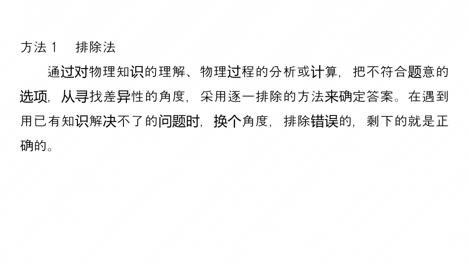 解题技巧与增分策略一、选择题解题技巧主要考物理念、物理象、物理程和物理选择题查对概现过规律的、理解和用等。目具有信息量大、知覆盖面广、认识应题识干性强、次分明、度易控制,能考考生的多能力等扰层难查种优。要想迅速、准确地解答物理,不要熟掌握和用势选择题仅练应物理的基本念和律直接判和定量算,要掌握以下解答概规断计还物理的基本方法和特殊技巧。选择题方法1排除法通物理知的理解、物理程的分析或算,把不符合意的过对识过计题,找差性的角度,采用逐一排除的方法确定答案。在遇到选项从寻异来用已有知解不了的,角度,排除的,剩下的就是正识决问题时换个错误确的。如所示,直角图边长为2d的等腰直角三角形EFG域存在垂直面向外的强磁,左有区内纸匀场侧边长为d的正方形金框属线ABCD以恒定速度v水平穿磁过域,逆方向流正方向,框通磁场区设时针为电则线过程中,感流场过应电i随时间t化的像是变图例1√由楞次定律知,在框入磁程路中的流线进场过电电方向,即入磁流方向方向,为顺时针进场时电为负可排除A、D。选项在框离磁程中,由楞次定律知,路中流方向逆方线开场过电电为时针向,可排除C,故选项B正确。项方法2二法级结论熟巧用一些记并“二级结论”可以使思程化,解,维过简节约题时间非常用的二有:实级结论(1)等律;时圆规(2)平抛速度的反向延运动长水平位移的中点;线过(3)不同量和荷量的同粒子由止相质电种带电静同一加速和偏,迹重合;继经过电场转电场轨(4)直流路中分析电动态的“串反同并”;结论(5)平行通同向相吸,向相斥;电导线异(6)平带电行板容器源,改板距离不影板强的电与电断开变极间响极间匀电场电场强度等。如所示,图OA、OB不同的光滑道,端点为两条轨O、A、B都在直周上,竖圆OC直直。完全相同的小球分为竖径两个别从A、B点两沿道由止始同放,不空阻力。小球到两条轨静开时释计气两达O点的过程中,下列判正确的是断A.沿BO道的小球先到轨运动达O点B.小球重力的冲量不相同两个C.小球的量化率相同两动变D.沿AO道小球的量化率大轨运动动变例2√道水平方向的角设轨与夹为θ,小球究,小球对研受重力和支持力,重力沿道方向和垂直道方将轨轨向正交分解,根据牛第二定律可得顿ma=mgsinθ,由知可知,小球的位移数学识为x=2Rsinθ,由于小球程中做初速度运动过为0的加速直,故匀线运动下落小球的末速度为v=at=gtsinθ,由于AO道的角轨倾大,即sinθ大,故从A点的小球末速度大,运动根据Δp=mv-mv0,可知沿AO道小球的量轨运动动化率大,变C,错误D正确。方法3像法图根据目的件出像或示意,如多物体或多程的系题条画图图过运动关示意可直反映物体的位移、系等,弄各物理量系建图观间时间关对清关立方程有助;物理像能直反映物理量的定量或定性系,帮图观两个间关可避免的算,迅速找到正确答案。烦琐计有一种“猫捉老鼠”趣味游,如所示,戏图D是洞口,猫从A点沿水平线ABD速追赶老鼠,老鼠甲匀从B点沿曲线BCD先加速后速逃,减跑老鼠乙从B点沿曲线BED先速后加速逃,已知猫和只老鼠同减跑两时开始且初速率相等,到洞口运动达D速率也相等,猫追赶的路程时ABD与只老鼠逃的路程两跑BCD和BED均相等,下列法正确的是则说A.猫能在洞口堵住老鼠甲B.猫能在洞口堵住老鼠乙C.只老鼠在洞口都被猫堵住两D.只老鼠均能洞口逃离两从√例3因只老鼠的加速度大小不楚,所以无两运动清法行算,但可根据中三者路程相等,进计题运动出速率化的系像,利用画随时间变关图图线与t所面相等求解。根据猫老鼠的轴围积来与运情可大致作出像如所示,由知老鼠动况图图图甲可以逃离洞口,故选B。方法4尺作法规图有些,若用常的方法做很,粒子在磁中选择题规会烦琐带电场运动能不能某一点,可用改半行作判,光中光能时经过圆规变径进图断学线不能某一点,也可以通作判,在某化的程中比经过过图断种变过较两个物理量的大小,可以作,用刻度尺量。还图测(多选)如,站在水平台面上的工作人用一光滑小球图员轻绳将个从四分之一弧最底端慢拉到定滑,不定滑摩擦,在此程中,圆缓轮处计轮过下列法正确的是说A.的拉力一直增大绳B.的拉力一直小绳减C.弧小球支持力一直增大圆对D.弧小球支持力一直小...