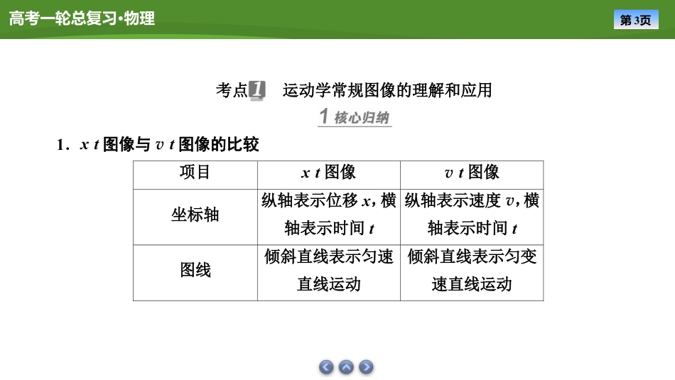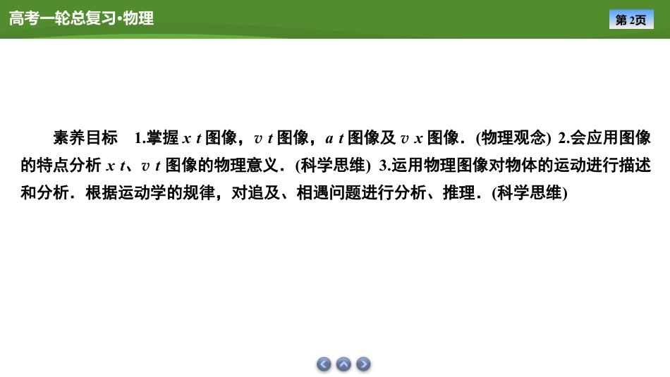 第1页高考一轮总复习•物理专题一运动图像与追及、相遇问题第一章运动的描述匀变速直线运动的研究第2页高考一轮总复习•物理素养目标1.掌握xt图像,vt图像,at图像及vx图像.(物理观念)2.会应用图像的特点分析xt、vt图像的物理意义.(科学思维)3.运用物理图像对物体的运动进行描述和分析.根据运动学的规律,对追及、相遇问题进行分析、推理.(科学思维)第3页高考一轮总复习•物理考点运动学常规图像的理解和应用1.xt图像与vt图像的比较项目xt图像vt图像坐标轴纵轴表示位移x,横轴表示时间t纵轴表示速度v,横轴表示时间t图线倾斜直线表示匀速直线运动倾斜直线表示匀变速直线运动第4页高考一轮总复习•物理项目xt图像vt图像斜率表示速度表示加速度截距纵轴截距表示初位置纵轴截距表示初速度面积无实际意义图线和时间轴围成的面积表示位移大小交点表示物体相遇表示速度相等拐点表示速度方向改变表示加速度方向改变第5页高考一轮总复习•物理2.对运动图像的两点提醒(1)xt图像和vt图像只能描述直线运动,图像不是物体运动的轨迹.(2)xt图像和vt图像的形状由x与t、v与t的函数关系决定,图像中各点的坐标值x、v与t一一对应.第6页高考一轮总复习•物理典例1(2023·全国甲卷)一小车沿直线运动,从t=0开始由静止匀加速至t=t1时刻,此后做匀减速运动,到t=t2时刻速度降为零.在下列小车位移x与时间t的关系曲线中,可能正确的是()答案第7页高考一轮总复习•物理解析:x-t图像的斜率表示速度,小车先做匀加速直线运动,因此速度变大,即0~t1时间内图像斜率逐渐变大;t1~t2时间内做匀减速直线运动,则图像的斜率逐渐变小;在t2时刻速度降为零,图像的斜率变为零.综上所述,D符合题意,故选D.解析第8页高考一轮总复习•物理1.[xt图像与vt图像的比较]甲、乙两物体从同一点开始沿一直线同向运动,甲的xt图像和乙的vt图像如图甲、乙所示,下列说法正确的是()A.0~6s内,甲物体做单向直线运动B.第3s内,甲、乙两物体速度方向相反C.0~3s内,甲、乙两物体位移大小都为零D.第2s末到第4s末甲的位移大小为8m,乙的位移大小为4m答案第9页高考一轮总复习•物理解析:对甲物体,题图甲中0~2s内物体沿正方向做匀速直线运动,2~4s内物体沿负方向做匀速直线运动,4~6s内物体沿正方向做匀速直线运动,A错误;甲物体在2~3s内沿负方向运动,乙物体在2~3s内速度为正,沿正方向运动,则第3s内两物体的速度方向相反,B正确;0~3s内,根据题图甲可知甲的位移x甲=0,根据题图乙中vt图像与时间轴围成的面积表示位移大小可知,0~3s内乙物体的位移为x乙=12×3×4m=6m,C错误;在xt图像中,根据位移等于纵坐标的变化量可知,2~4s内甲的位移为x甲=-4m-4m=-8m,即第2s末到第4s末甲的位移大小为8m,由vt图像面积的物理意义可知,第2s末到第4s末乙的位移大小为零,D错误.解析第10页高考一轮总复习•物理2.[对at图像的理解](多选)t=0时刻,质点P从原点由静止开始做直线运动,其加速度a随时间t按图示的正弦曲线变化,周期为2t0.在0~3t0时间内,下列说法正确的是()A.t=2t0时,P回到原点B.t=2t0时,P的运动速度最小C.t=t0时,P到原点的距离最远D.t=32t0时,P的运动速度与t=12t0时相同答案第11页高考一轮总复习•物理解析:质点在0~t0时间内由静止开始,先做加速度增大的加速运动,再做加速度减小的加速运动,此过程一直向前做加速运动;t0~2t0时间内加速度和速度反向,先做加速度增大的减速运动,再做加速度减小的减速运动,2t0时刻速度减为零,此过程一直向前做减速运动;2t0~4t0时间内重复此过程的运动,即质点一直向前运动,A、C错误,B正确.a-t图像的面积表示速度变化量的大小,t02~32t0时间内速度的变化量为零,因此12t0时刻的运动速度与32t0时刻相同,D正确.解析第12页高考一轮总复习•物理考点运动学非常规图像的理解和应用图像类型图像重要信息xtt图像由x=v0t+12at2可得xt=v0+12at,图像的斜率为12a,纵截距为初速度v0第13页高考一轮总复习•物理图像类型图像重要信息v2x图像由v2-v20=2ax得v2=v20+2ax,图像斜率为2a,纵截距为v20ax图像根据v2-v20=2ax知,图像...