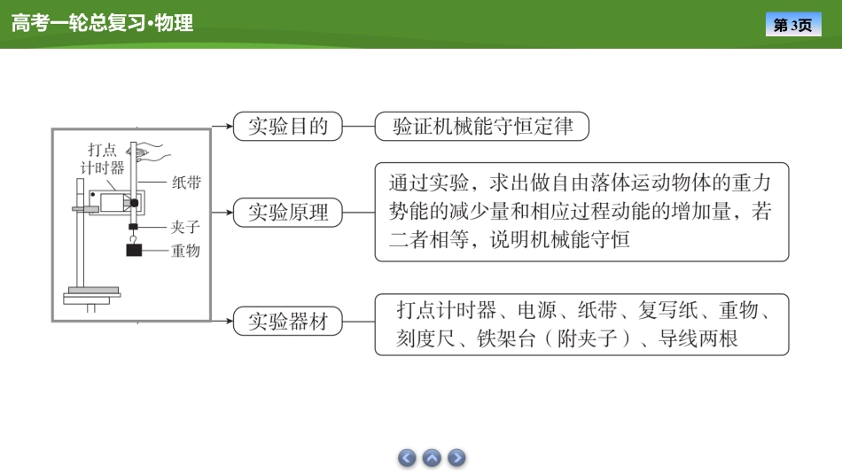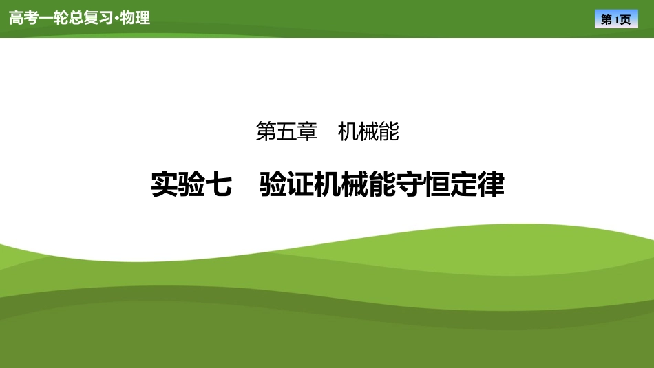 第1页高考一轮总复习•物理实验七验证机械能守恒定律第五章机械能第2页高考一轮总复习•物理实验基础记熟背牢第3页高考一轮总复习•物理第4页高考一轮总复习•物理第5页高考一轮总复习•物理第6页高考一轮总复习•物理●注意事项1.打点计时器要竖直:安装打点计时器时要竖直架稳,使其,以减小摩擦阻力.2.重物密度要大:重物应选用.3.一先一后:应,让打点计时器正常工作,让重物下落.4.测长度,算速度:某时刻的瞬时速度的计算应用vn=hn+1-hn-12T,不能用vn=2ghn或vn=gt来计算.两限位孔在同一竖直线上质量大、体积小、密度大的材料先接通电源后松开纸带第7页高考一轮总复习•物理●误差分析误差产生原因减小方法偶然误差测量长度带来的误差(1)测量距离时应从计数点0量起,且选取的计数点离0点远些.(2)多次测量取平均值系统误差重物和纸带下落过程中存在阻力(1)打点计时器安装稳固,并使两限位孔在同一竖直线上,以减小摩擦阻力.(2)选用质量大、体积小的物体作重物,以减小空气阻力的影响第8页高考一轮总复习•物理原型实验创新改进第9页高考一轮总复习•物理考点教材原型实验典例(2021·浙江6月选考)在“验证机械能守恒定律”实验中,小王用如图1所示的装置,让重物从静止开始下落,打出一条清晰的纸带,其中的一部分如图2所示.O点是打下的第一个点,A、B、C和D为另外4个连续打下的点.第10页高考一轮总复习•物理(1)为了减小实验误差,对体积和形状相同的重物,实验时选择密度大的,理由是____________________________________________.(2)已知交流电频率为50Hz,重物质量为200g,当地重力加速度取g=9.80m/s2,则从O点到C点,重物的重力势能变化量的绝对值|ΔEp|=__________________________J、C点的动能EkC=____________________________J(计算结果均保留3位有效数字).比较EkC与|ΔEp|的大小,出现这一结果的原因可能是________.A.工作电压偏高B.存在空气阻力和摩擦力C.接通电源前释放了纸带使阻力与重力之比更小,减小实验的相对误差0.547(0.542~0.550均正确)0.582(0.570~0.590均正确)C第11页高考一轮总复习•物理解析:(1)对体积和形状相同的重物,密度大的质量大,重力大,重物运动过程所受阻力与重力之比就更小,实验的相对误差就更小.(2)由题图2读出OC的距离为ΔxOC=xC-xO=27.90cm-0=27.90cm=0.2790m重物的重力势能变化量的绝对值|ΔEp|=mgΔxOC=200×10-3×9.80×0.2790J=0.547J交流电频率f=50Hz,打连续点迹的时间间隔T=1f=150s=0.02s根据匀变速直线运动一段时间的平均速度等于这段时间中间时刻的瞬时速度,可知打C点的速度vC=ΔxBD2T=xD-xB2T=33.00-23.35×10-22×0.02m/s=2.413m/s第12页高考一轮总复习•物理C点的动能EkC=12mv2C=12×200×10-3×2.4132J=0.582J由实验结果可知:EkC大于|ΔEp|打点计时器的工作电压偏高,并不会影响重物与纸带的受力与运动,对实验结果无影响,故A错误;重物与纸带下落过程中受到空气阻力和摩擦力,会损失机械能,所以减少的重力势能应大于增加的动能,与实验结果不符,故B错误;接通电源前释放了纸带,会使打下第一个点时重物已经具有了速度,即重物的初速度大于零,则使末动能偏大,符合实验结果,故C正确.第13页高考一轮总复习•物理变式某同学利用如图甲所示的装置验证机械能守恒定律,实验中打出如图乙所示的纸带,已知打点计时器所用交流电源的频率为50Hz.第14页高考一轮总复习•物理(1)下列关于该实验的说法正确的是________.A.纸带必须尽量保持沿竖直方向以减小摩擦阻力作用B.为了验证机械能守恒定律,必须选择纸带上打出的第一个点作为起点C.将电磁打点计时器改成电火花计时器可以减小纸带和打点计时器间的摩擦D.选择较轻的物体作为重物时实验效果更好(2)图乙为实验中打出的一条纸带,打下C点时重物的速度为________m/s(结果保留3位有效数字).AC2.26第15页高考一轮总复习•物理(3)该同学用两个形状完全相同但质量不同的重物P和Q分别进行实验,测得几组数据,并作出v2h图像,如图丙所示,由图可判断P的质量________(填“大于”或“小于”)Q的质量.大于第16...