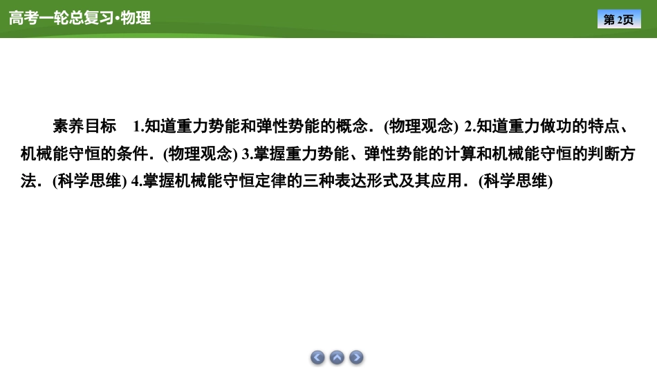 第1页高考一轮总复习•物理第3讲机械能守恒定律第五章机械能第2页高考一轮总复习•物理素养目标1.知道重力势能和弹性势能的概念.(物理观念)2.知道重力做功的特点、机械能守恒的条件.(物理观念)3.掌握重力势能、弹性势能的计算和机械能守恒的判断方法.(科学思维)4.掌握机械能守恒定律的三种表达形式及其应用.(科学思维)第3页高考一轮总复习•物理理清教材强基固本第4页高考一轮总复习•物理一、重力做功与重力势能1.重力做功的特点(1)重力做功与无关,只与始末位置的有关.(2)重力做功不引起物体的变化.2.重力势能(1)表达式:Ep=.(2)重力势能的特点重力势能是物体和所共有的;重力势能的大小与参考平面的选取,但重力势能的变化与参考平面的选取.路径高度差机械能mgh地球有关无关第5页高考一轮总复习•物理3.重力做功与重力势能变化的关系(1)定性关系:重力对物体做正功,重力势能;重力对物体做负功,重力势能.(2)定量关系:重力对物体做的功等于物体重力势能的减小量.即WG==.直观情境如图所示,自由下落的小球从位置1运动到位置2,WG=mg(h1-h2)=mgh1-mgh2即WG=Ep1-Ep2减小增大Ep1-Ep2-ΔEp第6页高考一轮总复习•物理二、弹性势能1.弹性势能(1)定义:发生弹性形变的物体之间,由于有弹力的相互作用而具有的势能,叫作弹性势能.(2)弹簧弹性势能的大小与形变量及有关.(3)标矢性:.(4)没有特别说明的情况下,一般选弹簧形变为零的状态为弹性势能零点.劲度系数标量第7页高考一轮总复习•物理2.弹力做功与弹性势能变化的关系(1)弹力做功与弹性势能变化的关系类似于重力做功与重力势能变化的关系,用公式表示:W=.(2)对于弹性势能,一般物体的弹性形变量越大,弹性势能.直观情境物体在弹簧弹力作用下在光滑水平面上往复运动,A、B为端点,O为平衡位置.从A→O:W弹>0,Ep↓;从O→B:W弹<0,Ep↑Ep1-Ep2越大第8页高考一轮总复习•物理三、机械能守恒定律1.机械能:和统称为机械能,其中势能包括和.2.机械能守恒定律(1)内容:在只有做功的物体系统内,动能与势能可以相互转化,而总的机械能.(2)守恒条件:只有重力或弹簧的弹力做功.动能势能弹性势能重力势能重力或弹力保持不变第9页高考一轮总复习•物理(3)表达式:mgh1+12mv21=.直观情境沿光滑斜面运动单摆摆动物体上下振动系统mgh2+12mv22.第10页高考一轮总复习•物理1.思维辨析(1)重力势能的变化与零势能参考面的选取无关.()(2)克服重力做功,物体的重力势能一定增加.()(3)发生形变的物体都具有弹性势能.()(4)弹力做正功,弹性势能一定增加.()(5)物体所受的合力为零,物体的机械能一定守恒.()√√第11页高考一轮总复习•物理2.(多选)把小球放在竖立的弹簧上,并把球往下按至A位置,如图甲所示.迅速松手后,球升高至最高位置C(图丙),途中经过位置B时弹簧正处于原长(图乙).忽略弹簧的质量和空气阻力.则小球从A位置运动到C位置的过程中,下列说法正确的是()A.经过位置B时小球的加速度为0B.经过位置B时小球的速度最大C.小球、地球、弹簧所组成的系统机械能守恒D.小球的机械能先增大后不变答案第12页高考一轮总复习•物理解析:当重力和弹簧弹力大小相等时,小球速度最大,此时加速度为零,选项A、B错误;小球、地球、弹簧所组成的系统在此过程中只有重力和弹簧弹力做功,机械能守恒,选项C正确;小球的机械能指动能与重力势能之和,从A到B过程中,弹力做正功,机械能增加,脱离弹簧后,小球只受重力,机械能守恒,选项D正确.解析第13页高考一轮总复习•物理3.(多选)如图所示,在地面上以速度v0抛出质量为m的物体,抛出后物体落到比地面低h的海平面上,若以地面为参考平面且不计空气阻力,重力加速度为g,则下列说法中正确的是()A.物体落到海平面时的重力势能为mghB.物体从抛出到落到海平面的过程重力对物体做功为mghC.物体在海平面上的动能为12mv20+mghD.物体在海平面上的机械能为12mv20答案第14页高考一轮总复习•物理解析:物体运动过程中,机械能守恒,所以在任意一点的机械能均相等,都等于抛出时的机械能.物体在地面上的重力势能为零,动能为12mv20,故整个过程...