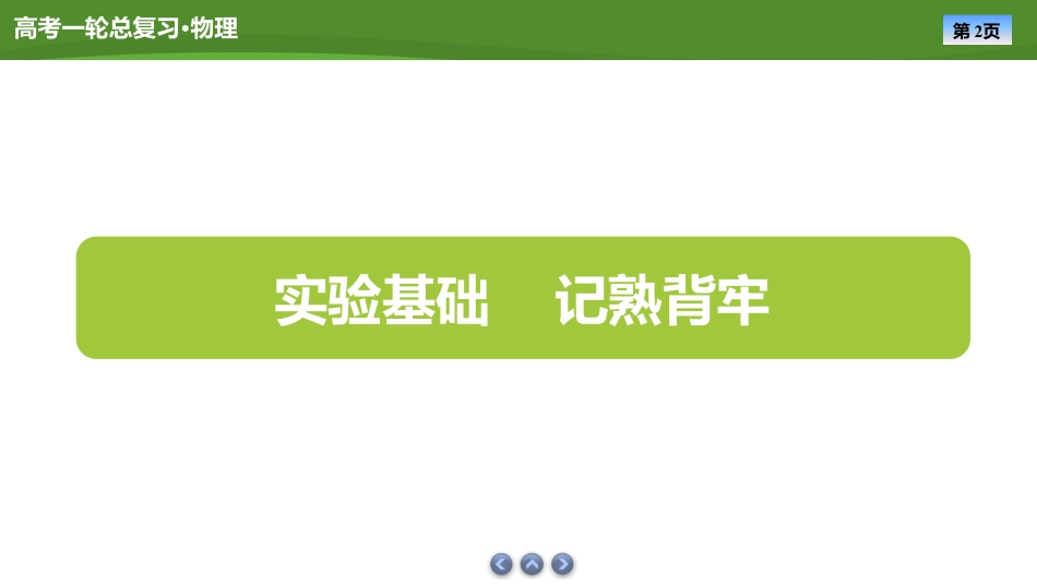 第1页高考一轮总复习•物理实验五探究平抛运动的特点第四章曲线运动万有引力与航天第2页高考一轮总复习•物理实验基础记熟背牢第3页高考一轮总复习•物理第4页高考一轮总复习•物理第5页高考一轮总复习•物理第6页高考一轮总复习•物理●注意事项1.固定斜槽时,,保证小球的初速度沿水平方向.2.固定木板时,木板必须处在竖直平面内且与小球运动轨迹所在的竖直平面平行,固定时要用重垂线检查坐标纸竖线是否竖直.3.为保证小球每次从斜槽上的,可在斜槽上某一位置固定一个挡板.4.要在斜槽上适当高度释放小球,使它以适当的水平初速度抛出,其轨迹由木板左上角到达右下角,这样可以减小测量误差.5.坐标原点不是槽口的端点,应是.要保证斜槽末端的切线水平同一位置由静止释放小球出槽口时球心在木板上的投影点第7页高考一轮总复习•物理原型实验创新改进第8页高考一轮总复习•物理考点教材原型实验典例(2023·广东汕头二模)小晗同学利用如图甲所示装置研究平抛运动的规律.实验时该同学使用手机连拍功能对做平抛运动的小球进行拍摄,并将拍摄到的图片进行叠加处理在一张照片中,图中的背景是放在竖直平面内的带有方格的纸板,纸板与小球轨迹所在平面平行,其上每个方格的边长为10cm.第9页高考一轮总复习•物理(1)下列说法正确的是________.A.实验所用斜槽应尽量光滑B.斜槽末端必须保持水平C.实验所用斜槽不需要尽量光滑(2)图乙是实验中小球从斜槽上不同位置由静止释放获得的两条轨迹,图线①所对应的小球在斜槽上释放的位置________(填“较低”或“较高”).(3)某次拍摄后得到的照片如图丙所示,小球做平抛运动的初速度大小v0=________m/s(结果保留2位有效数字,重力加速度取g=10m/s2).(4)该小组利用实验数据绘制“yx2”图线,发现是一条过原点的直线,由此判断小球下落的轨迹是抛物线,并求得斜率k,当地的重力加速度表达式为g=________(用斜率k和初速度v0表示).BC较高2.82kv20第10页高考一轮总复习•物理解析:(1)实验所用斜槽不需要尽量光滑,A错误,C正确;斜槽末端必须保持水平,使小球做平抛运动,B正确.(2)由题图乙可知两次小球做平抛运动下落相同高度时,图线①水平位移更大,故图线①所对应的小球初速度较大,在斜槽上由静止释放的位置较高.(3)由题图丙可得,小球在竖直方向相邻位移之差Δy=2×10cm=0.2m,根据匀变速直线运动特点可得T=Δyg=210s,由水平位移Δx=v0T,可得v0=ΔxT=4×10×10-20.12m/s=22m/s≈2.8m/s.(4)根据平抛运动规律可得x=v0t,y=12gt2,联立可得y=12gxv02=g2v20x2,可知yx2图像的斜率为k=g2v20,当地的重力加速度表达式为g=2kv20.第11页高考一轮总复习•物理变式(2024·湖南模拟)如图甲所示,是“研究平抛物体的运动”的实验装置图.第12页高考一轮总复习•物理(1)为了能较准确地描绘运动轨迹,下面列出了一些操作要求,正确的是.A.通过调节使斜槽末端保持水平B.实验所用斜槽的轨道必须是光滑的C.每次必须由静止释放小球,而且释放小球的位置始终相同D.将小球的位置标在纸上后,取下纸,用直尺将点连成折线(2)如图乙所示是正确实验取得的数据,其中O为抛出点,则此小球做平抛运动的初速度为________m/s(取g=9.8m/s2).(3)在另一次实验中将白纸换成方格纸,每小格的边长L=5cm,通过实验,记录了小球在运动途中的三个位置,如图丙所示,则该小球做平抛运动的初速度为________m/s;若以A点为坐标原点,水平向右和竖直向下为正方向建立直角坐标系,则小球的抛出点坐标为____________________.(取g=10m/s2)AC1.61.5(-15cm,-5cm)第13页高考一轮总复习•物理解析:(1)为了保证小球的初速度水平,需调节斜槽的末端保持水平,故A正确;为了保证小球每次平抛运动的初速度大小相等,应使小球每次从斜槽的同一位置由静止释放,斜槽不一定需要光滑,故B错误,C正确;将小球的位置标在纸上后,取下纸,用平滑曲线连接得到平抛运动的轨迹,故D错误.(2)根据y=12gt2得,平抛运动的时间t=2yg=2×19.6×10-29.8s=0.2s,则小球平抛运动的初速度v0=xt=32.0×10-20.2m/s=1.6m/s.(3)在竖直方向上,根据Δy=...