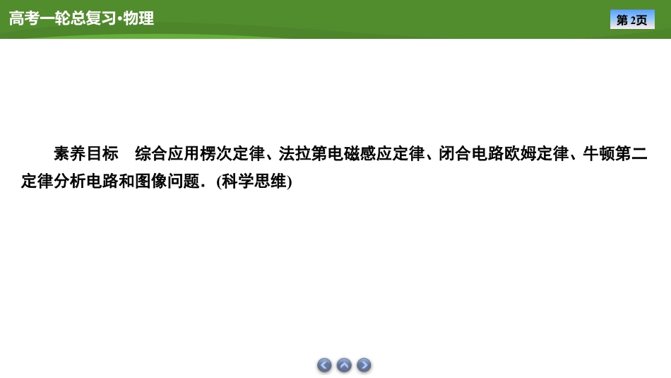 第1页高考一轮总复习•物理专题十一电磁感应中的电路和图像问题第十章电磁感应第2页高考一轮总复习•物理素养目标综合应用楞次定律、法拉第电磁感应定律、闭合电路欧姆定律、牛顿第二定律分析电路和图像问题.(科学思维)第3页高考一轮总复习•物理考点电磁感应中的电路问题1.电磁感应电路中的五个等效问题第4页高考一轮总复习•物理2.电磁感应中电路知识的关系图第5页高考一轮总复习•物理典例1如图所示,导线全部为裸导线,半径为r的圆内有垂直于圆平面的匀强磁场,磁感应强度大小为B,一根长度大于2r的导线MN以速率v在圆环上无摩擦地从左端匀速滑到右端,回路中的定值电阻阻值为R,其余电阻不计.试求:(1)MN从圆环左端滑到右端的过程中,电阻R上的电流的平均值及通过的电荷量;(2)MN从圆环左端滑到右端的过程中,电阻R上的电流的最大值.第6页高考一轮总复习•物理解析:整个回路等效电路图如图所示.(1)从左端到右端磁通量的变化量大小ΔΦ=BΔS=Bπr2从左端到右端的时间Δt=2rv根据法拉第电磁感应定律,平均感应电动势E=ΔΦΔt=Bπr22rv=Bπvr2所以,回路中平均感应电流I=ER=Bπvr2R通过R的电荷量q=IΔt=Bπvr2R·2rv=Bπr2R.第7页高考一轮总复习•物理(2)在等效电路图中,等效电源电动势为EMN=Blv当导线运动到圆环的圆心处时,切割磁感线的有效长度最大,产生的感应电动势也就最大,电阻R上的电流也就最大,此时Em=B·2r·v,且Im=EmR,由以上两式得Im=2BrvR.答案:(1)Bπvr2RBπr2R(2)2BrvR第8页高考一轮总复习•物理1.[磁通量变化产生感应电动势](多选)如图甲所示,螺线管匝数n=1000,横截面积S=0.02m2,电阻r=1Ω,螺线管外接一个阻值R=4Ω的电阻,电阻的一端b接地.一方向平行于螺线管轴线向左的磁场穿过螺线管,磁感应强度随时间变化的规律如图乙所示,则()A.在0~4s时间内,R中有电流从a流向bB.在t=3s时,穿过螺线管的磁通量为0.07WbC.在4~6s时间内,通过R的电流大小为8AD.在4~6s时间内,R两端电压Uab=40V答案第9页高考一轮总复习•物理解析:在0~4s时间内,原磁场增大,则穿过螺线管的磁通量增大,根据楞次定律可知,感应磁场方向向右,由安培定则可知,R中的电流方向从b流向a,故A错误;由题图乙可知,t=3s时磁感应强度为B=3.5T,则此时穿过螺线管的磁通量为Φ=BS=3.5×0.02Wb=0.07Wb,故B正确;在4~6s时间内,感应电动势为E=nΔB·SΔt=1000×4×0.022V=40V,则通过R的电流大小为I=ER+r=404+1A=8A,故C正确;在4~6s时间内,根据楞次定律可知,R中的电流从a流向b,则R两端电压为Uab=IR=8×4V=32V,故D错误.解析第10页高考一轮总复习•物理2.[导体棒切割产生感应电动势](多选)如图所示,光滑的金属框CDEF水平放置,宽为L,在E、F间连接一阻值为R的定值电阻,在C、D间连接一滑动变阻器R1(0≤R1≤2R).框内存在着竖直向下的匀强磁场.一长为L、电阻为R的导体棒AB在外力作用下以速度v匀速向右运动.金属框电阻不计,导体棒与金属框接触良好且始终垂直,下列说法正确的是()A.ABFE回路的电流方向为逆时针,ABCD回路的电流方向为顺时针B.左右两个闭合区域的磁通量都在变化且变化率相同,故电路中的感应电动势大小为2BLvC.当滑动变阻器接入电路中的阻值R1=R时,导体棒两端的电压为23BLvD.当滑动变阻器接入电路中的阻值R1=R2时,滑动变阻器有最大电功率且为B2L2v28R答案第11页高考一轮总复习•物理解析:根据楞次定律可知,ABFE回路电流方向为逆时针,ABCD回路电流方向为顺时针,故A正确;根据法拉第电磁感应定律可知,感应电动势E=BLv,故B错误;当R1=R时,外电路总电阻R外=R2,因此导体棒两端的电压即路端电压应等于13BLv,故C错误;该电路电动势E=BLv,电源的内阻为R,求解滑动变阻器的最大电功率时,可以将导体棒和电阻R看成新的等效电源,等效内阻为R2,故当R1=R2时,等效电源的输出功率最大,即滑动变阻器的电功率最大,最大值Pm=U2R1R1=14E2R2=B2L2v28R,故D正确.解析第12页高考一轮总复习•物理考点电磁感应中的图像问题1.图像问题的求解类型类型根据电磁感应过程选图像根据图像分析...
