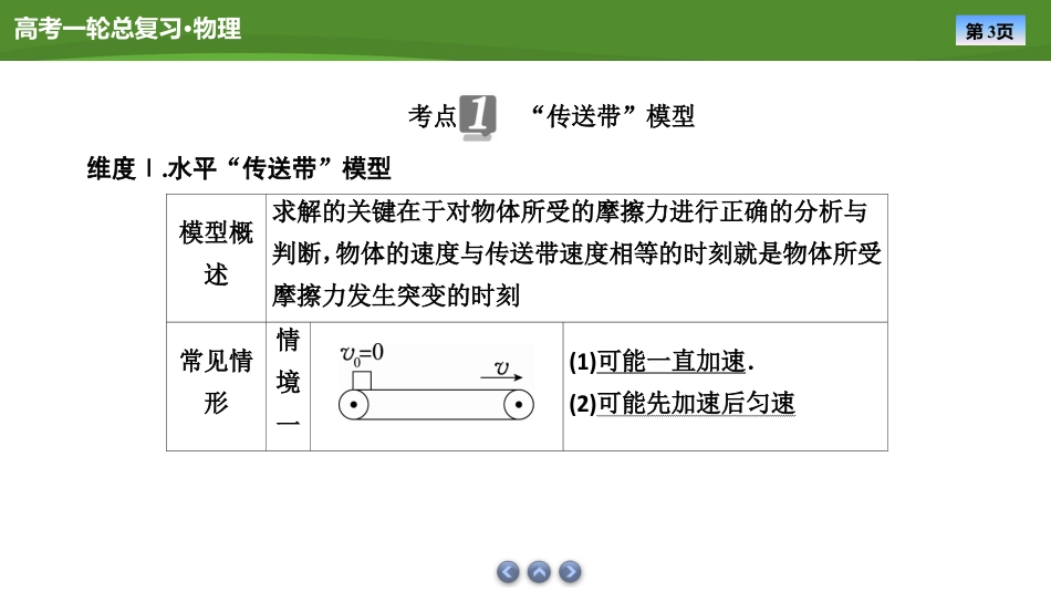 第1页高考一轮总复习•物理专题四应用牛顿运动定律解决传送带和板块模型第三章牛顿运动定律第2页高考一轮总复习•物理素养目标1.应用动力学观点分析传送带模型.(科学思维)2.应用动力学观点分析滑块—木板模型.(科学思维)第3页高考一轮总复习•物理考点“传送带”模型维度Ⅰ.水平“传送带”模型模型概述求解的关键在于对物体所受的摩擦力进行正确的分析与判断,物体的速度与传送带速度相等的时刻就是物体所受摩擦力发生突变的时刻常见情形情境一(1)可能一直加速.(2)可能先加速后匀速第4页高考一轮总复习•物理常见情形情境二(1)v0>v时,可能一直减速,也可能先减速再匀速.(2)v0<v时,可能一直加速,也可能先加速再匀速情境三(1)传送带较短时,滑块一直减速到达左端.(2)传送带较长时,滑块还要被传送带传回右端,其中v0>v时,返回速度为v;v0<v时,返回速度为v0第5页高考一轮总复习•物理常见情形情境四(1)若μg≥a0,物块和传送带一起以加速度a0加速运动,物块受到沿传送带前进方向的静摩擦力f=ma0.(2)若μg<a0,物块将跟不上传送带的运动,即物块相对于传送带向后滑动,但物块相对地面仍然是向前加速运动的,此时物块受到沿传送带前进方向的滑动摩擦力f=μmg,产生的加速度a=μg第6页高考一轮总复习•物理典例1如图所示,水平方向的传送带顺时针转动,传送带速度大小v=2m/s不变,两端A、B间距离为3m.一物块从B端以初速度v0=4m/s滑上传送带,物块与传送带间的动摩擦因数μ=0.4,取g=10m/s2.物块从滑上传送带至离开传送带的过程中,选项图中速度随时间变化的关系正确的是()第7页高考一轮总复习•物理解析:物块刚滑上传送带时,速度方向向左,与传送带速度方向相反,因此受到传送带对其向右的滑动摩擦力,使物块做匀减速运动,由牛顿第二定律有μmg=ma,得a=μg=4m/s2;当物块的速度减小到0时,物块的运动满足0-v20=-2as,得物块前进的距离s=0-v20-2a=0-42-2×4m=2m<LAB=3m,故物块的速度减到0时未从传送带左端滑落.此时物块仍然受到向右的滑动摩擦力,加速度不变,向右做初速度为0的匀加速运动,满足v2=2as′,其速度与传送带的速度相等时物块向右滑行的距离为s′=v22a=222×4m=0.5m,其值小于物块向左减速运动的距离,说明物块仍在传送带上,之后物块相对于传送带静止,其速度大小等于传送带的速度大小,选项B正确.故选B.解析第8页高考一轮总复习•物理变式1如图1所示为地铁的包裹安检装置,其传送包裹部分可简化为如图2所示的传送带示意图.若安检时某乘客将可视为质点的包裹静止放在传送装置的最左端,传送装置始终以v0=0.5m/s的速度顺时针匀速运动,包裹与传送装置间的动摩擦因数为μ=0.05,传送装置全长l=2m,包裹传送到最右端时乘客才能将其拿走,重力加速度取g=10m/s2.(1)求当包裹与传送装置相对静止时,包裹相对于传送装置运动的距离;(2)若乘客将包裹放在传送装置上后,立即以v=1m/s的速度匀速从传送装置最左端走到传送装置的最右端,求乘客要想拿到包裹,需要在传送装置最右端等待的时间.第9页高考一轮总复习•物理解析:(1)设包裹的质量为m,包裹加速阶段的加速度大小为a,则由牛顿第二定律可得μmg=ma解得a=0.5m/s2包裹加速到v0所用的时间为t1=v0a解得t1=1st1时间内包裹的位移大小为x1=12at21解得x1=0.25mt1时间内传送装置的位移大小为x2=v0t1解得x2=0.5m第10页高考一轮总复习•物理故包裹相对于传送装置运动的距离为Δx=x2-x1=0.25m.(2)包裹在传送装置上匀速运动的时间为t2=l-x1v0,解得t2=3.5s乘客从传送装置的最左端走到最右端所用的时间为t3=lv解得t3=2s故乘客需要在传送装置最右端等待的时间为Δt=t1+t2-t3=2.5s.答案:(1)0.25m(2)2.5s第11页高考一轮总复习•物理维度Ⅱ.倾斜“传送带”模型模型概述求解的关键在于分析清楚物体与传送带的相对运动情况,从而确定其是否受到滑动摩擦力作用,当物体速度与传送带速度相等时,物体所受的摩擦力有可能发生突变常见情形情境一(1)可能一直加速.(2)可能先加速后匀速情境二(1)可能一直加速.(2)可能先加速后匀速.(3)可能一直减速.(4)可能先减速后匀速.(5)...