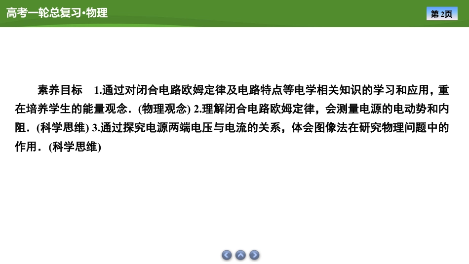 第1页高考一轮总复习•物理第2讲电路电路的基本规律第八章恒定电流第2页高考一轮总复习•物理素养目标1.通过对闭合电路欧姆定律及电路特点等电学相关知识的学习和应用,重在培养学生的能量观念.(物理观念)2.理解闭合电路欧姆定律,会测量电源的电动势和内阻.(科学思维)3.通过探究电源两端电压与电流的关系,体会图像法在研究物理问题中的作用.(科学思维)第3页高考一轮总复习•物理理清教材强基固本第4页高考一轮总复习•物理一、串、并联电路的规律项目串联电路并联电路电路电流I=I1=I2=…=InI=电压U=U1+U2+…+UnU=总电阻R总=R1+R2+…+Rn1R总=功率分配P1P2=R1R2P1P2=R2R1I1+I2+…+InU1=U2=…=Un1R1+1R2+…+1Rn第5页高考一轮总复习•物理二、电源的电动势和内阻1.电源电源是把负电荷从正极搬到负极的一种装置;从能的转化角度看,电源是的装置.把其他形式的能量转化为电能第6页高考一轮总复习•物理2.电动势(1)定义:电动势在数值上等于非静电力把1C的在电源内从移送到所做的功.(2)表达式:E=.(3)物理意义:反映电源把其他形式的能转化成电能的本领大小的物理量.3.内阻电源内部也是由导体组成的,也有电阻,叫作电源的,它是电源的另一重要参数.正电荷负极正极W非q内阻第7页高考一轮总复习•物理三、闭合电路的欧姆定律1.内容:闭合电路的电流跟电源的电动势成,跟内、外电路的电阻之和成.2.公式I=只适用于纯电阻电路;E=适用于任何电路.3.路端电压U与电流I的关系(1)关系式:U=.正比反比ER+rU外+U内E-Ir第8页高考一轮总复习•物理(2)UI图像如图所示.①当电路断路即I=0时,纵坐标的截距为.②当外电路电压为U=0时,横坐标的截距为.③图线斜率的绝对值为电源的.电源电动势短路电流内阻第9页高考一轮总复习•物理1.思维辨析(1)电动势的大小反映了电源把电能转化为其他形式的能的本领强弱.()(2)电动势由电源中非静电力的特性决定,与电源的体积无关,与外电路无关.()(3)电路中某电阻增大,该电阻的功率一定增大.()(4)闭合电路中外电阻越大,路端电压越大.()(5)在闭合电路中,外电阻越大,电源的输出功率越大.()√√第10页高考一轮总复习•物理2.(多选)在如图所示的UI图像中,直线Ⅰ为某一电源的路端电压与电流的关系图线,直线Ⅱ为某一电阻R的UI图线.用该电源直接与电阻R相连组成闭合电路,由图像可知()A.电源的电动势为3V,内阻为0.5ΩB.电阻R的阻值为1ΩC.电源的输出功率为4WD.电源的效率为50%答案第11页高考一轮总复习•物理3.(2019·江苏卷)如图所示的电路中,电阻R=2Ω.断开S后,电压表的读数为3V;闭合S后,电压表的读数为2V,则电源的内阻r为()A.1ΩB.2ΩC.3ΩD.4Ω答案第12页高考一轮总复习•物理解析:当S断开后,电压表读数为U=3V,可认为电动势E=3V,当S闭合后,由闭合电路欧姆定律知E=U′+Ir,且I=U′R,整理得电源内阻r=E-U′RU′=1Ω,选项A正确.解析第13页高考一轮总复习•物理重难考点全线突破第14页高考一轮总复习•物理考点闭合电路的分析与计算1.电路动态分析的常用方法(1)程序判断法:遵循“局部→整体→局部”的思路,按以下步骤分析:第15页高考一轮总复习•物理(2)“串反并同”法:所谓“串反”,即某一电阻增大(减小)时,与它串联或间接串联的电阻中的电流、两端电压、电功率都将减小(增大);所谓“并同”,即某一电阻增大(减小)时,与它并联或间接并联的电阻中的电流、两端电压、电功率都将增大(减小).(3)极限法:因滑动变阻器的滑片滑动引起电路变化的问题,可将滑动变阻器的滑片分别滑至两个极端,让电阻最大或电阻为零,然后再讨论有关问题.(4)特殊值法:对有些复杂难以直接判断的问题,可采用特殊值代入帮助分析.第16页高考一轮总复习•物理2.电路动态分析的一般步骤(1)弄清局部电路变化所引起的局部电路电阻的变化.(2)根据局部电路电阻的变化,确定整个电路的外电阻如何变化.(3)根据闭合电路欧姆定律I总=ER外总+r,确定电路总电流如何变化.(4)U内=I总r确定电源内电压如何变化.(5)由U=E-U内确定路端电压如何变化.(6)确定支路...