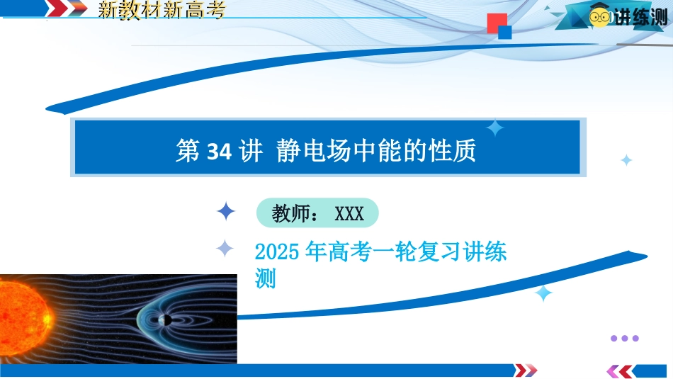 2025教师:XXX2025年高考一轮复习讲练测新材新高考教新材新高考教第34讲静电场中能的性质202501考情分析目标导航02知识导图思维引航03考点突破考法探究04真题练习命题洞见目录contents202501考情分析目标导航2025复习目标目标1.知道静电场中的电荷具有电势能,理解电势能、电势的含义,掌握静电力做功与电势能变化的关系。目标2.掌握匀强电场中电势差及其与电场强度的关系。目标3.会处理电场线、等势面与运动轨迹结合问题。北京·高考物理第6题重庆·高考物理第5题湖南·高考物理第3题湖北·高考物理第9题甘肃·高考物理第4题山东·高考物理第6题广东·高考物理第7题河北·高考物理第8题海南·高考物理第10题考情分析考情分析202502知识导图思维引航2025思维导航电场能的性质静电力做功电势能大小的判断电势差与电场强度的关系1.正电荷在电势高的地方电势能大,负电荷在电势低的地方电势能大2.静电力做正功,电势能减小;静电力做负功,电势能增加3.在电场中,若只有静电力做功时,电荷的动能和电势能相互转化,动能增加,电势能减小,反之,动能减小,电势能增加推论2:如图乙所示,若匀强电场中两线段AB=CD且AB∥CD,则φA-φB=φC-φD。202503考点探究考法突破2025描述电场能的性质的物理量考点1电势差与电场强度的关系考点2场线、等势面与带电粒子的运动轨迹问题考点3考航导点2025知识固本考点一描述电场能的性质的物理量知识点1.静电力做功的特点知识点2.电势能1.静电力做的功与电荷的起始位置和终止位置______,但与电荷经过的路径______。有关无关2.(1)定义:电荷在电场中具有的势能,称为电势能。(2)说明:电势能具有相对性,通常把__________或__________的电势能规定为零。无限远处大地表面(3)静电力做功与电势能变化的关系变化量减少增加2025知识固本知识点3.电势考点一电荷守恒定律库仑定律(1)定义:电荷在电场中某一点的________与它的电荷量之比叫作电场在这一点的电势。电势能(3)标矢性:电势是____量,有正负之分,其正(负)表示该点电势比零电势高(低)。标(4)相对性:电势具有________,同一点的电势因选取零电势点的不同而不同。相对性知识点4.电势差电压2025知识固本知识点5.等势面考点一电荷守恒定律库仑定律(1)定义:电场中__________的各点构成的面。电势相同(2)四个特点:①在同一等势面上移动电荷时静电力________。不做功②电场线一定与等势面垂直,并且从电势____的等势面指向电势____的等势面。高低③等差等势面越密的地方电场强度______,电场线越______,反之______。越大密集越小④任意两个等势面都不相交。2025知识固本知识点5.等势面考点一电荷守恒定律库仑定律(3)几种常见的电场的等势面的特点电场等势面(虚线)图样特点匀强电场垂直于电场线的一簇平面点电荷的电场以点电荷为球心的一簇球面等量异种点电荷的电场两电荷连线的中垂面为等势面等量正点电荷的电场在电荷连线上,中点电势最低;在中垂线上,中点电势最高2025知识固本知识点6.电势高低的判断考点一电荷守恒定律库仑定律判断依据判断方法电场线方向沿电场线方向电势逐渐降低场源电荷的正负取无穷远处电势为零,正电荷周围电势为正值,负电荷周围电势为负值;靠近正电荷处电势高,靠近负电荷处电势低静电力做功根据,将的正负号代入,由的正负判断的高低知识点7.电势能大小的判断判断方法方法解读公式法将电荷量、电势连同正负号一起代入公式,计算得到的值越大,电势能越大电势法正电荷在电势高的地方电势能大,负电荷在电势低的地方电势能大做功法静电力做正功,电势能减小;静电力做负功,电势能增加能量守恒法在电场中,若只有静电力做功时,电荷的动能和电势能相互转化,动能增加,电势能减小,反之,动能减小,电势能增加2025考向洞察考向1.电场力做功与电势能变化分析BCA.在运动过程中,电势能先增加后减少B.在P点的电势能大于在N点的电势能C.在M点的机械能等于在N点的机械能D.从M点运动到N点的过程中,电场力始终不做功2025考向洞察考向2.点电荷的电场中电势与电场强度的大小分析C2025考向洞察考向3.电场强度、电势、电势能的综合问题ADA.M点的电场强度大于N点的电场强度B.M点...